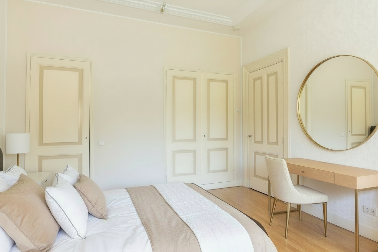 The first floor is accessed via the monumental burgundy staircase. The master bedroom has two balconies, one with a loggia, and fitted wardrobes. The modern bathroom has a walk-in shower, bath, double basins with columns and underfloor electric heating. French doors lead to the roof terrace. A separate cloakroom and second toilet complete this floor.