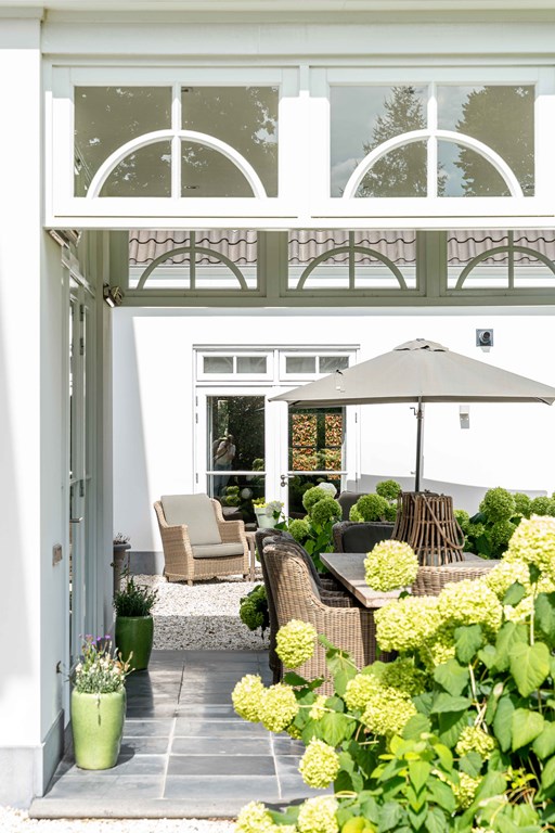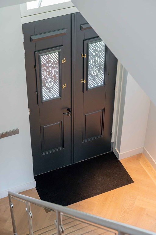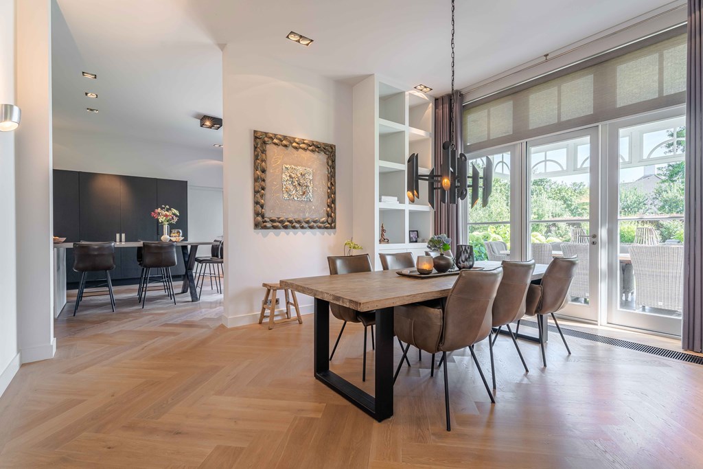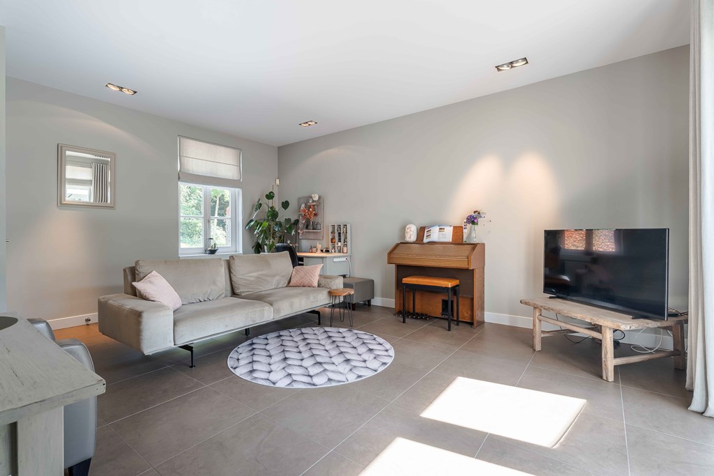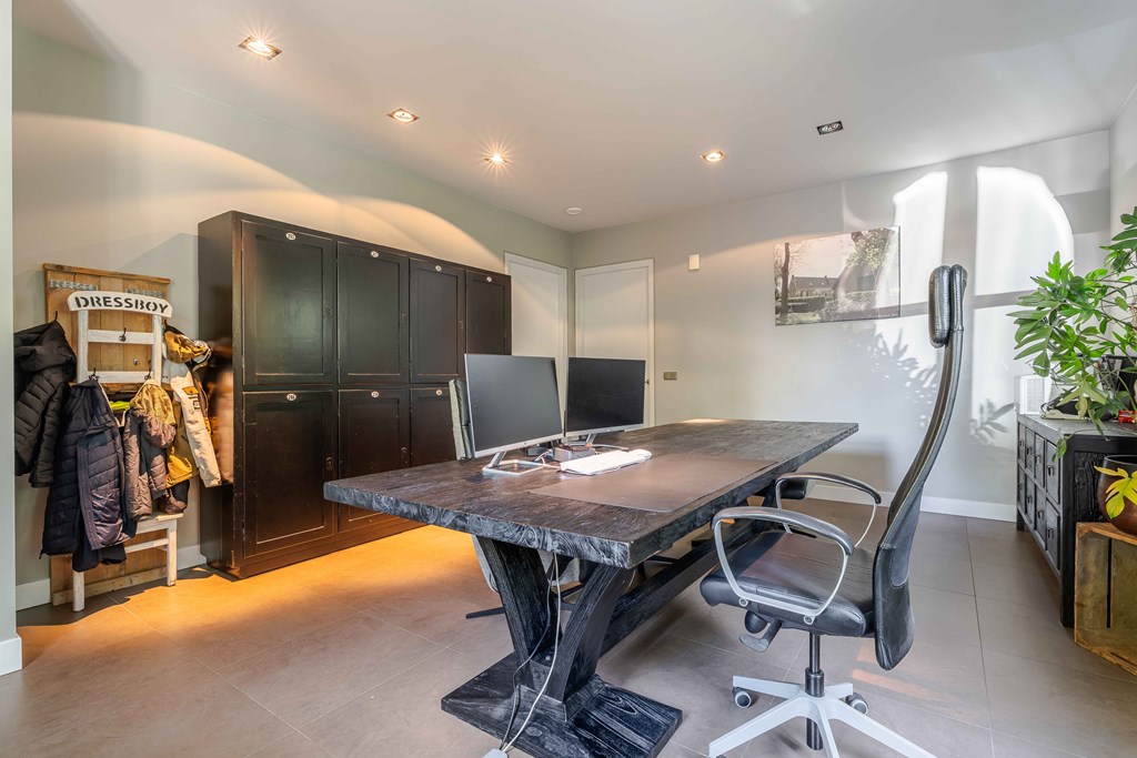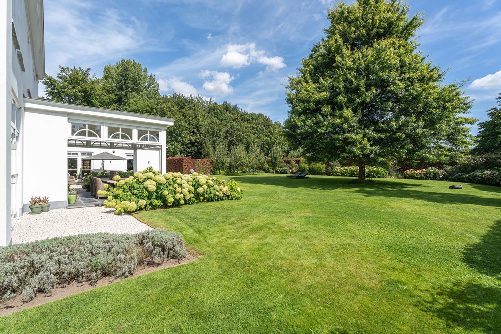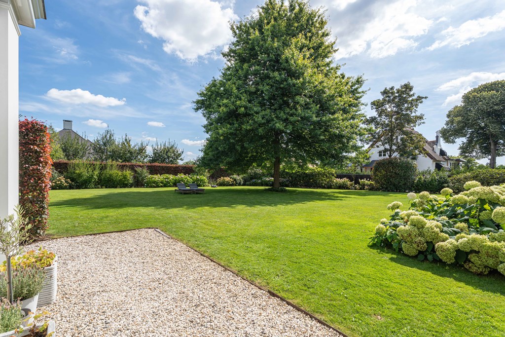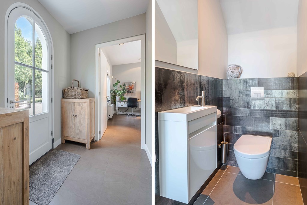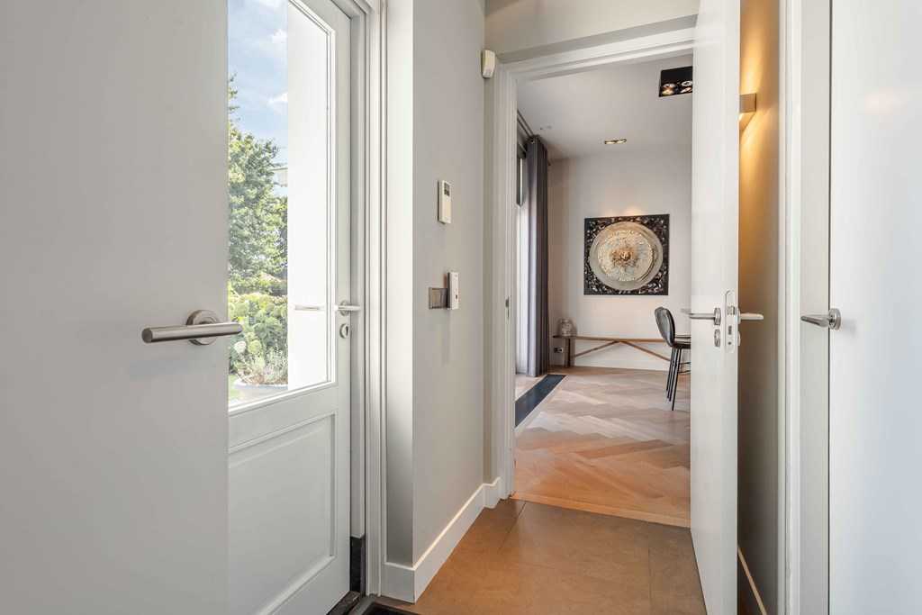 Through the neatly landscaped front garden, you reach the stately entrance of the home. Upon entering, it is immediately clear that careful thought has been given to the sightlines in and around the property. The hallway features a meter cupboard, a guest toilet, a cloakroom, a staircase to the upper floor, and provides access to the living areas.