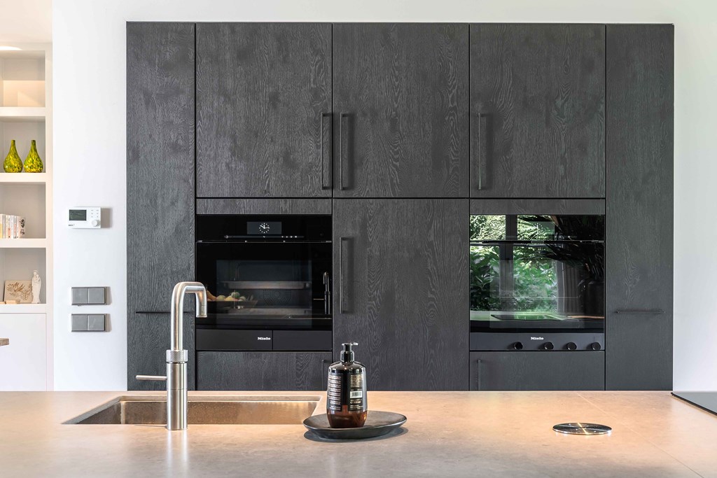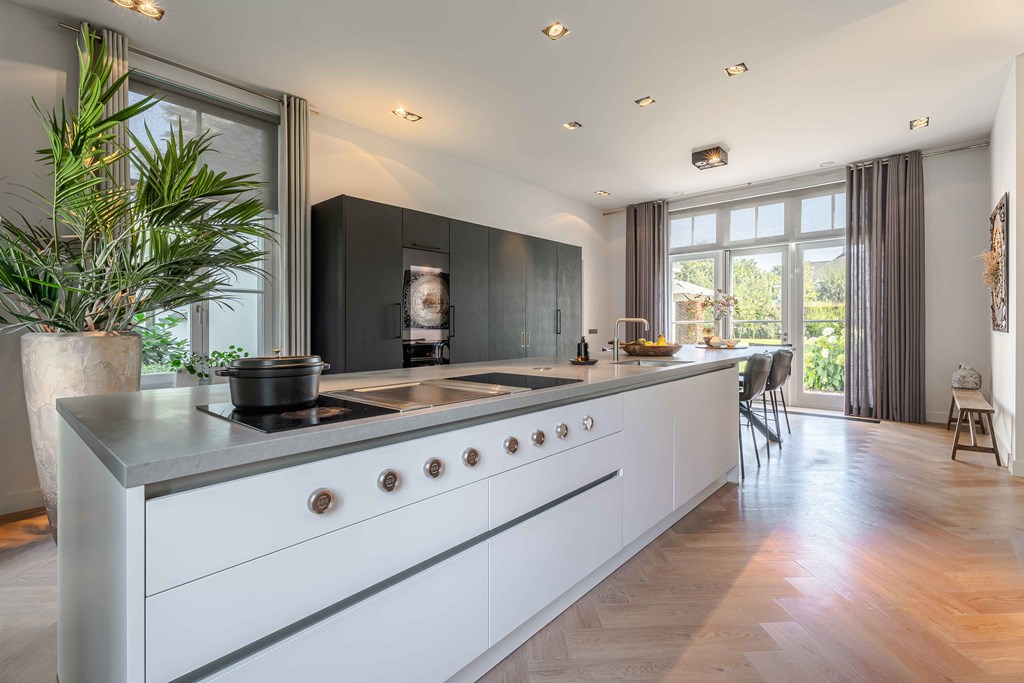 The kitchen is equipped with a modular BORA system with 2 induction hobs, 2 built-in extractors, a teppanyaki plate, a Quooker tap, 2 refrigerators, a freezer, a steam oven, a conventional oven, a dishwasher, and a wine climate cabinet.