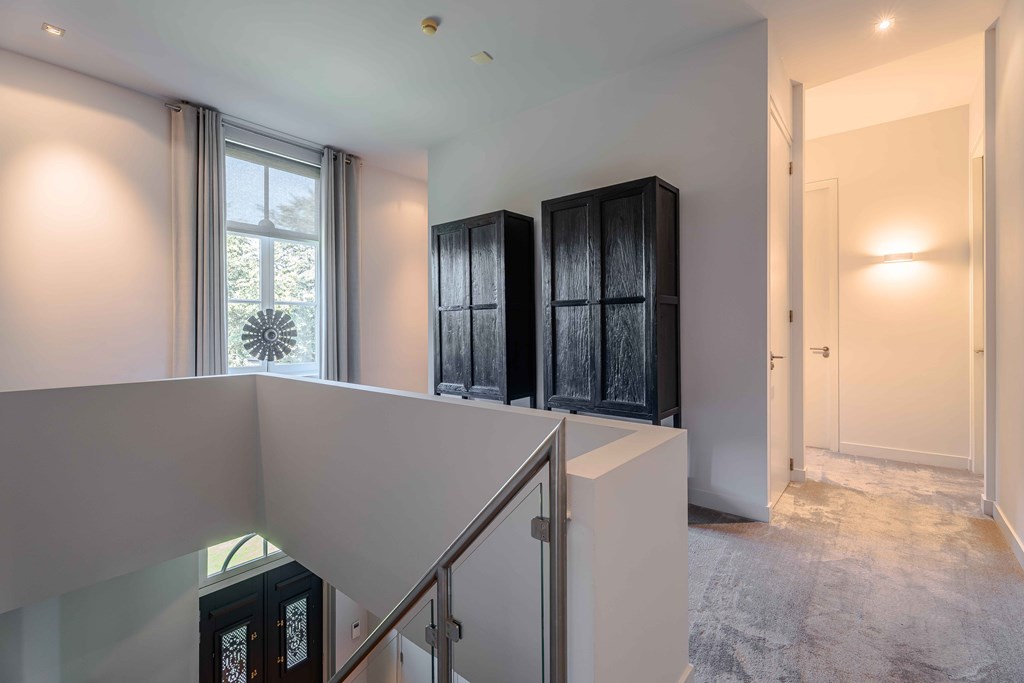 From the main hallway staircase, you reach the landing, bedrooms, and bathrooms on the first floor.