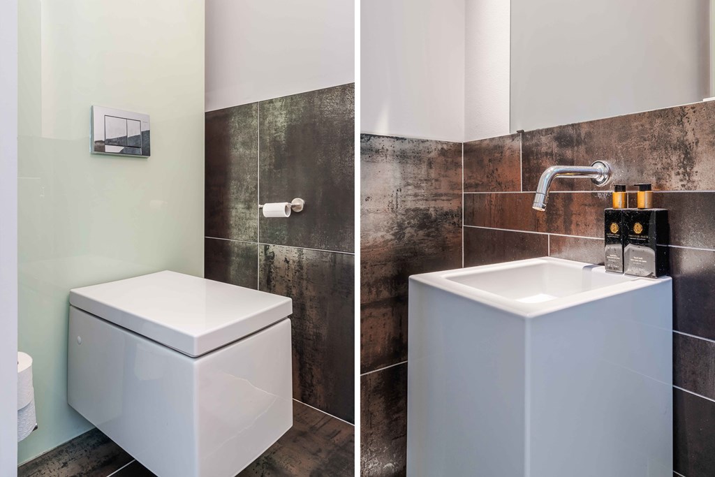 The second bathroom features a wall-mounted toilet, shower, and wide washbasin with vanity. The landing also provides access to an additional separate toilet.