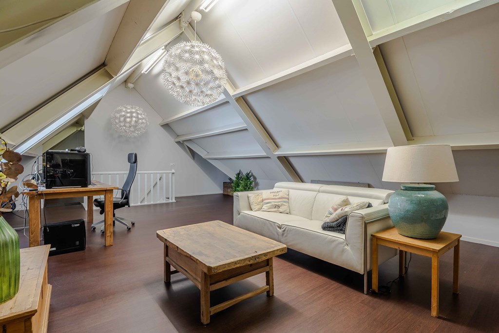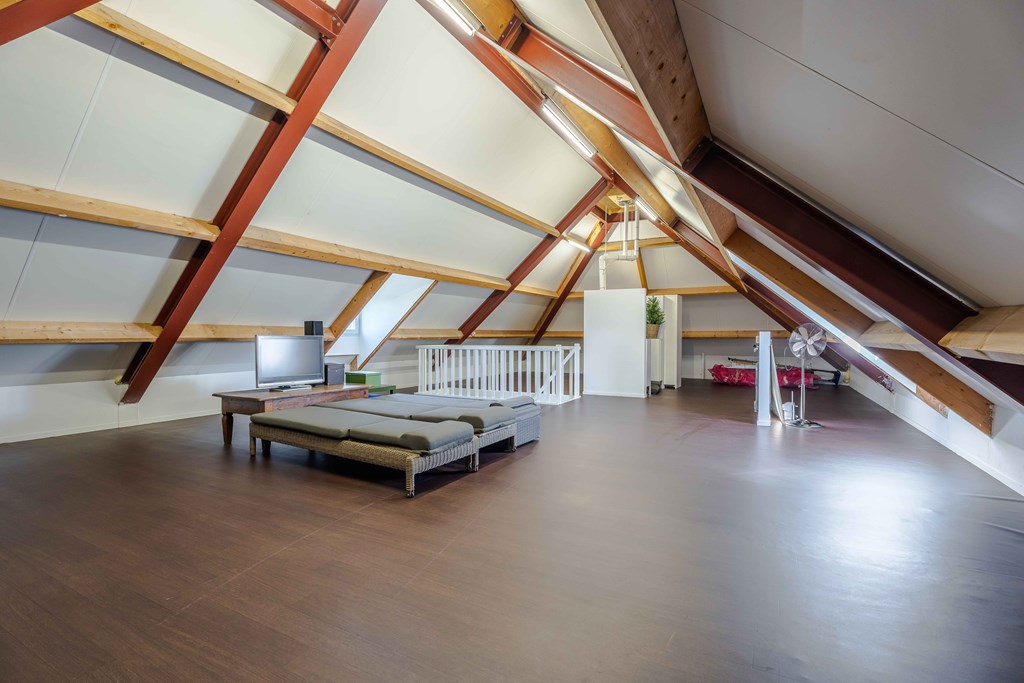 Currently, the attic is set up as one large multifunctional space. It includes connections for a washing machine and houses the central heating system. It is possible to create additional bedrooms here, potentially with a small bathroom.