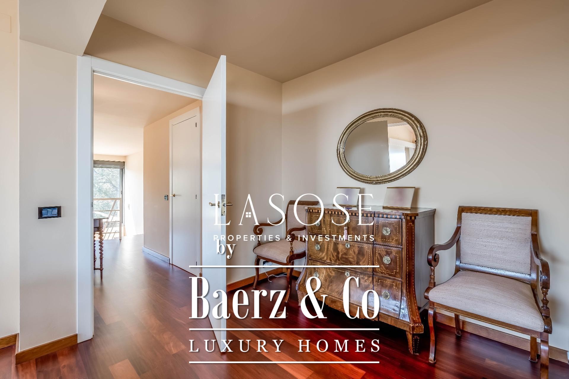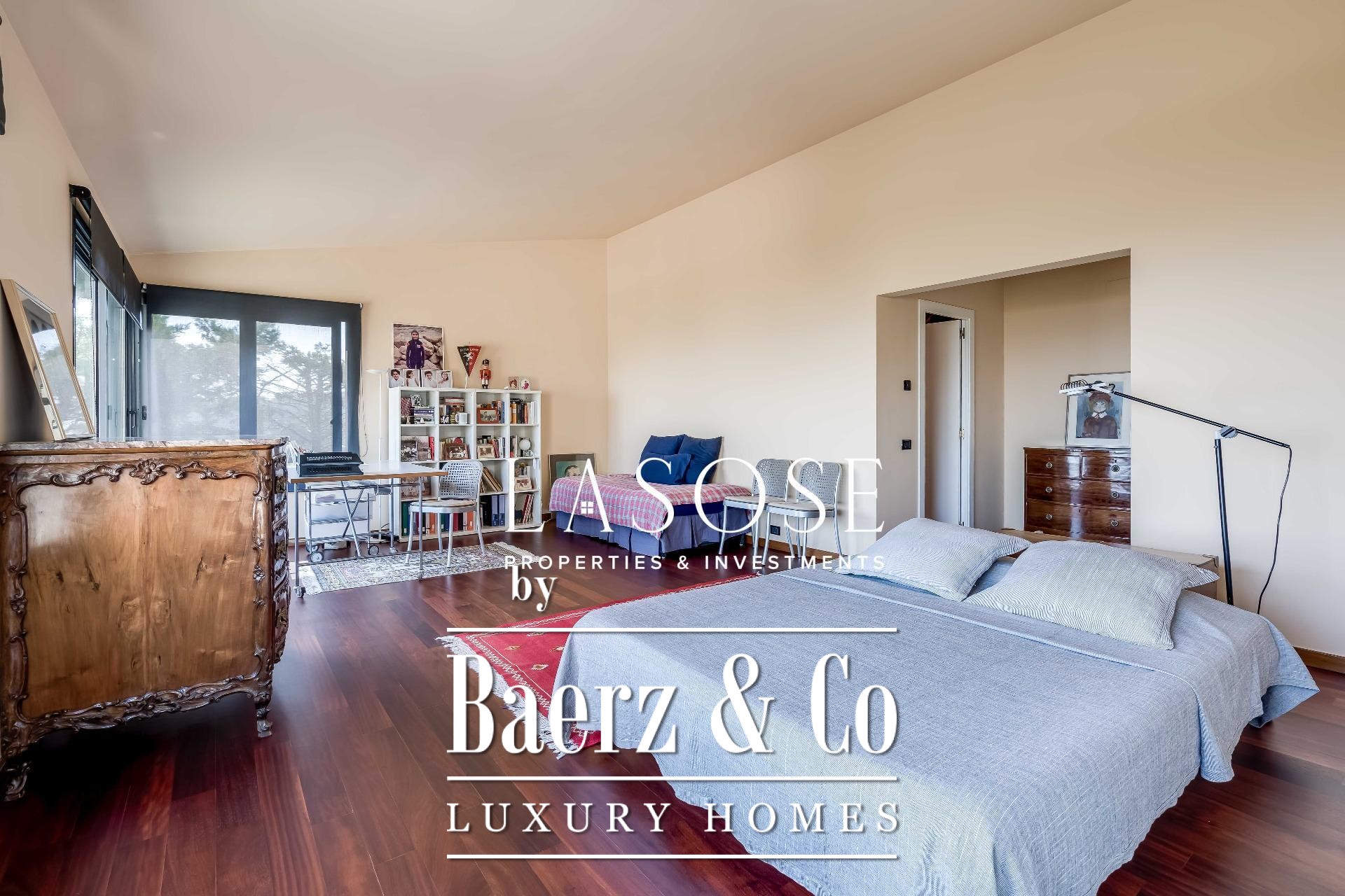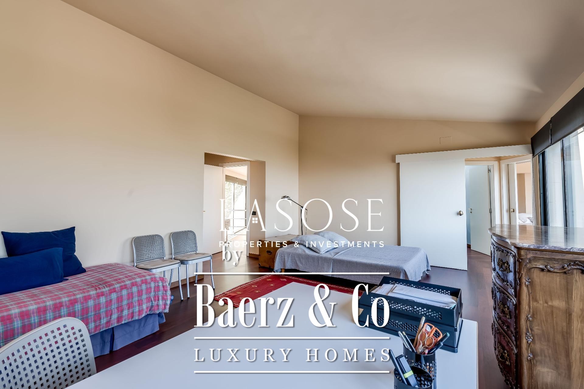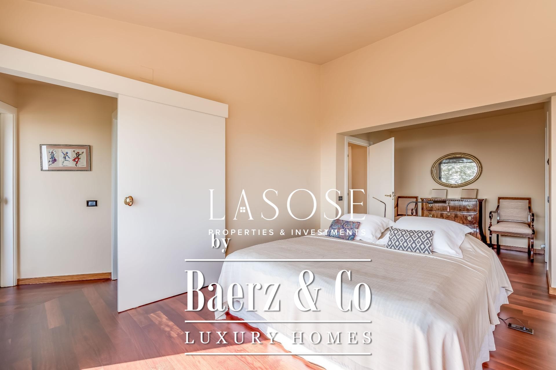 Upstairs, two generous bedrooms are accompanied by a spacious dressing room and a full bathroom. Large windows introduce abundant natural light, paired with parquet underfloor heating for comfort. On the lower floor, a self-contained 115 m² summer apartment includes a dressing room, bathroom, and garden access. Outdoor amenities feature a private pool and landscaped spaces, all within a discreet residential enclave.