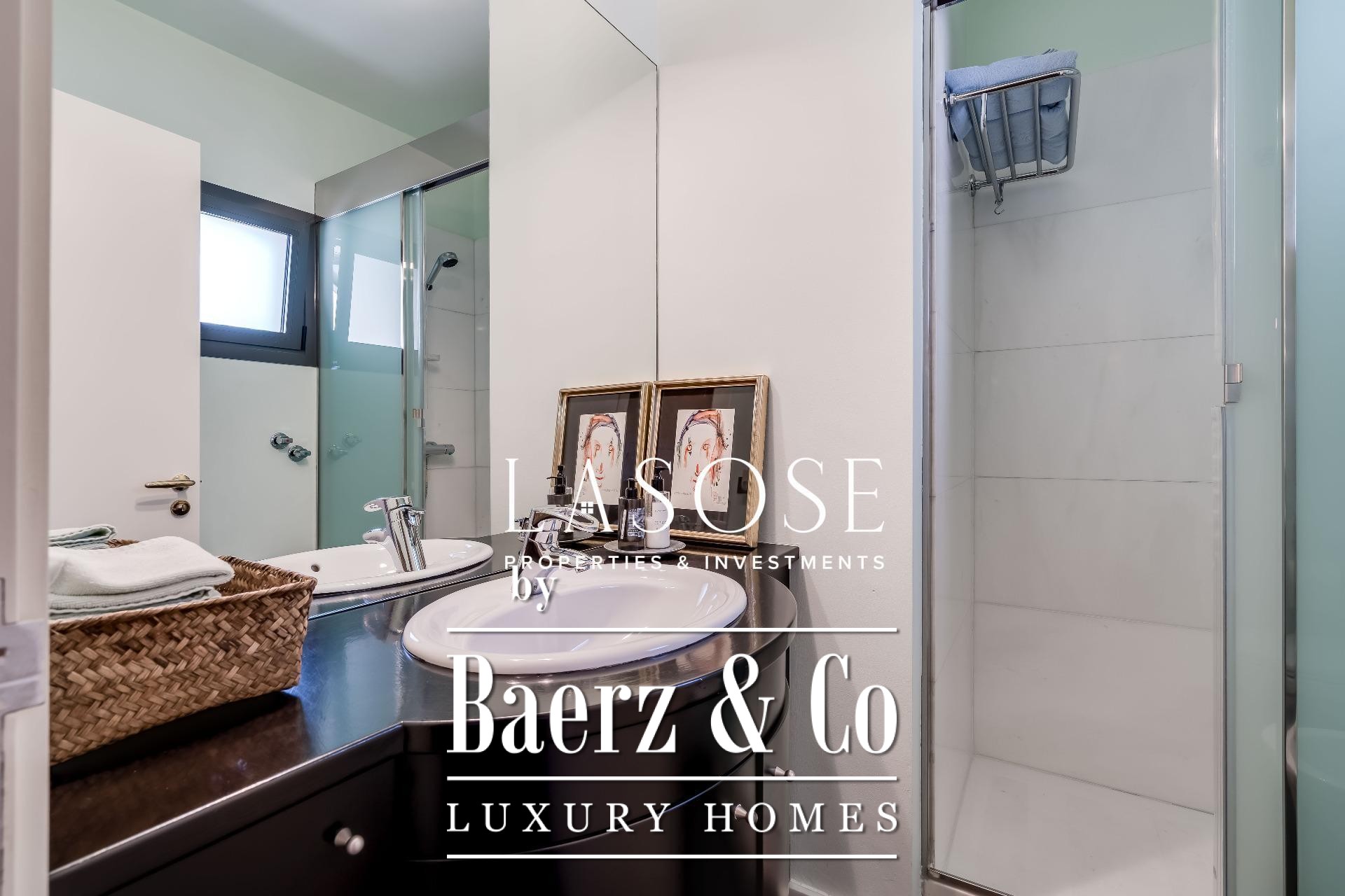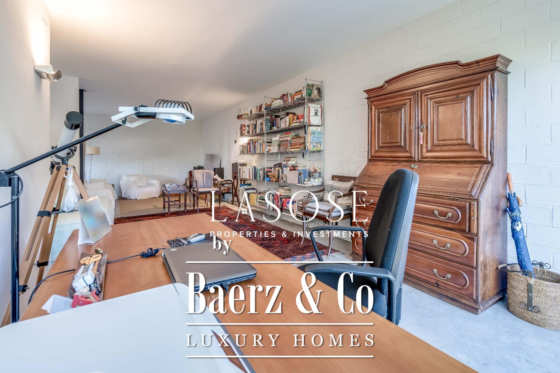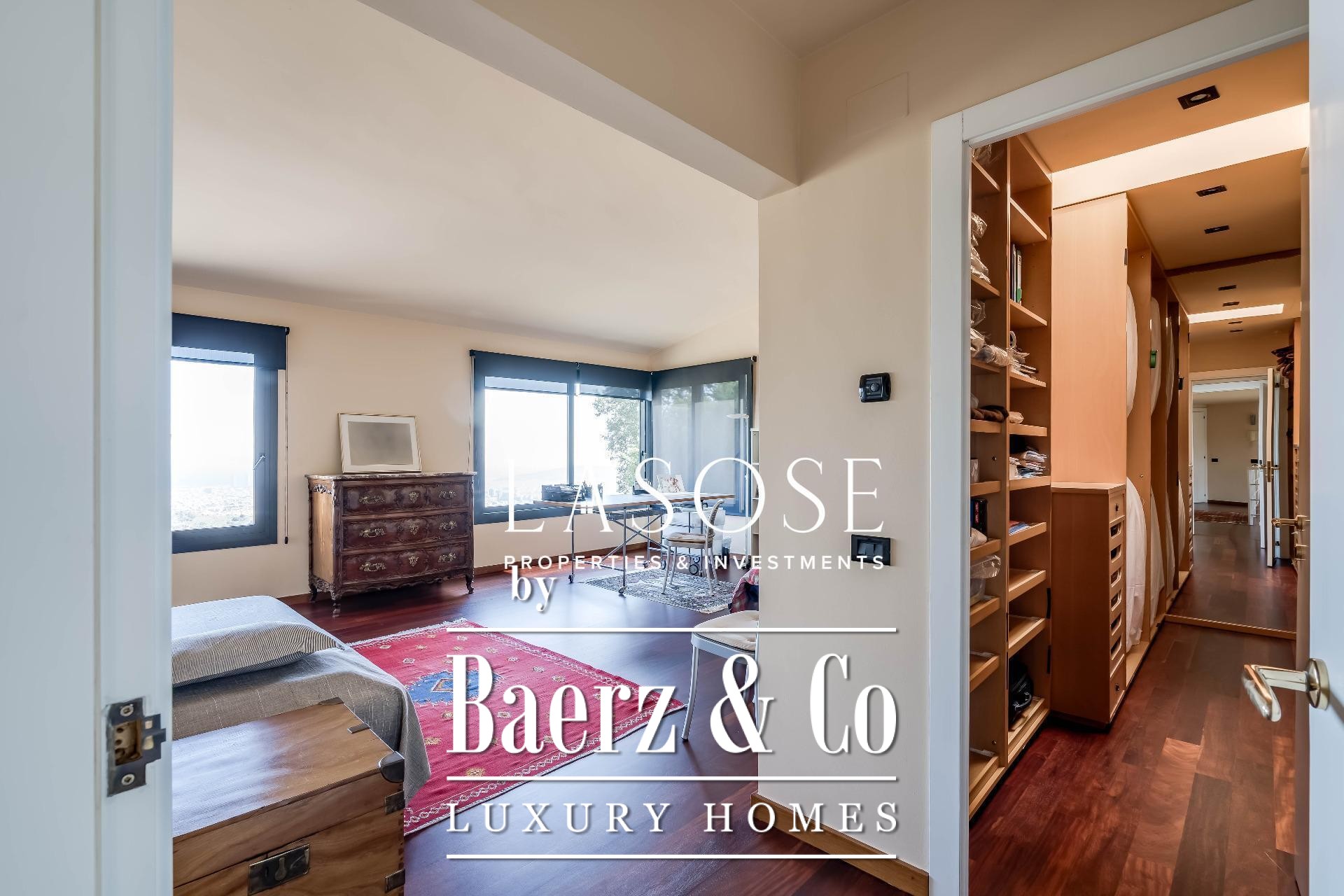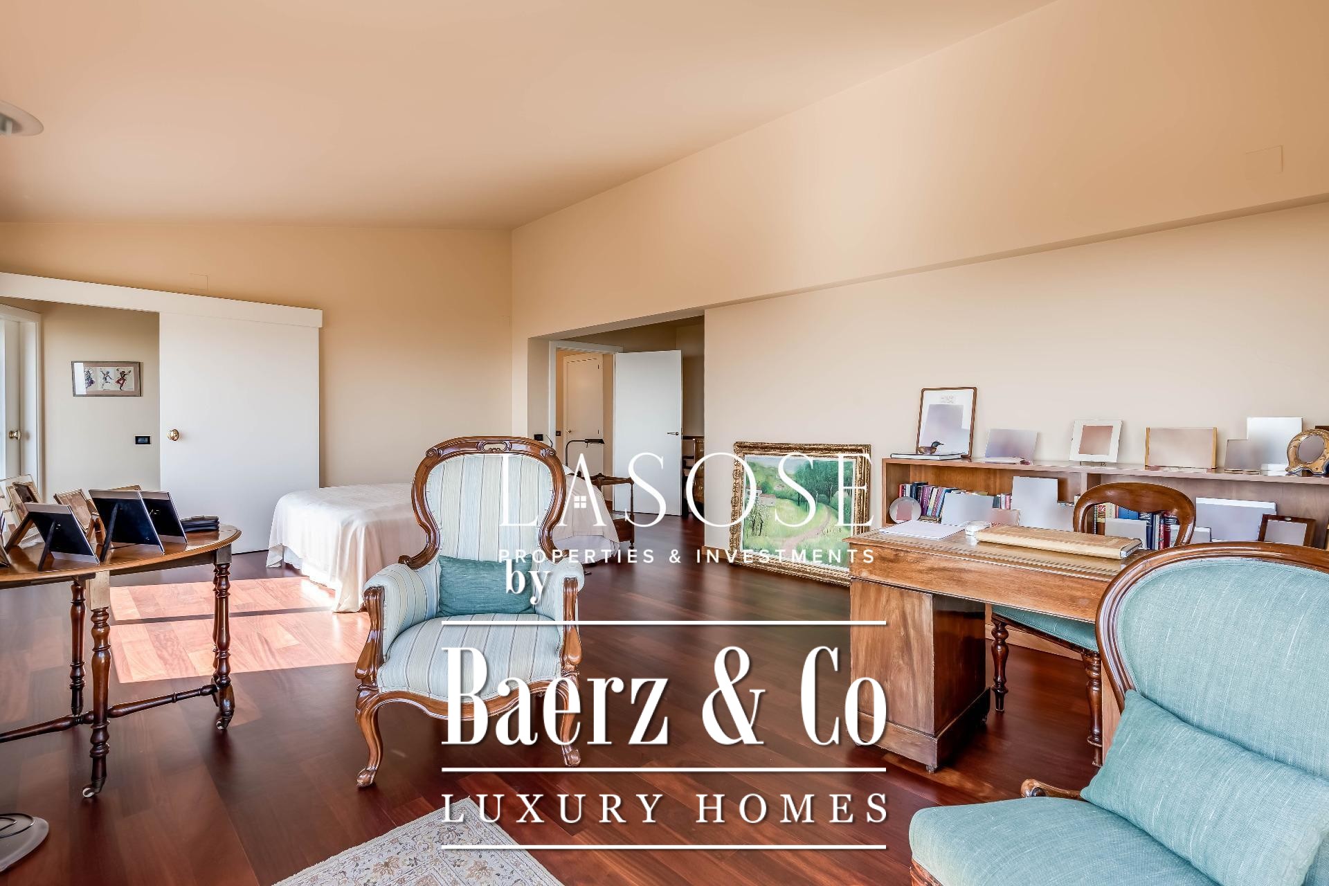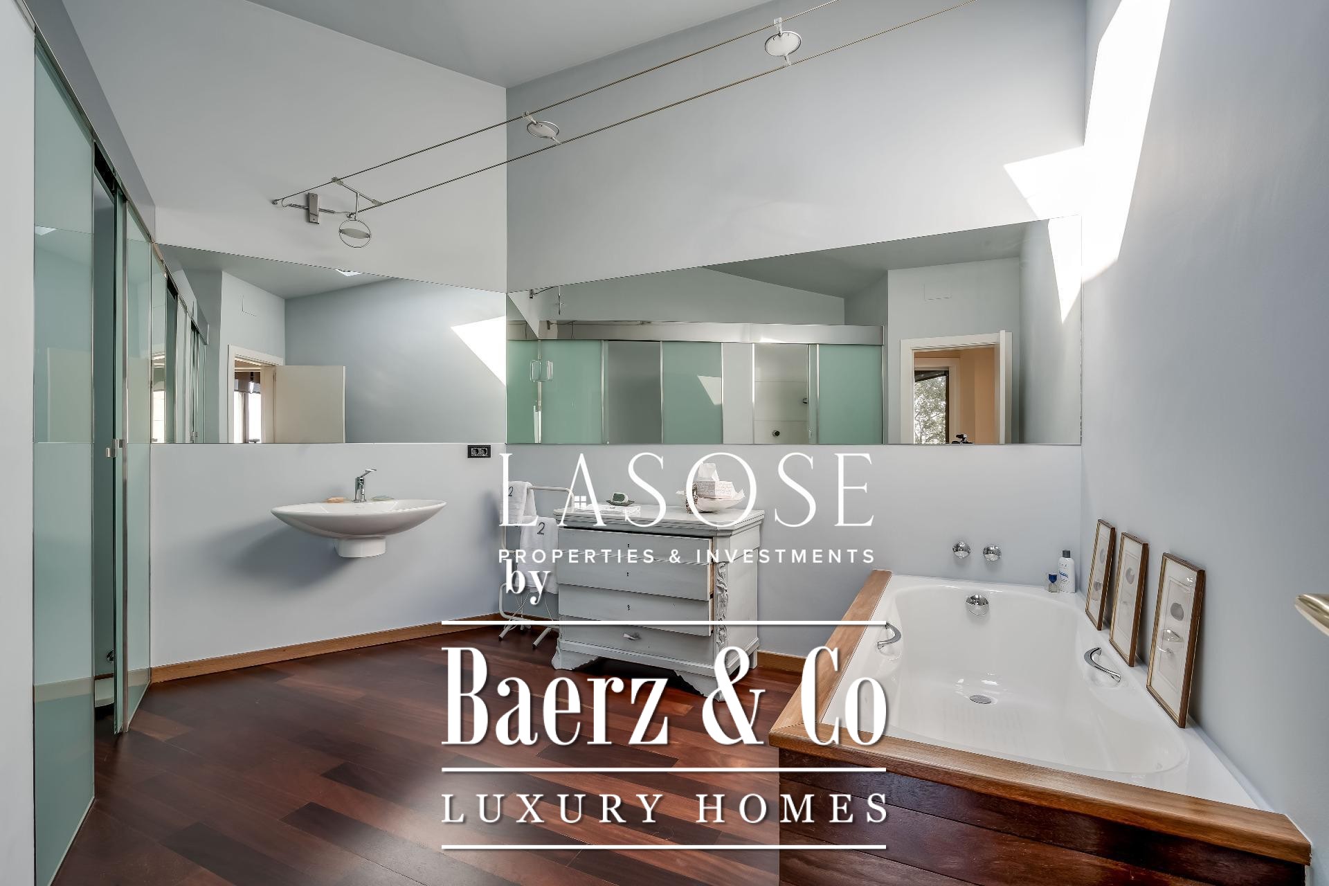 Upstairs, two generous bedrooms are accompanied by a spacious dressing room and a full bathroom. Large windows introduce abundant natural light, paired with parquet underfloor heating for comfort. On the lower floor, a self-contained 115 m² summer apartment includes a dressing room, bathroom, and garden access. Outdoor amenities feature a private pool and landscaped spaces, all within a discreet residential enclave.