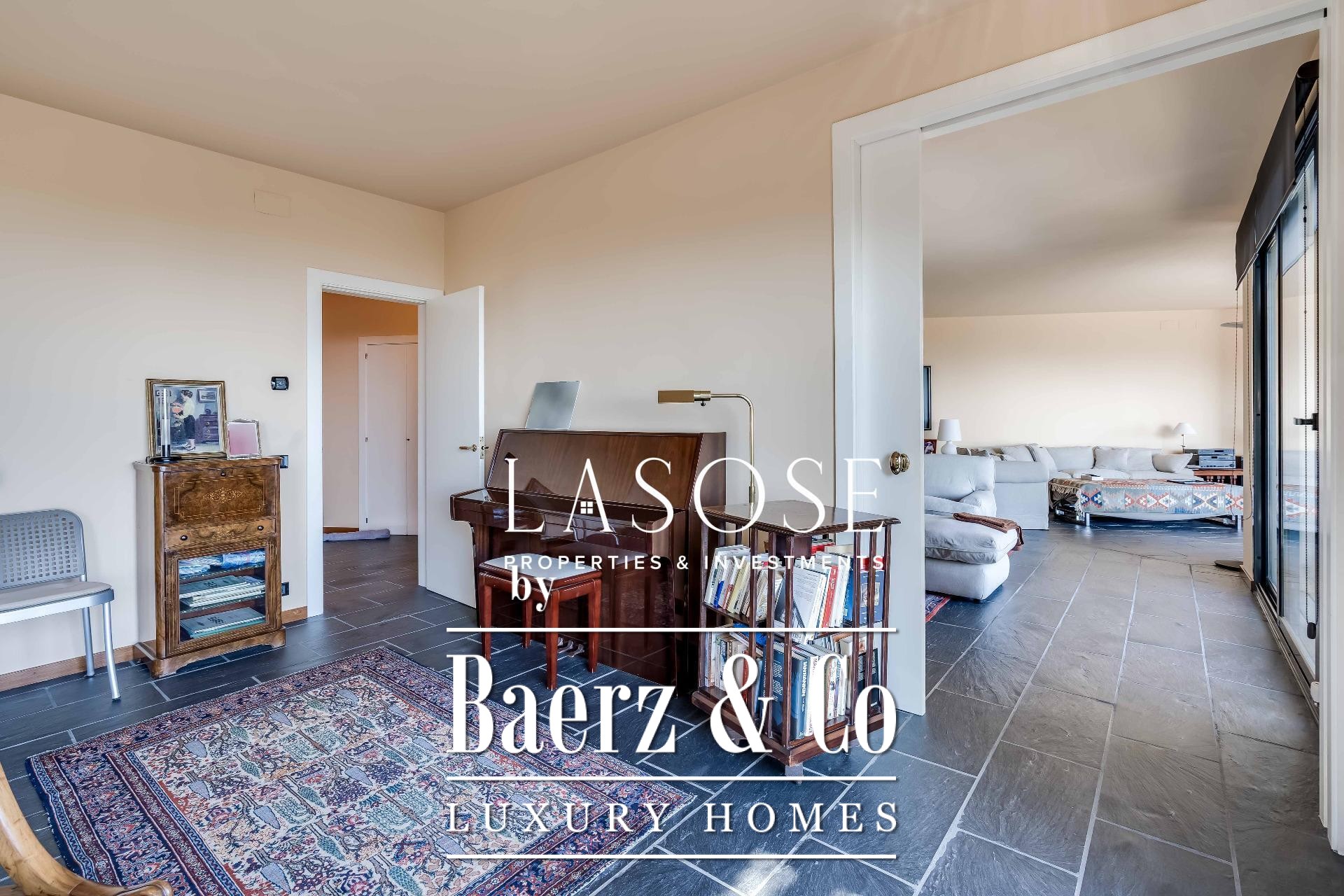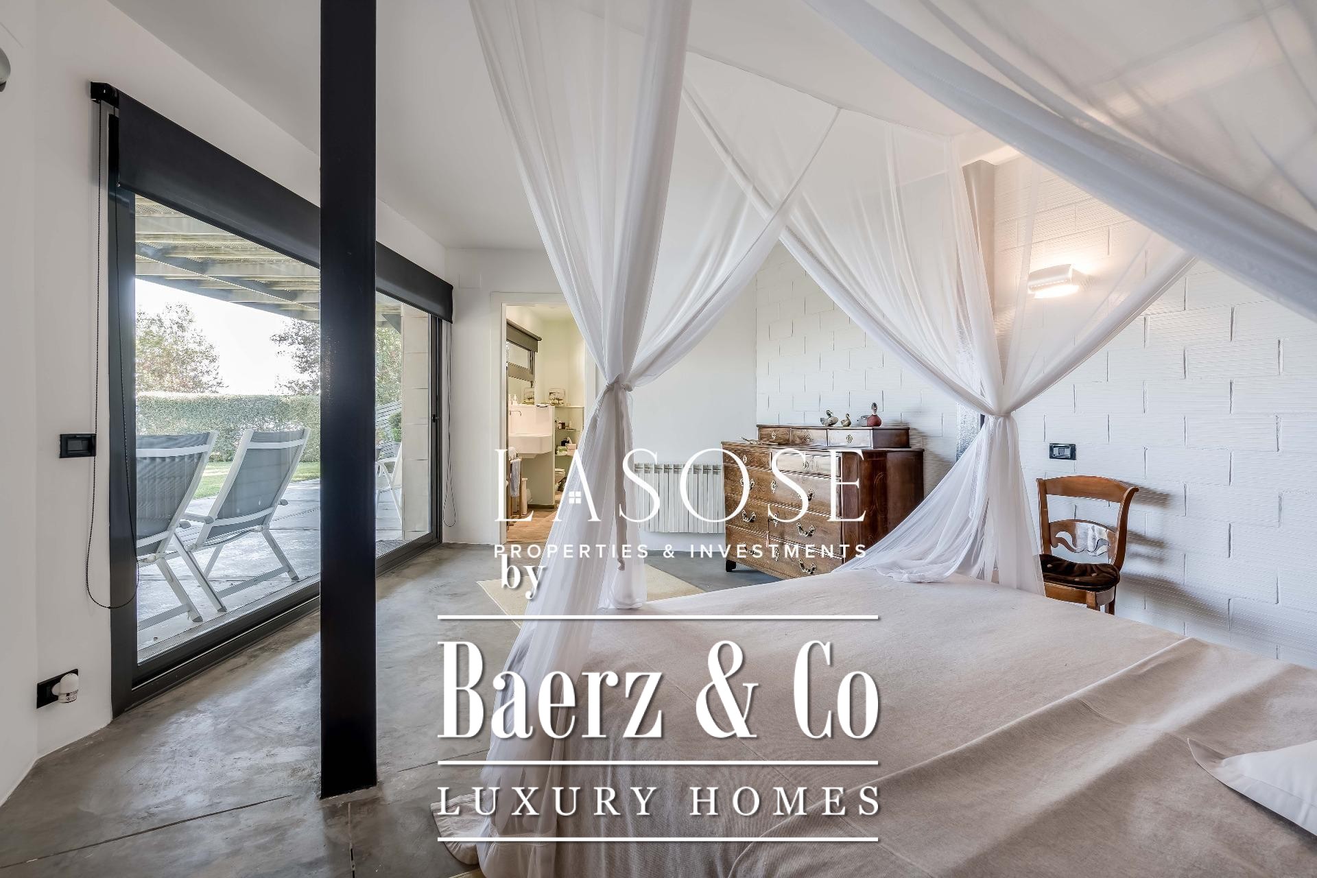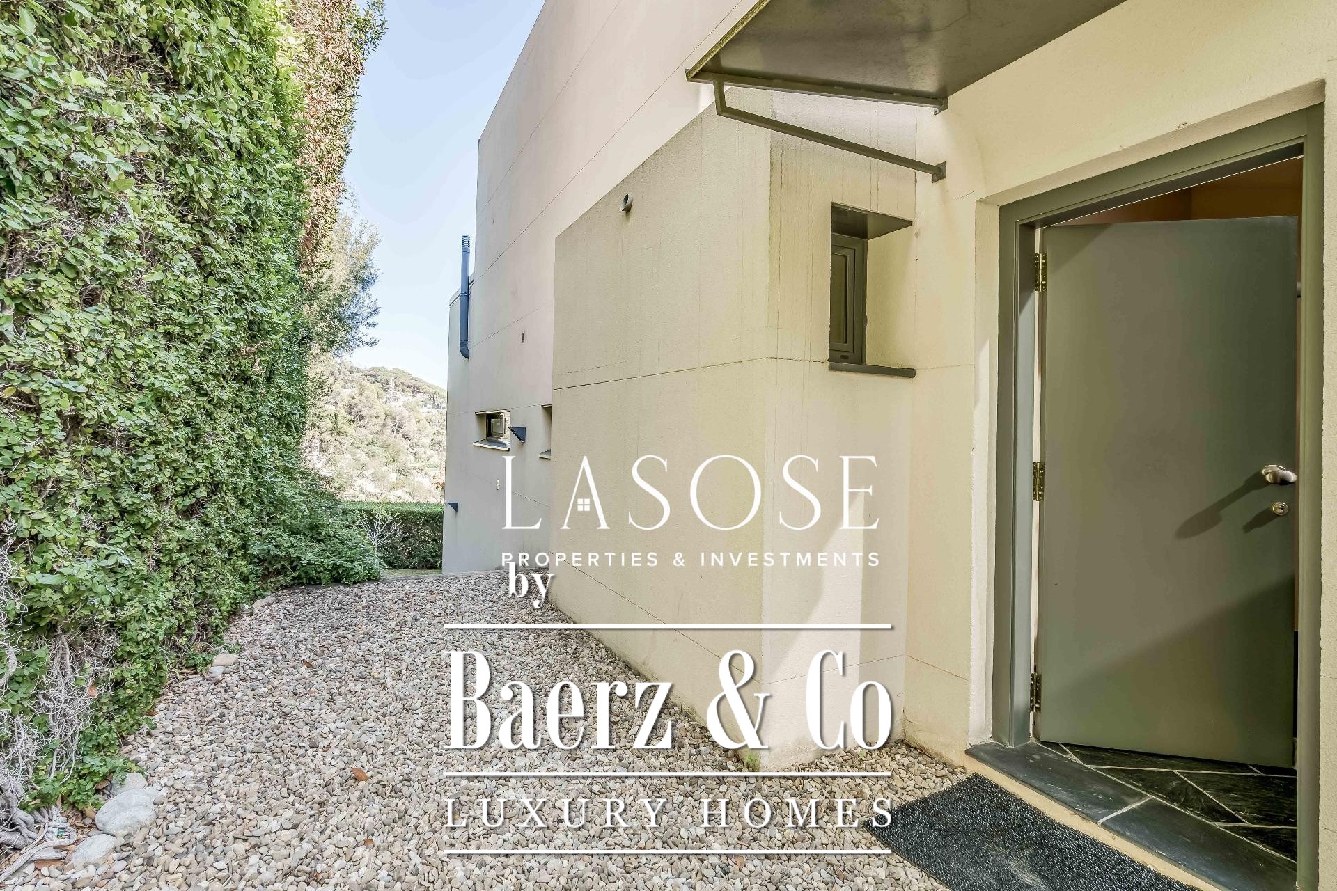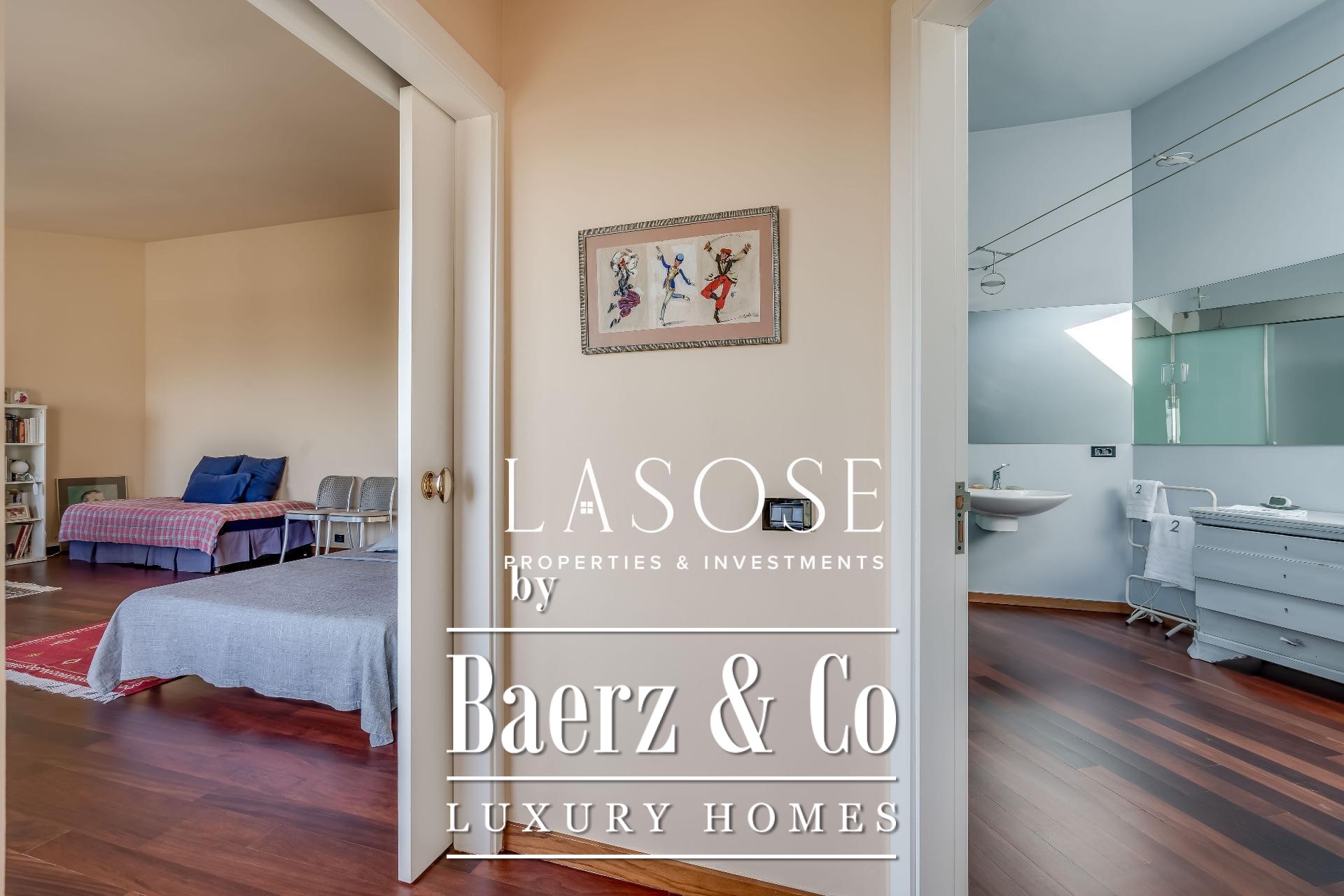 Upstairs, two generous bedrooms are accompanied by a spacious dressing room and a full bathroom. Large windows introduce abundant natural light, paired with parquet underfloor heating for comfort. On the lower floor, a self-contained 115 m² summer apartment includes a dressing room, bathroom, and garden access. Outdoor amenities feature a private pool and landscaped spaces, all within a discreet residential enclave.