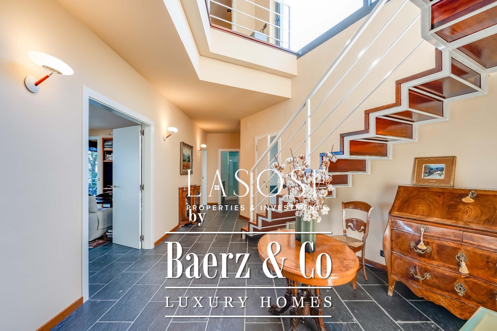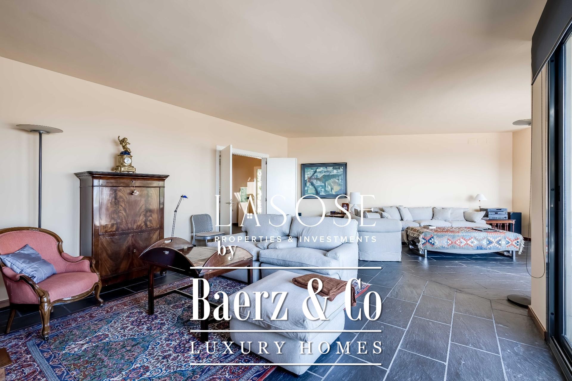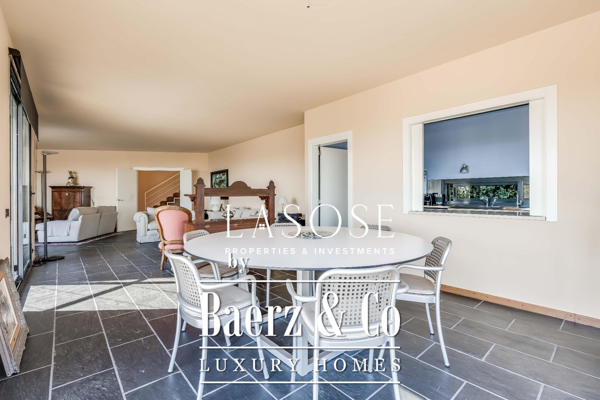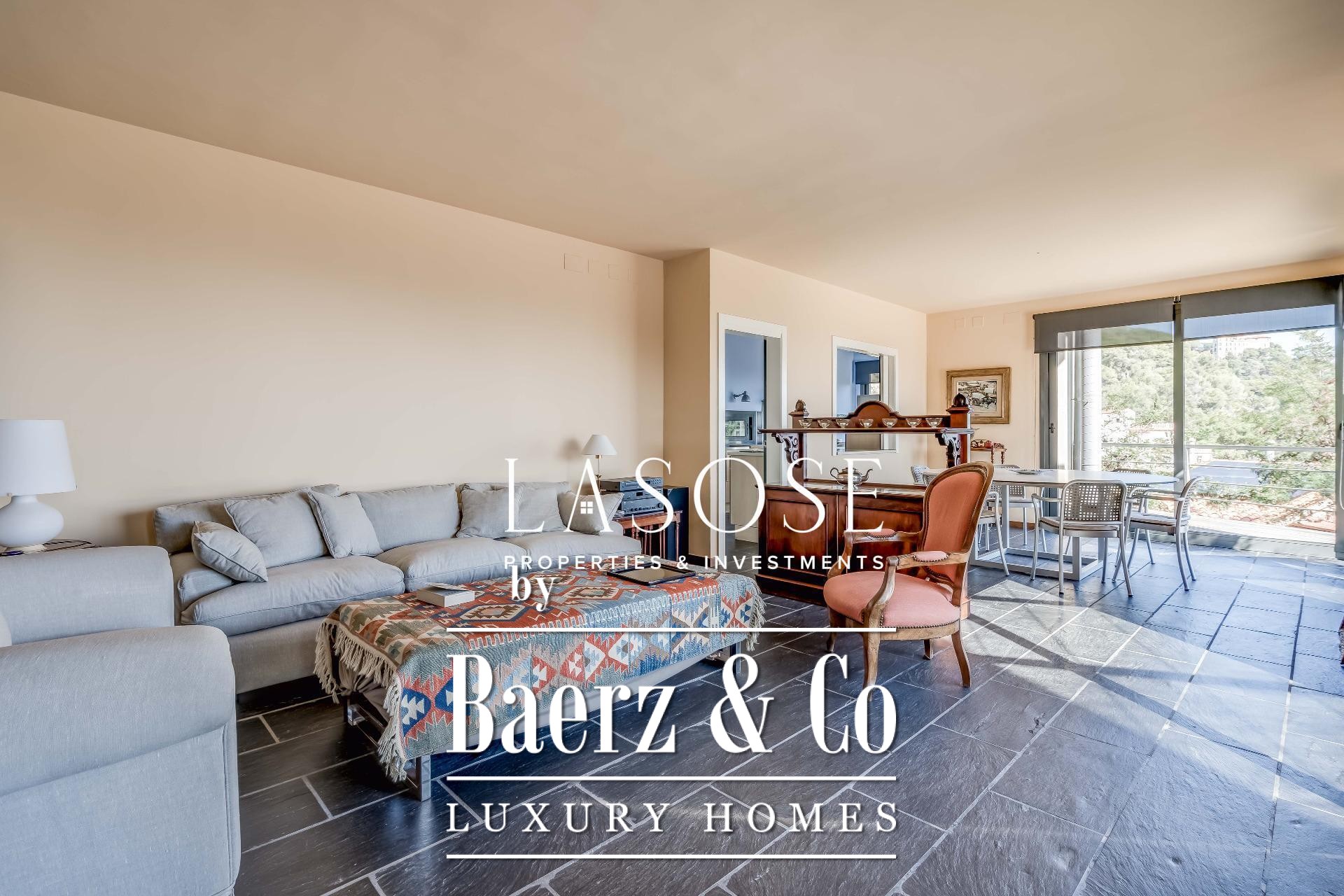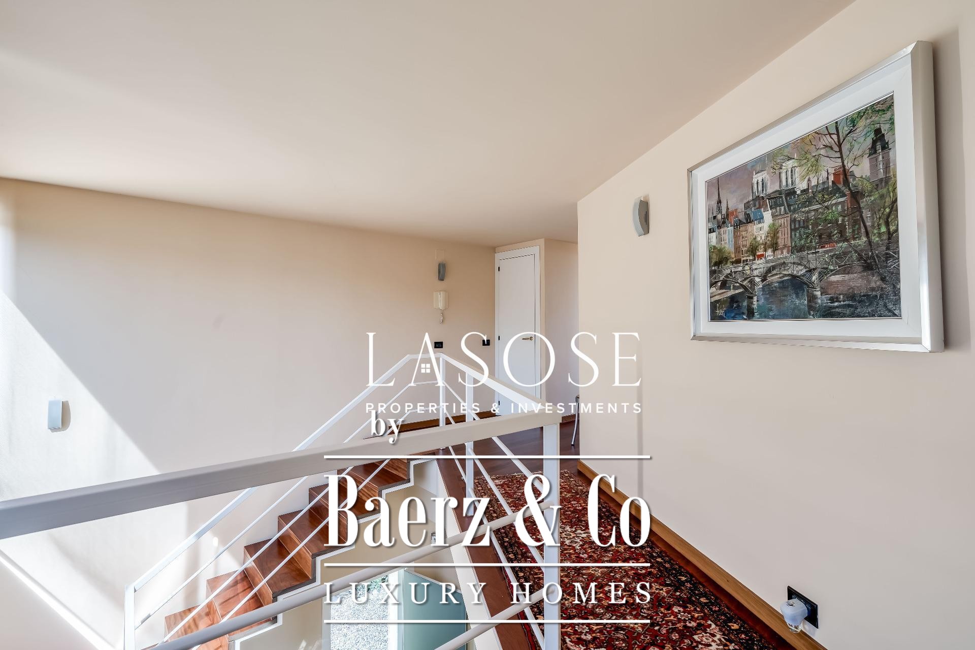Upstairs, two generous bedrooms are accompanied by a spacious dressing room and a full bathroom. Large windows introduce abundant natural light, paired with parquet underfloor heating for comfort. On the lower floor, a self-contained 115 m² summer apartment includes a dressing room, bathroom, and garden access. Outdoor amenities feature a private pool and landscaped spaces, all within a discreet residential enclave.