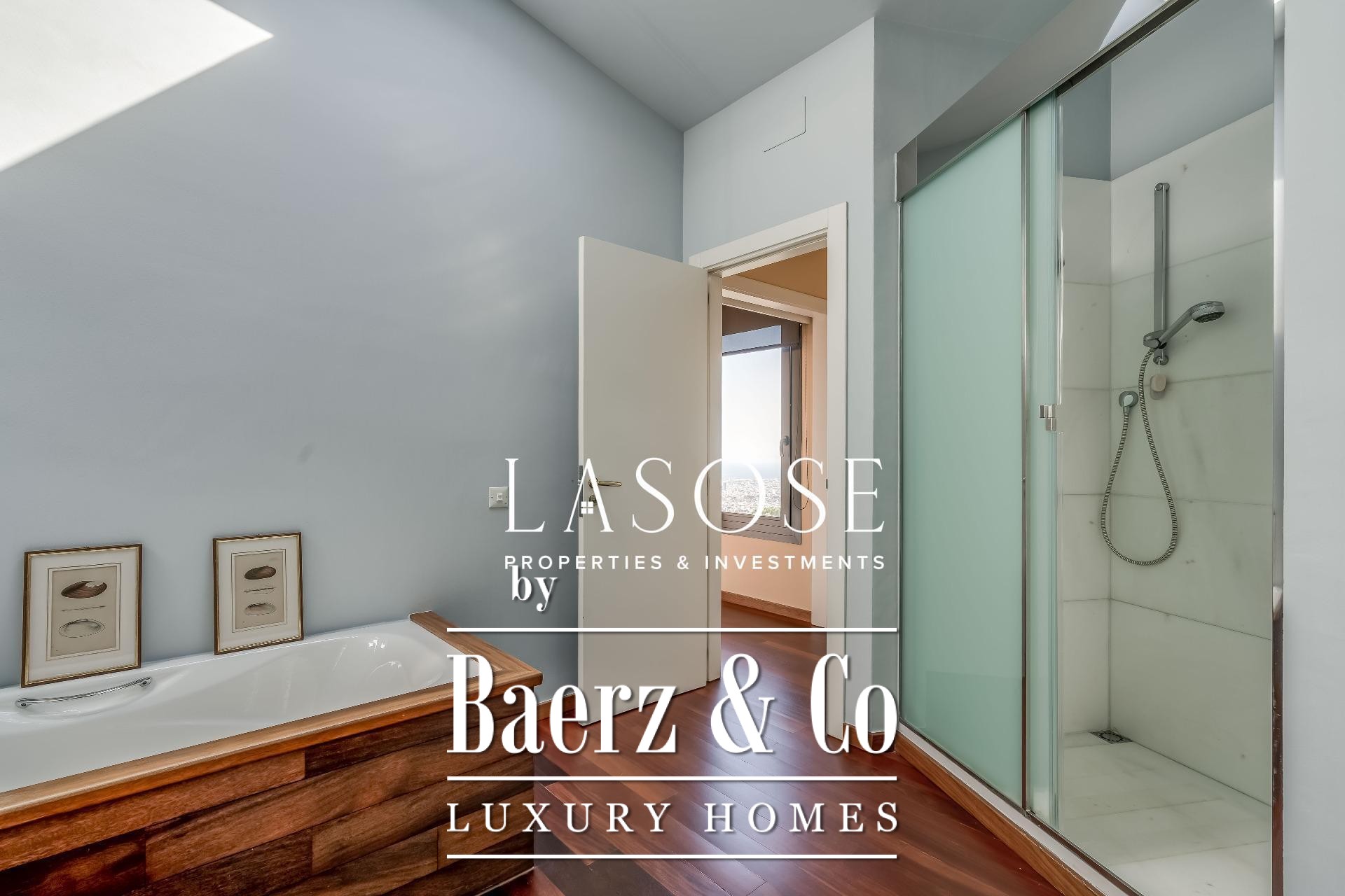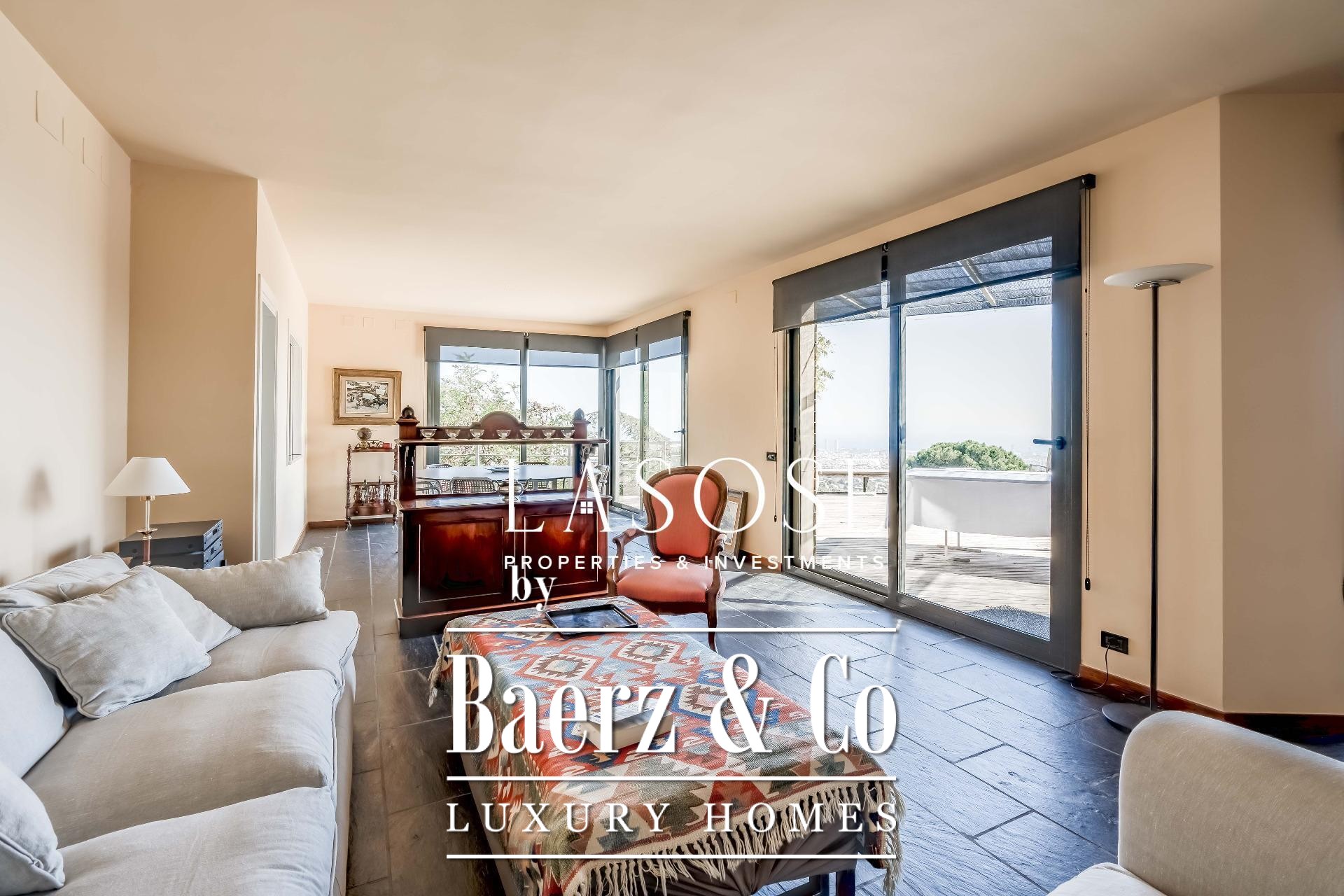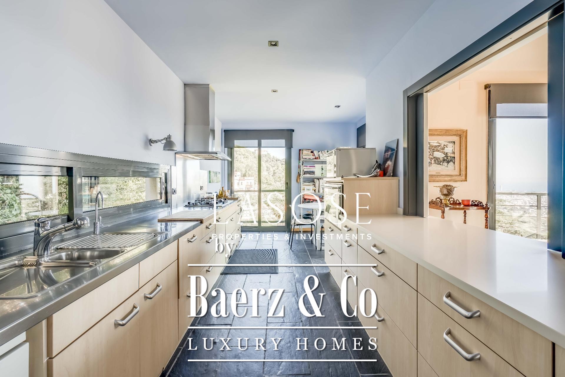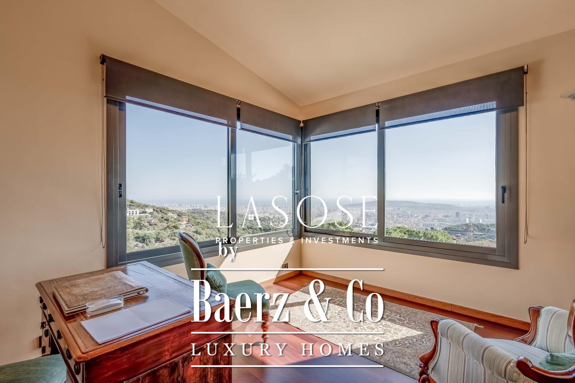 Entering the main floor, an expansive hall leads into an impressive living and dining area. This central space opens out to a 90 m² terrace, framing unobstructed vistas over Barcelona and Collserola Park. The independent kitchen is fully equipped and augmented by a pantry and laundry area with separate entrance, while an adjacent bedroom with bathroom serves flexibly as a guest suite or additional living area. Underfloor slate heating carries throughout the ground level, complemented by direct internal access to a two-car garage.