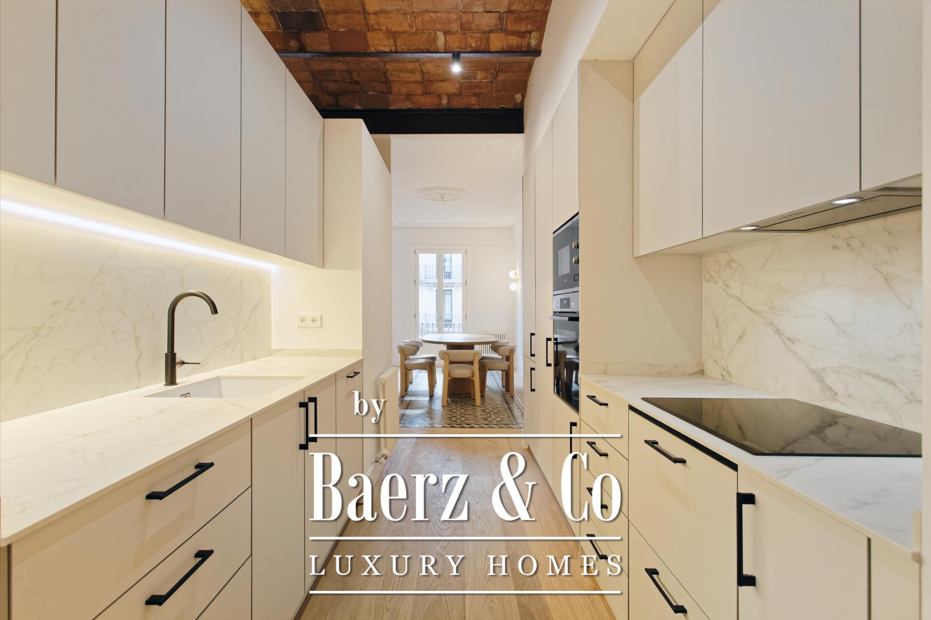 The living and dining spaces are shaped for both comfort and quiet hospitality, unfolding alongside a fully appointed kitchen and a separate laundry room. This carefully renovated apartment retains authentic elements while introducing contemporary finishes and access via elevator, creating an atmosphere of understated, historic Barcelona living.
