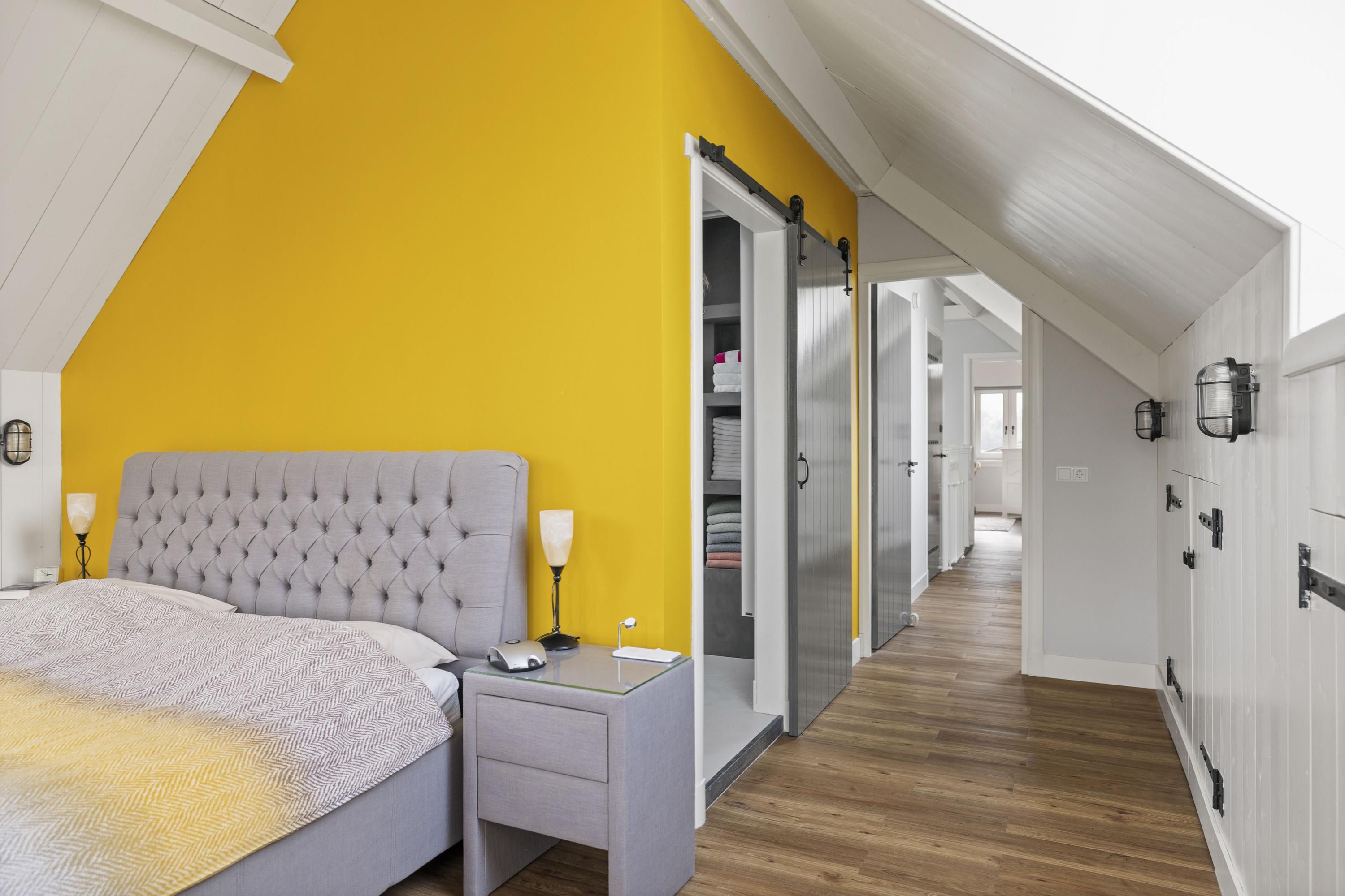 Upstairs is a spacious landing with plenty of storage space and two lovely bedrooms, also with plenty of storage space and each with its own bathroom. The walls with concrete Ciré give the rooms a chic and contemporary look. Both bathrooms have a spacious walk-in shower, toilets with Wisa non-touch flushing system and washbasin (Grohe Sphinx).