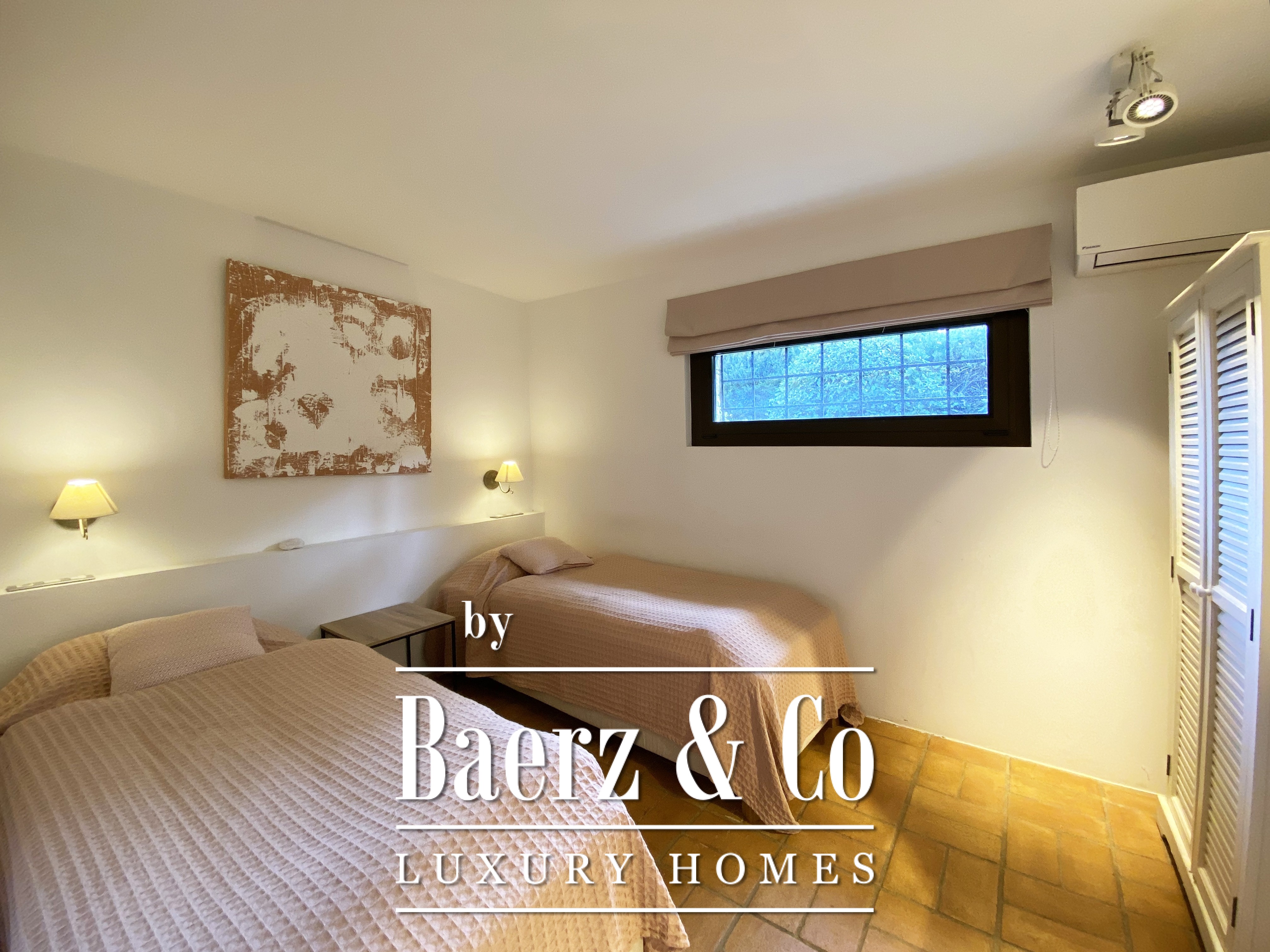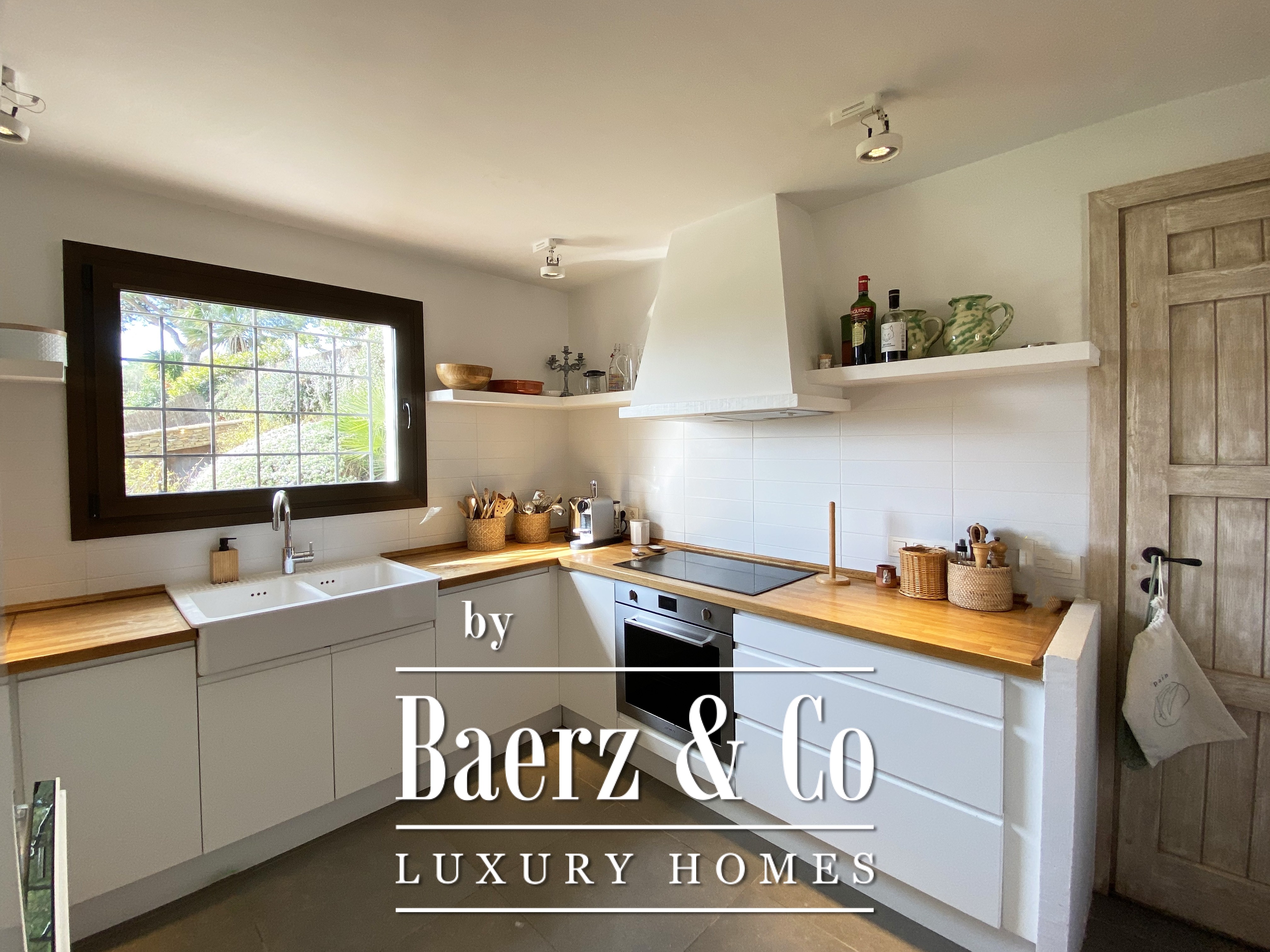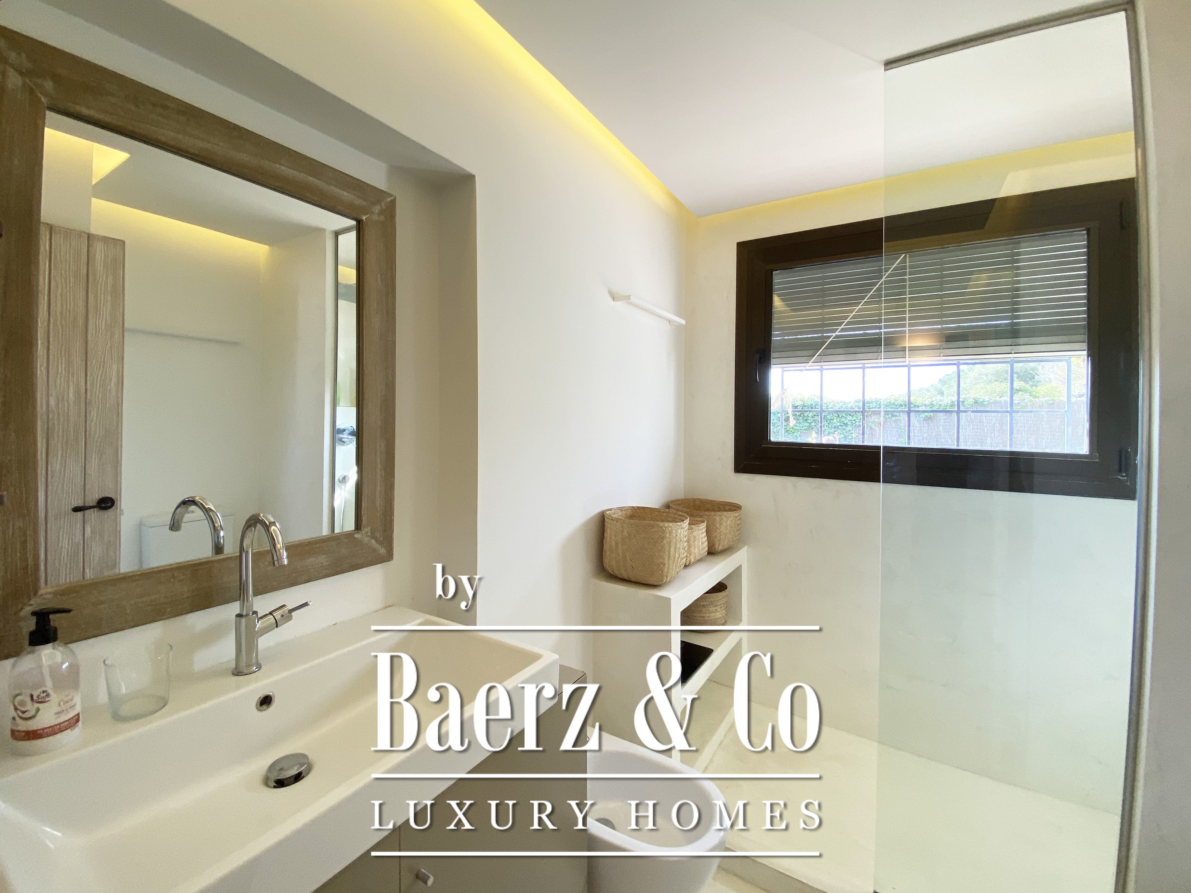 Outside, the meticulously maintained sunny garden frames a spacious swimming pool, ideal for quiet moments or gatherings. Features such as air conditioning, solar heating, and built-in wardrobes complement the serene setting. This contemporary villa in Begur offers subtle luxury and privacy against a backdrop of nature.