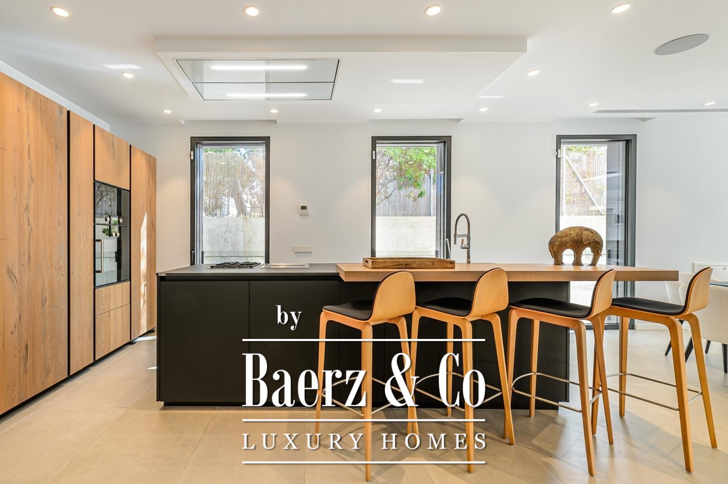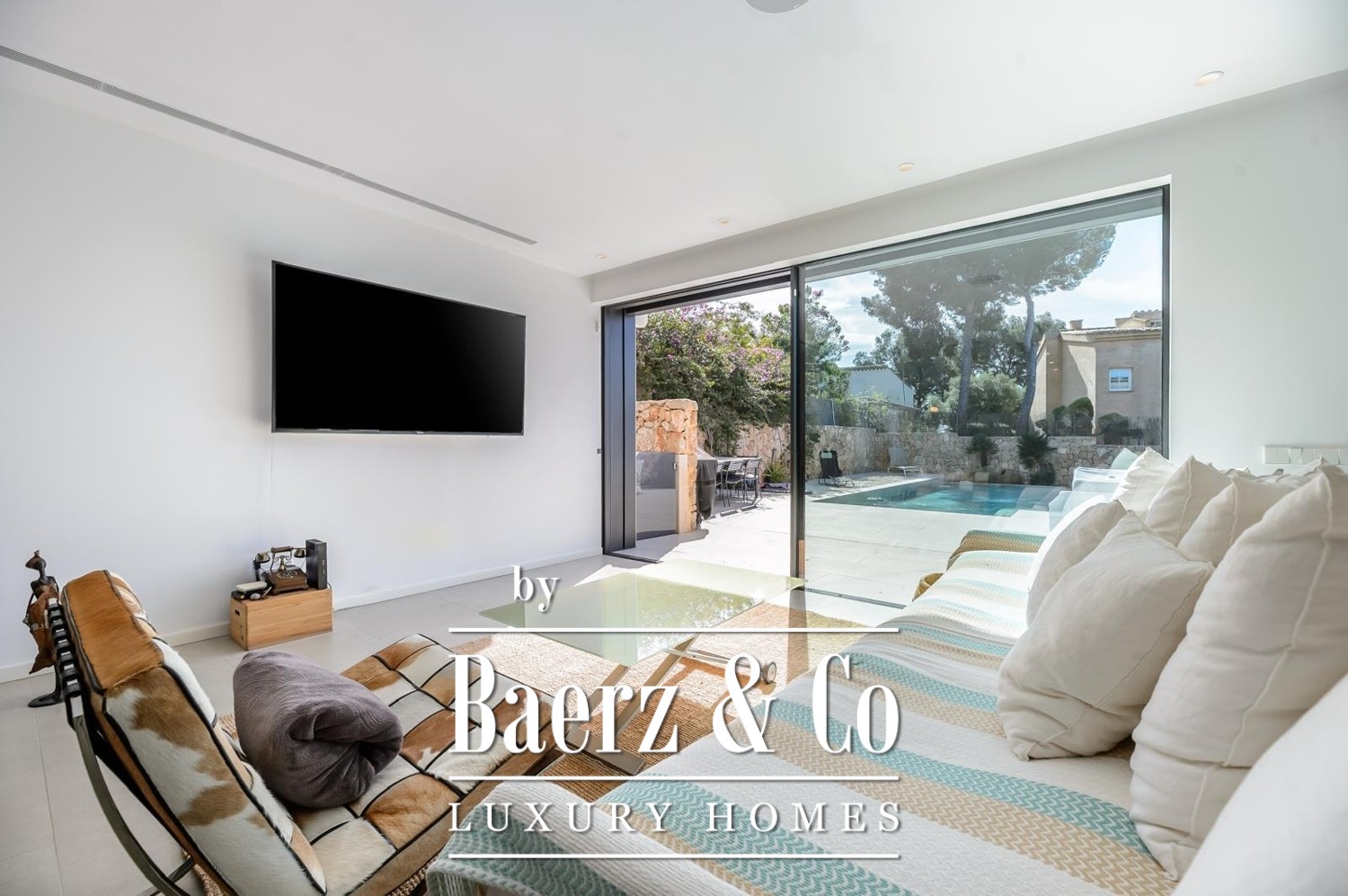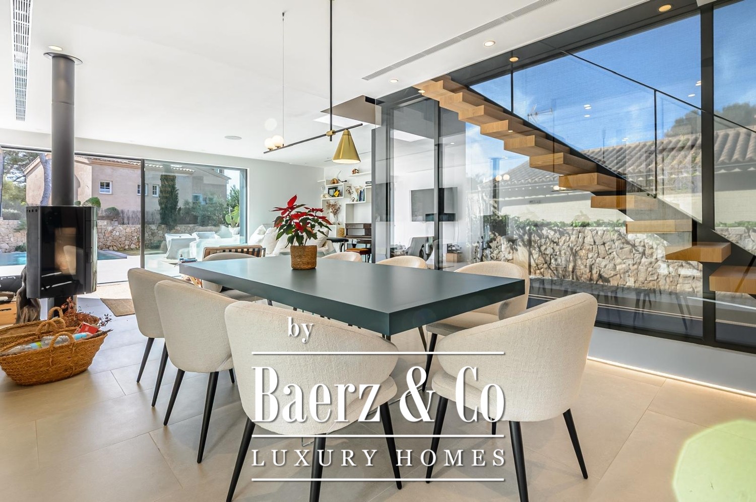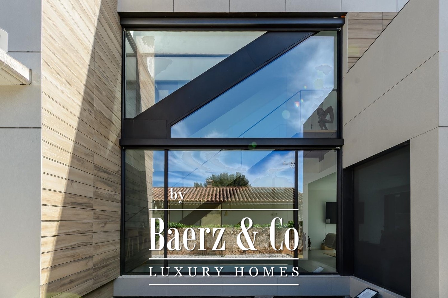 This luxury villa Bendinat is positioned above the coastline in the highly sought-after enclave of Old Bendinat, offering a contemporary retreat shaped by Mediterranean light and understated elegance. The property extends across 340 m², set on a 455 m² plot, with architecture that carefully layers natural stone and expanses of glass, creating a seamless relationship between indoors and out. Designed over two levels with southeast orientation, the home captures abundant sunlight and sweeping sea views. Floor-to-ceiling windows surround an open-plan space that brings together a sophisticated kitchen with central island, dining zone, and relaxing living area, all opening to a sun-washed terrace and saltwater infinity pool fitted with a counter-current system.