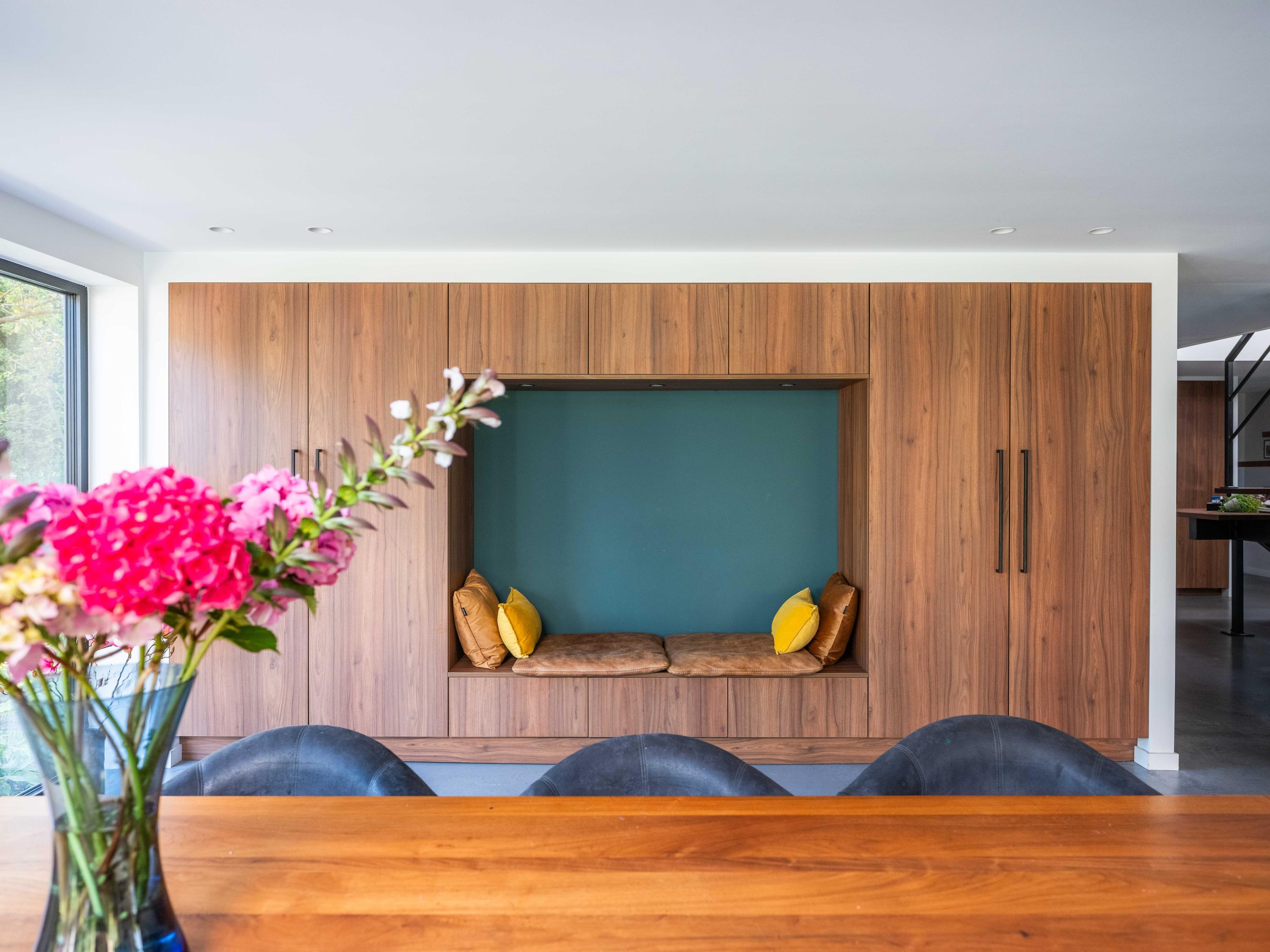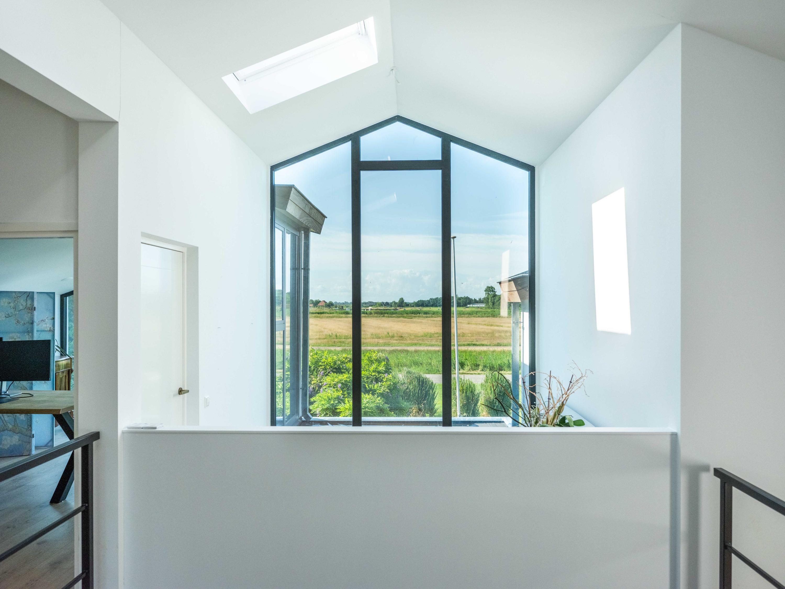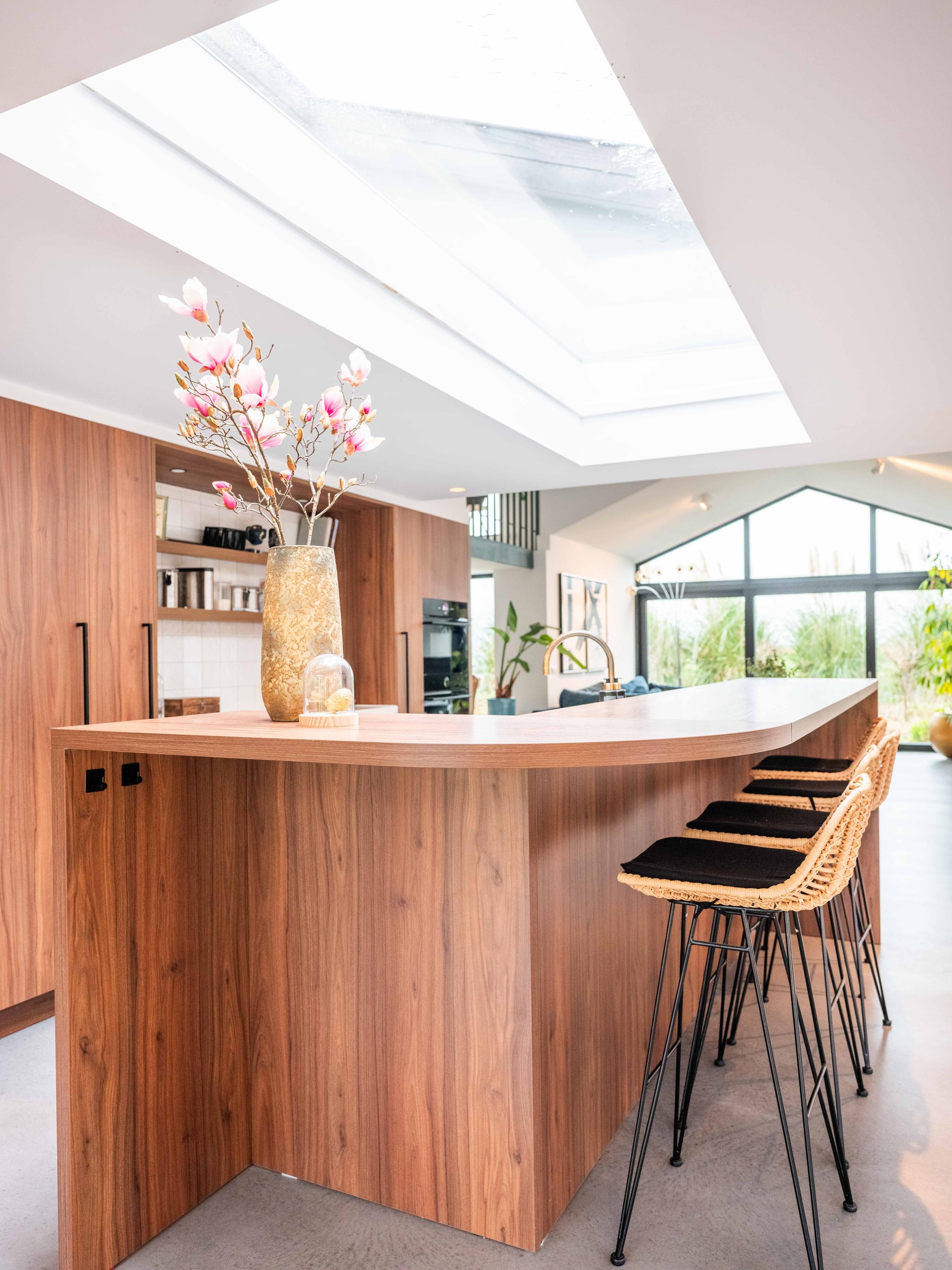 The custom-made kitchen in rich walnut is a dream for any cooking enthusiast. Fully equipped with high-end appliances, including a luxury wine climate cabinet, it also features an architectural highlight: a walnut wall with a hidden door, revealing a spacious utility room behind it. The front-facing living room offers a cozy reading or play corner with panoramic views of the polder, while the rear-facing dining area is bright and airy with large skylights, custom cabinets, and French doors opening onto the garden.