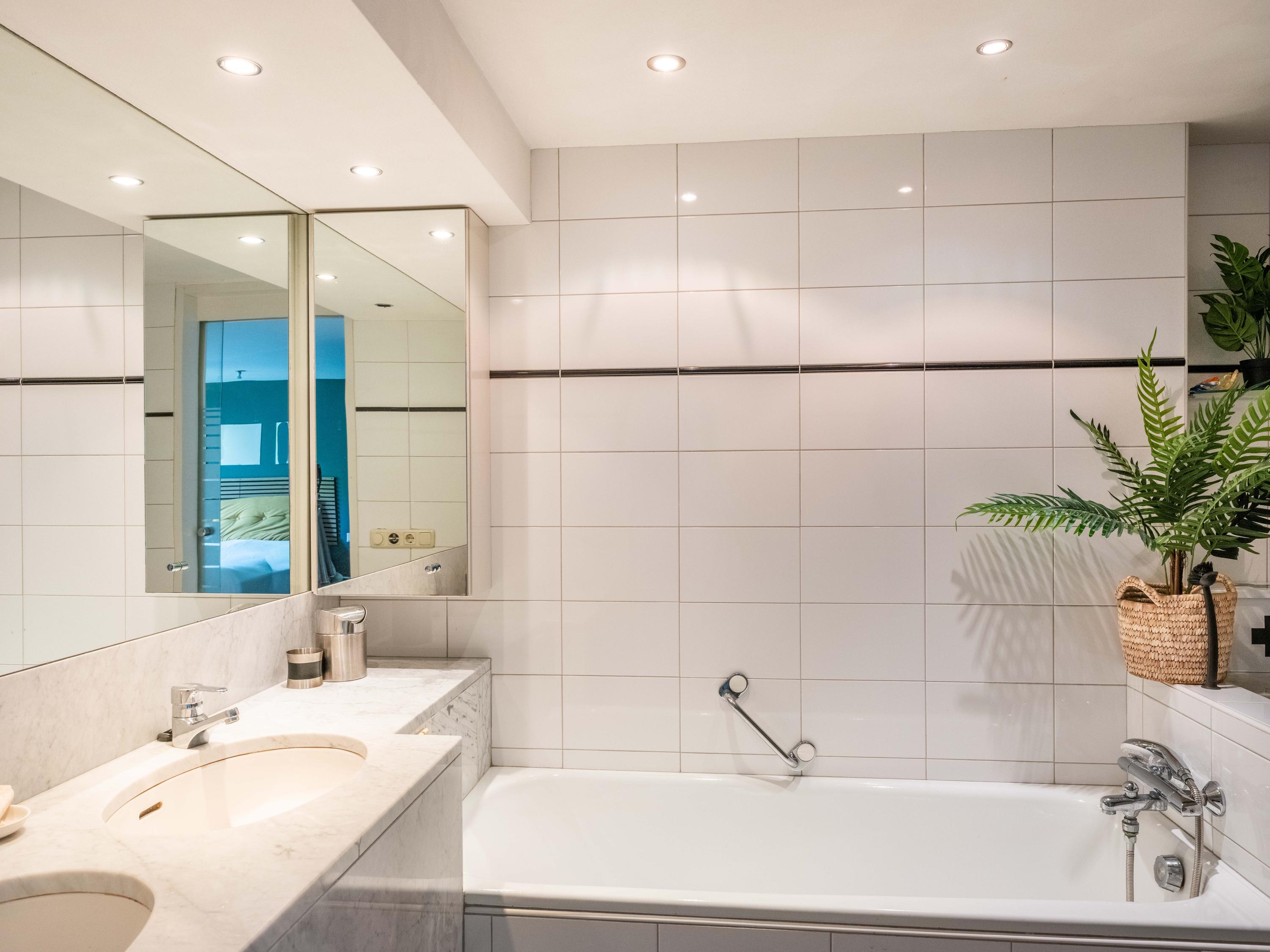 The master bedroom on the ground floor boasts a walk-in closet and a complete, light-filled bathroom with bathtub, walk-in shower, double sinks, underfloor heating, and toilet, making this home ideal for lifelong living.