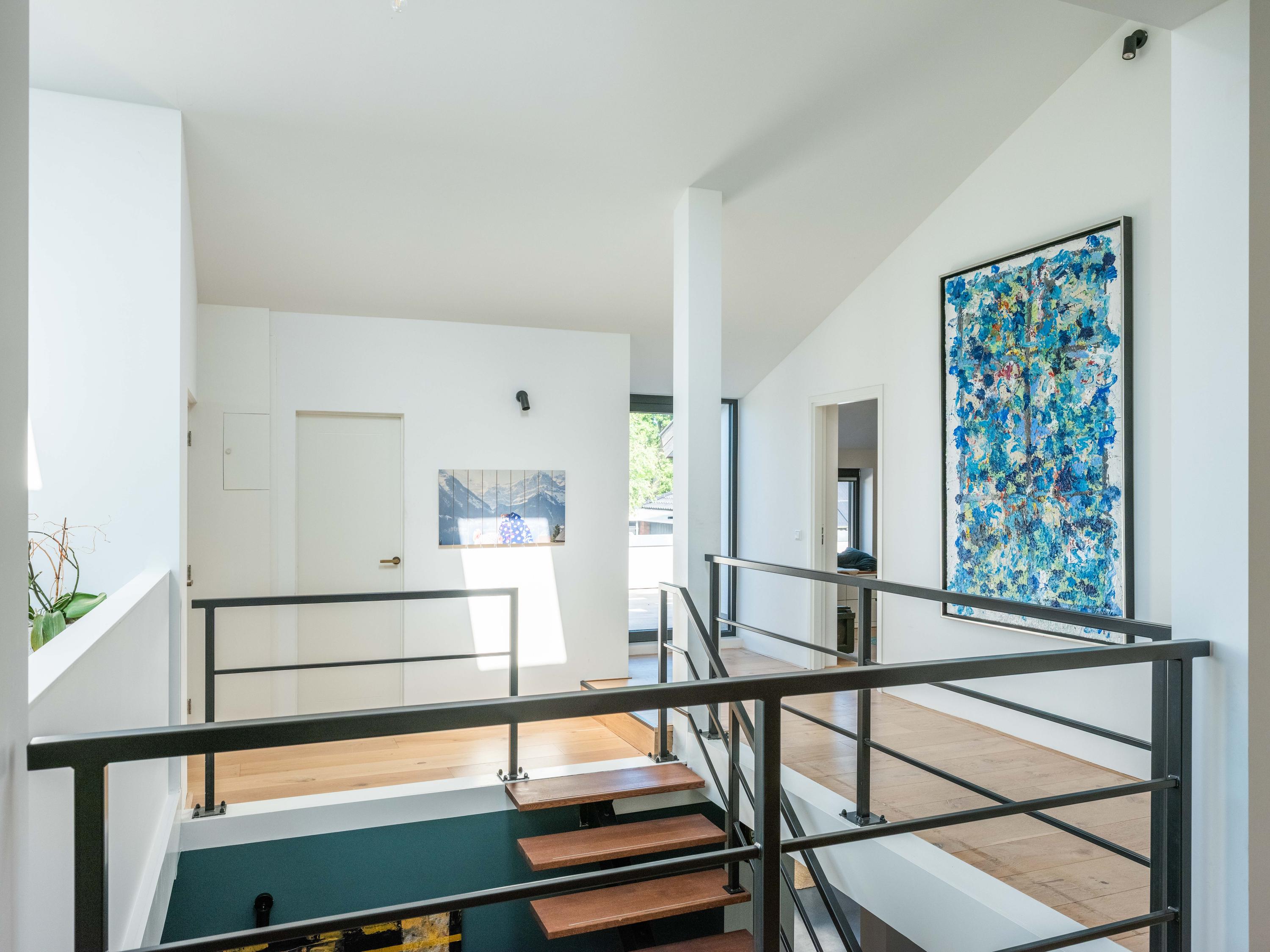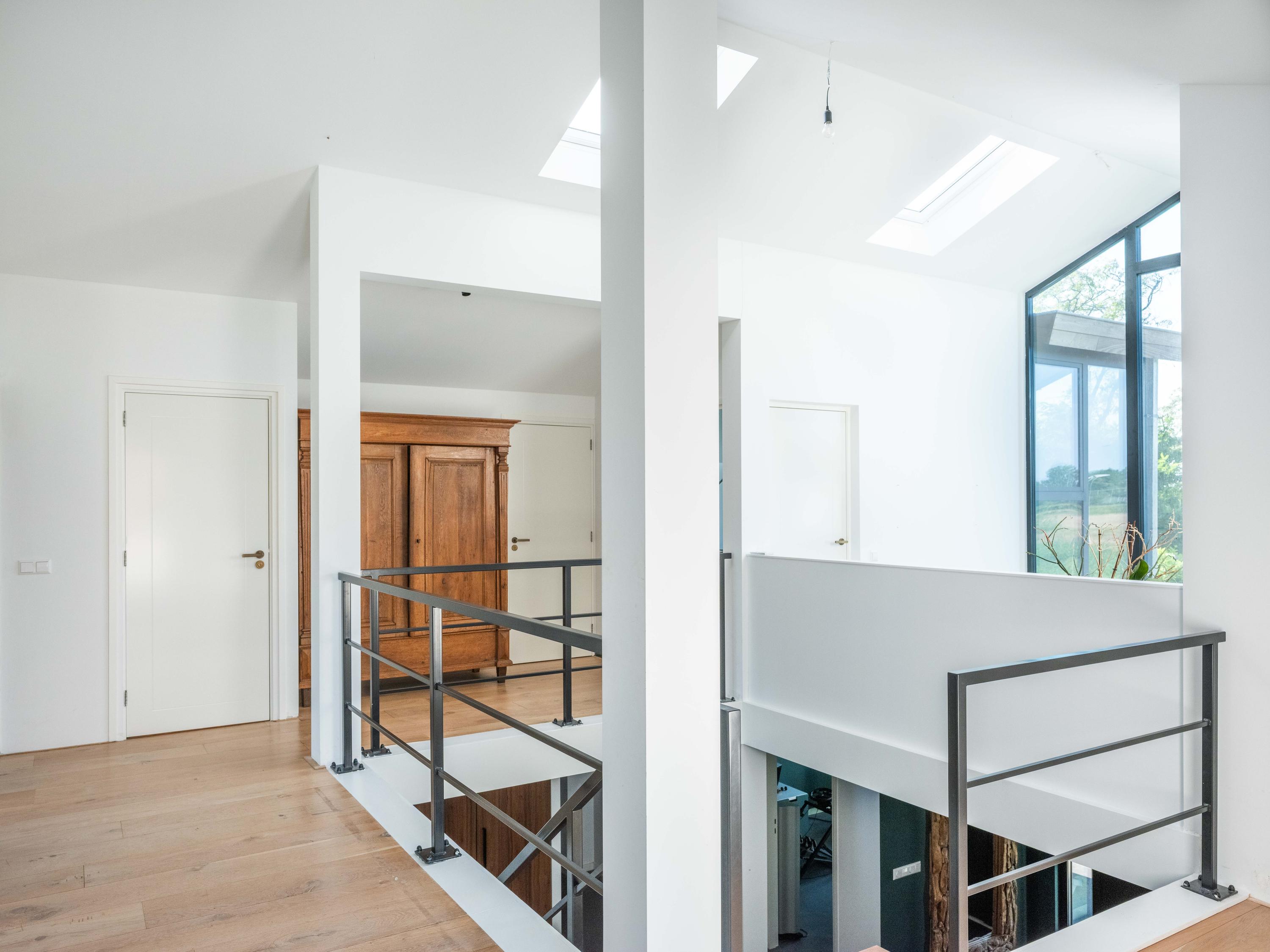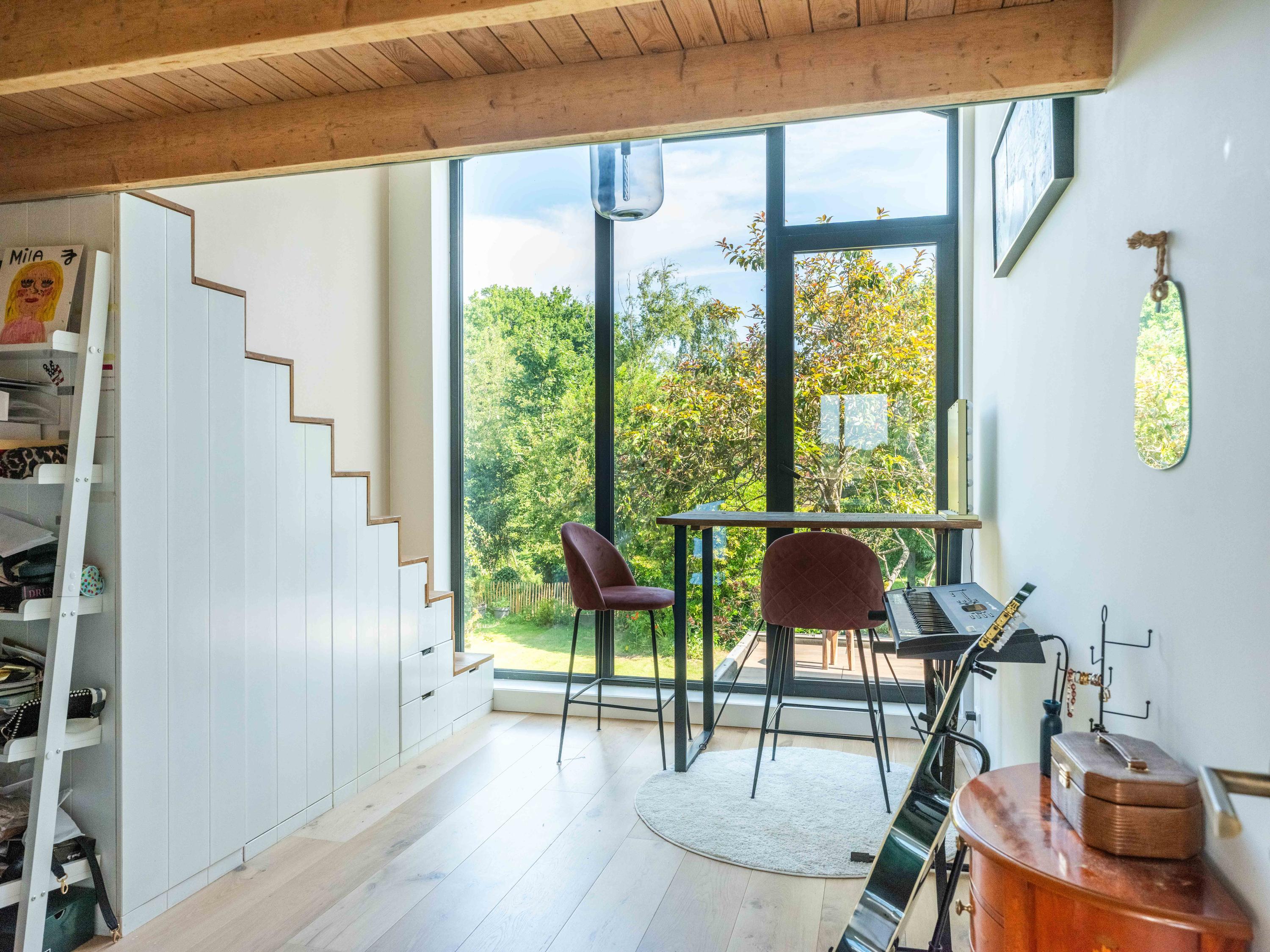 The upper floor is designed for children and hobbies. In addition to three comfortable bedrooms, a second bathroom with a large walk-in shower, separate toilet, and laundry room, there are delightful extras: an inspiring office with expansive views, a serene yoga room, and a playful mezzanine for retreating with a good book.