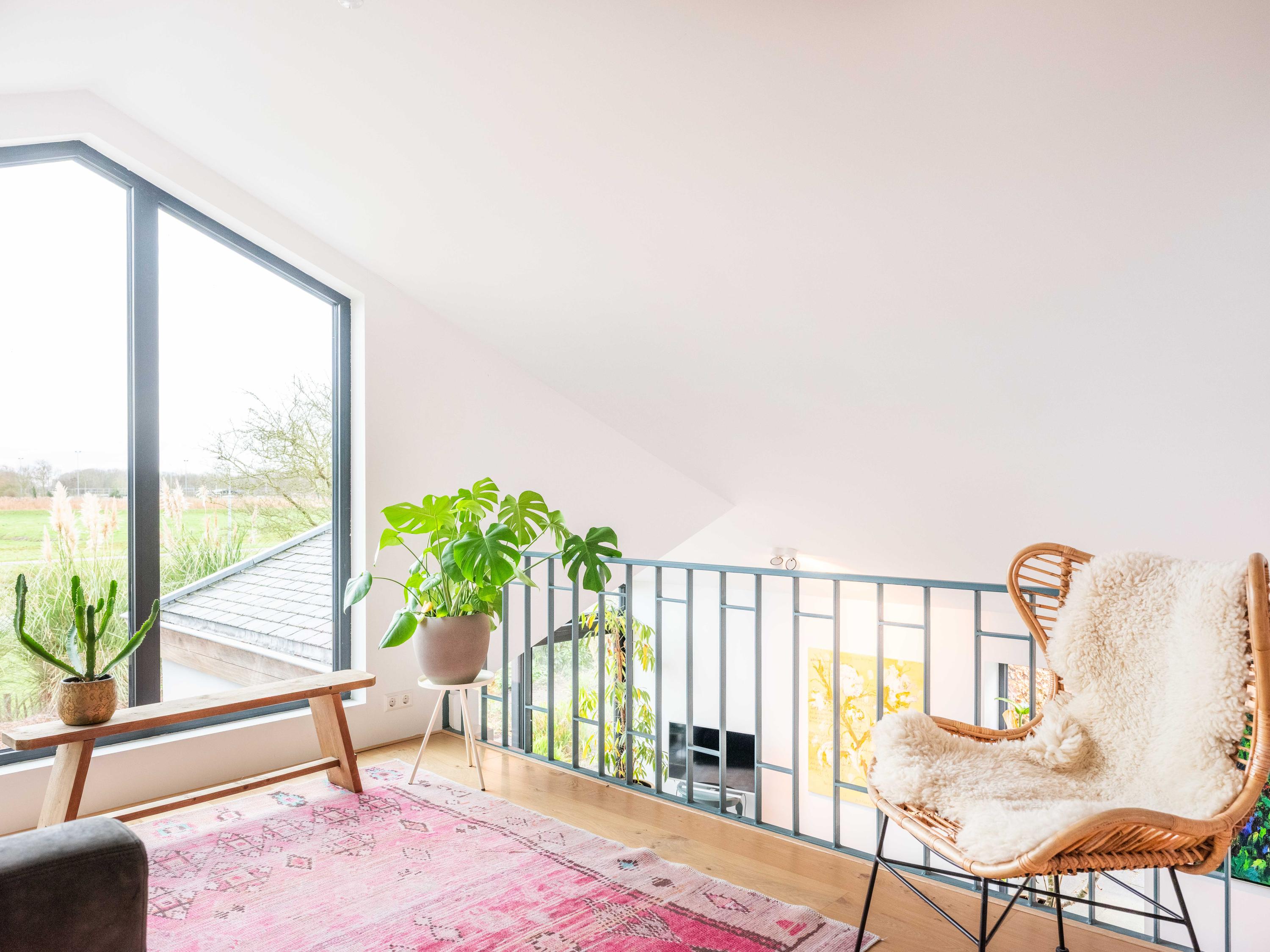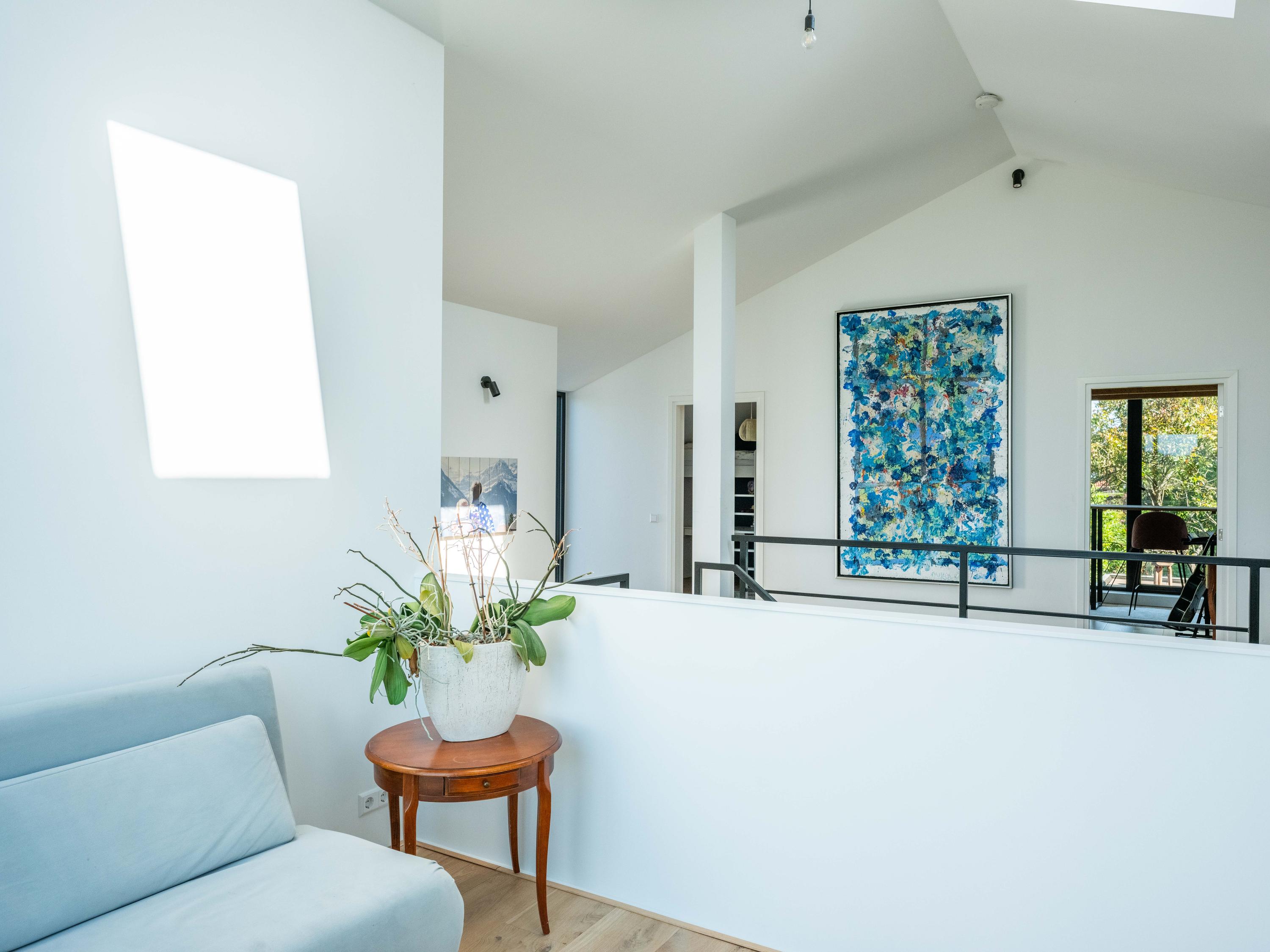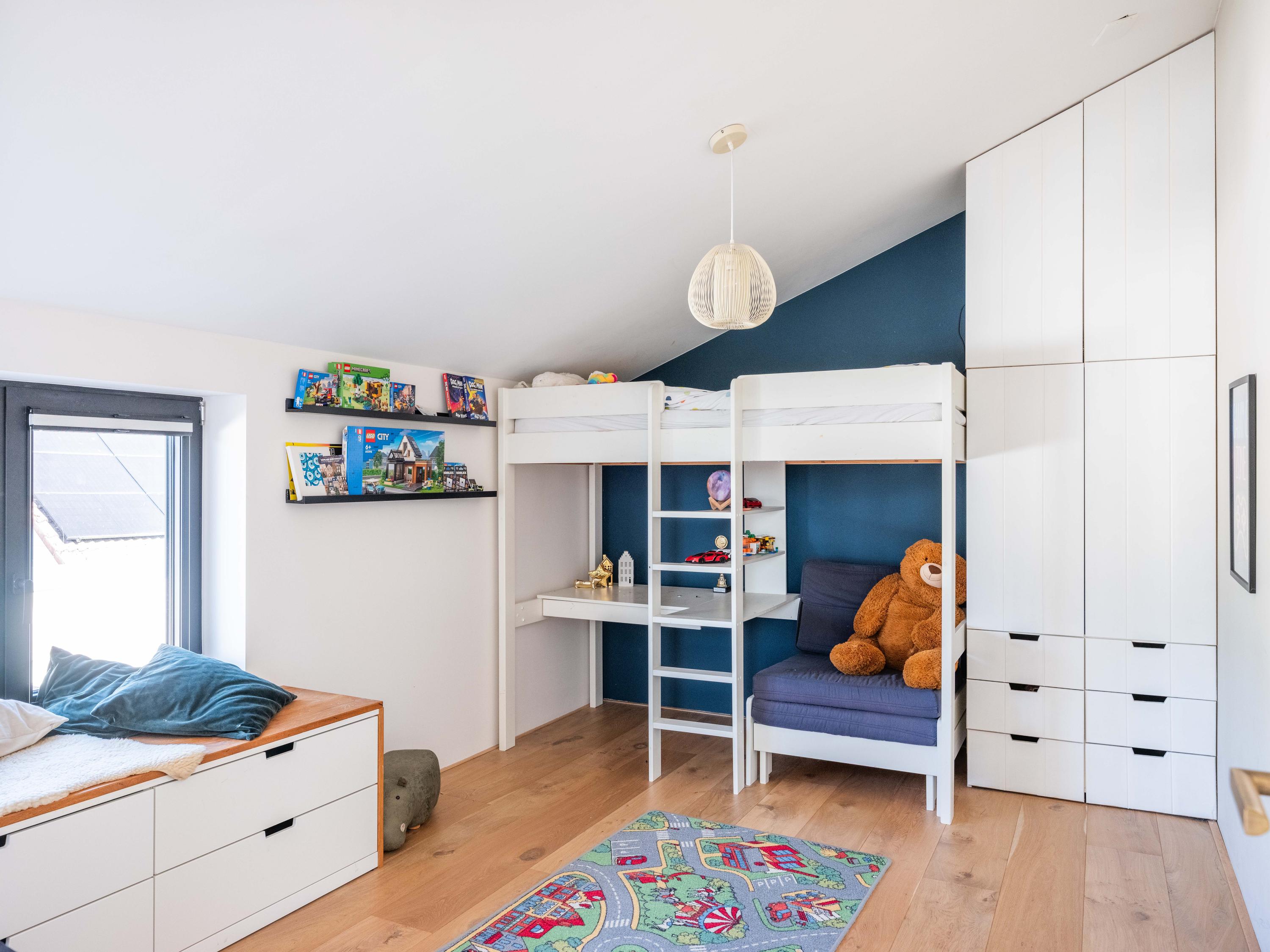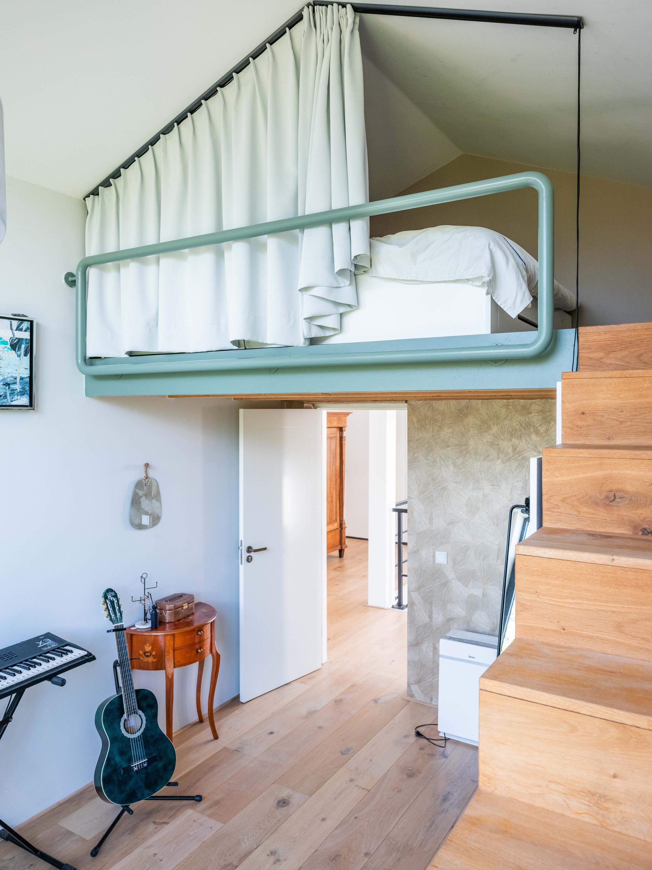 The upper floor is designed for children and hobbies. In addition to three comfortable bedrooms, a second bathroom with a large walk-in shower, separate toilet, and laundry room, there are delightful extras: an inspiring office with expansive views, a serene yoga room, and a playful mezzanine for retreating with a good book.