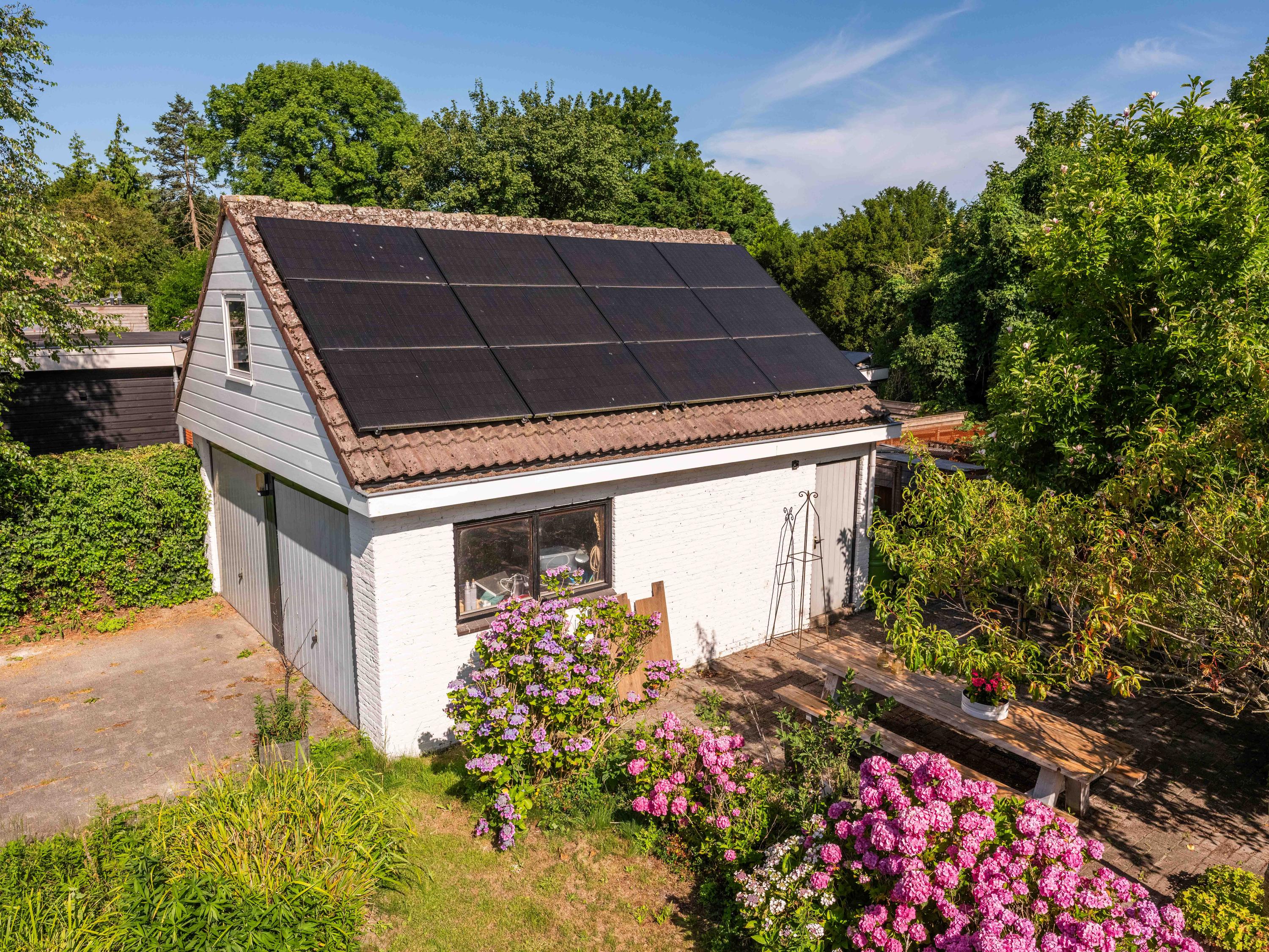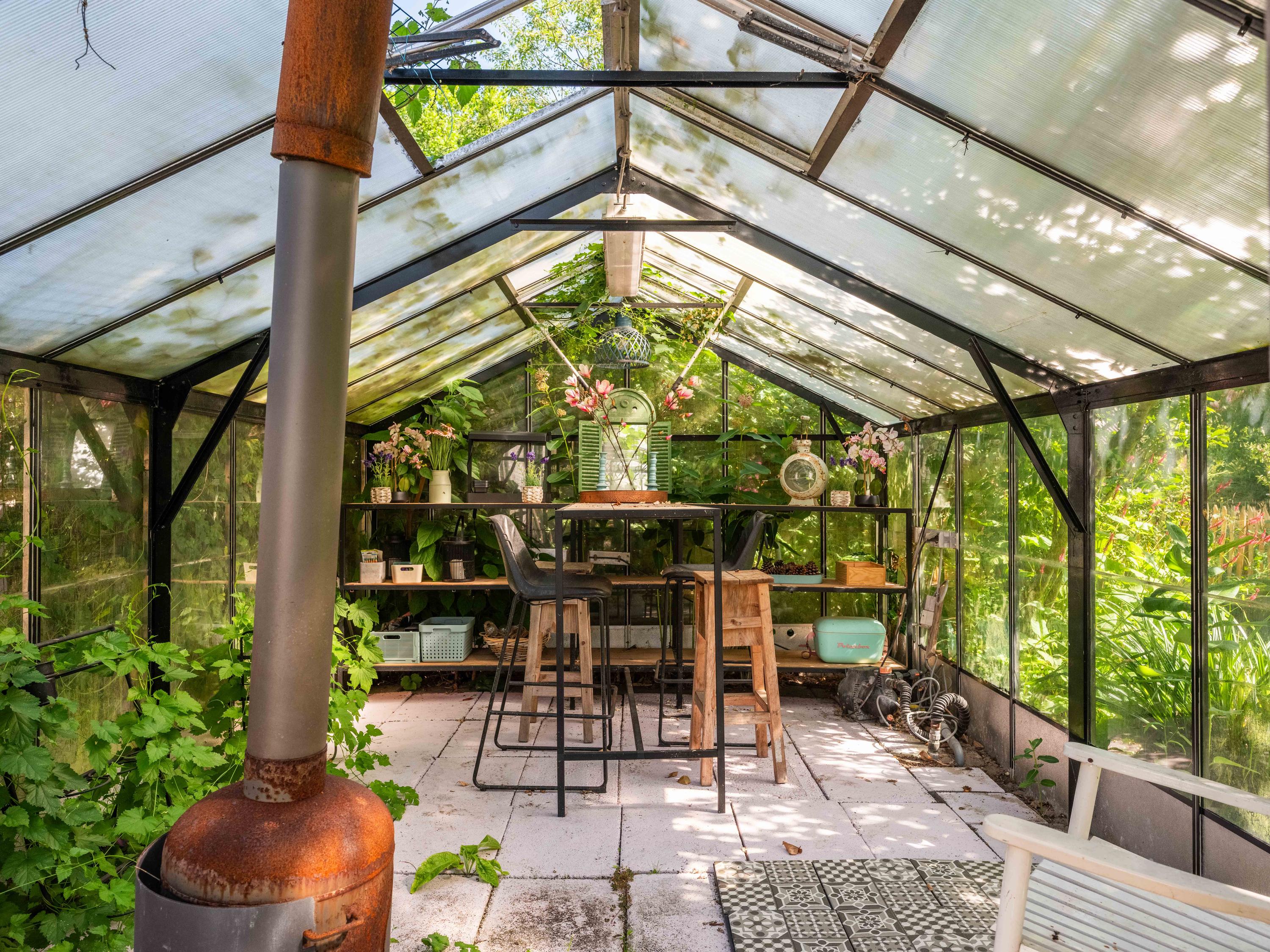 The surrounding garden offers complete privacy, with both sun and shade. A greenhouse, currently used as a cozy lounge with an outdoor fireplace, is perfect for long summer evenings with friends and family. There is also a large detached stone garage (approx. 50 m²) with storage loft, suitable for two cars.