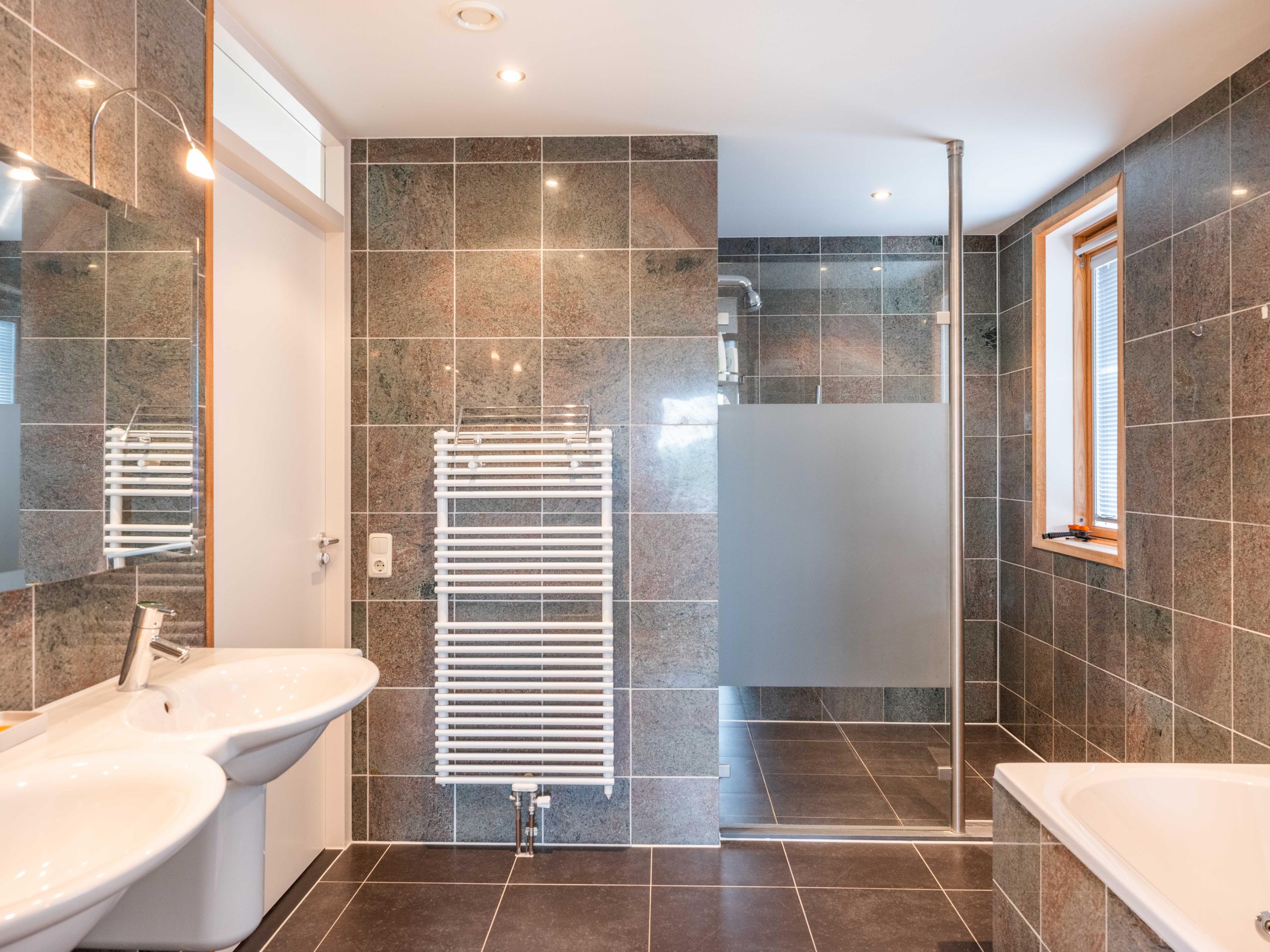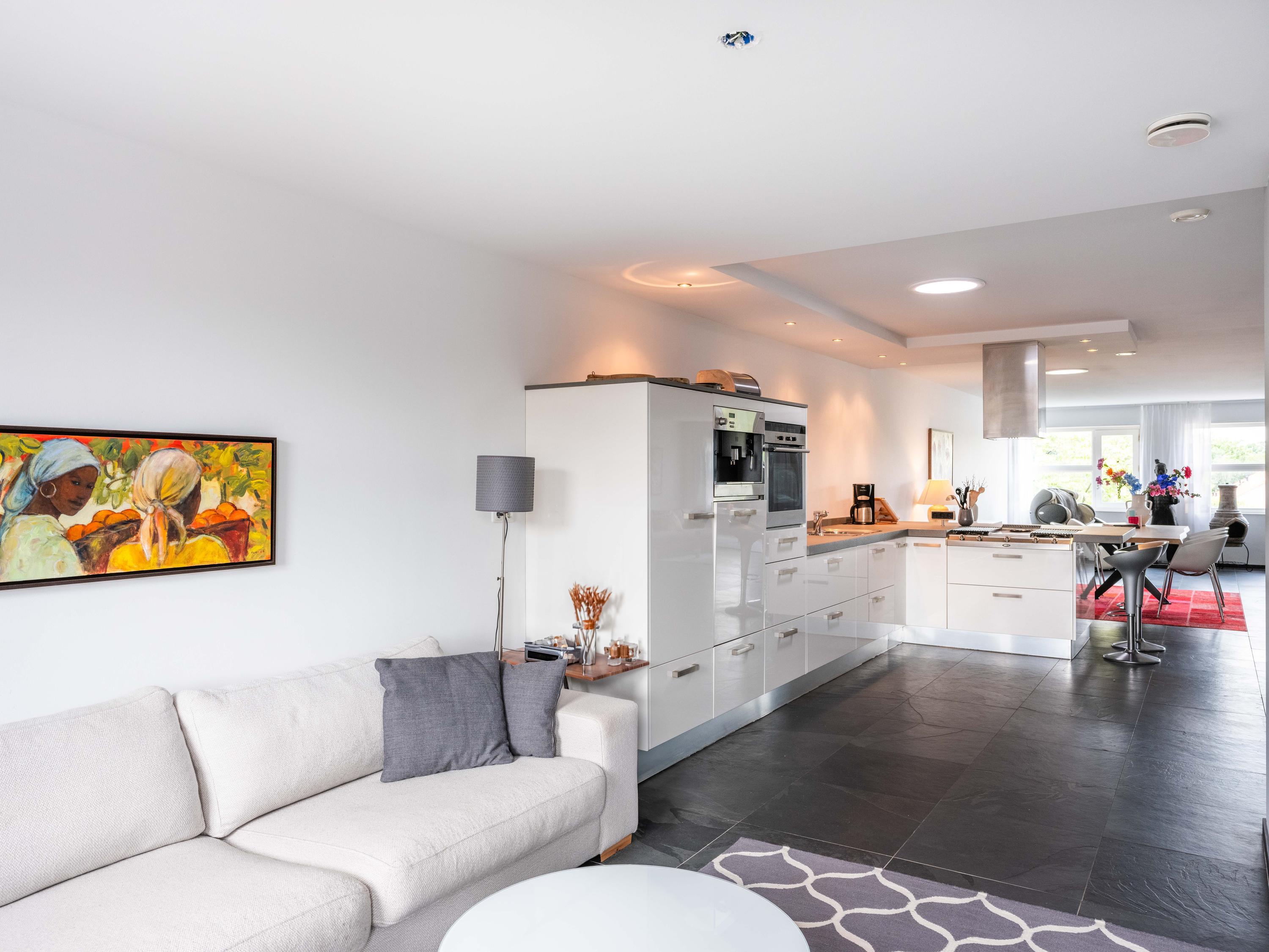 The living room also has two cosy seating areas. The room flows into the open kitchen, which is fully equipped with high-quality built-in appliances and plenty of storage space. On this floor there is also an office/bedroom and the first bathroom with shower, toilet and washbasin.