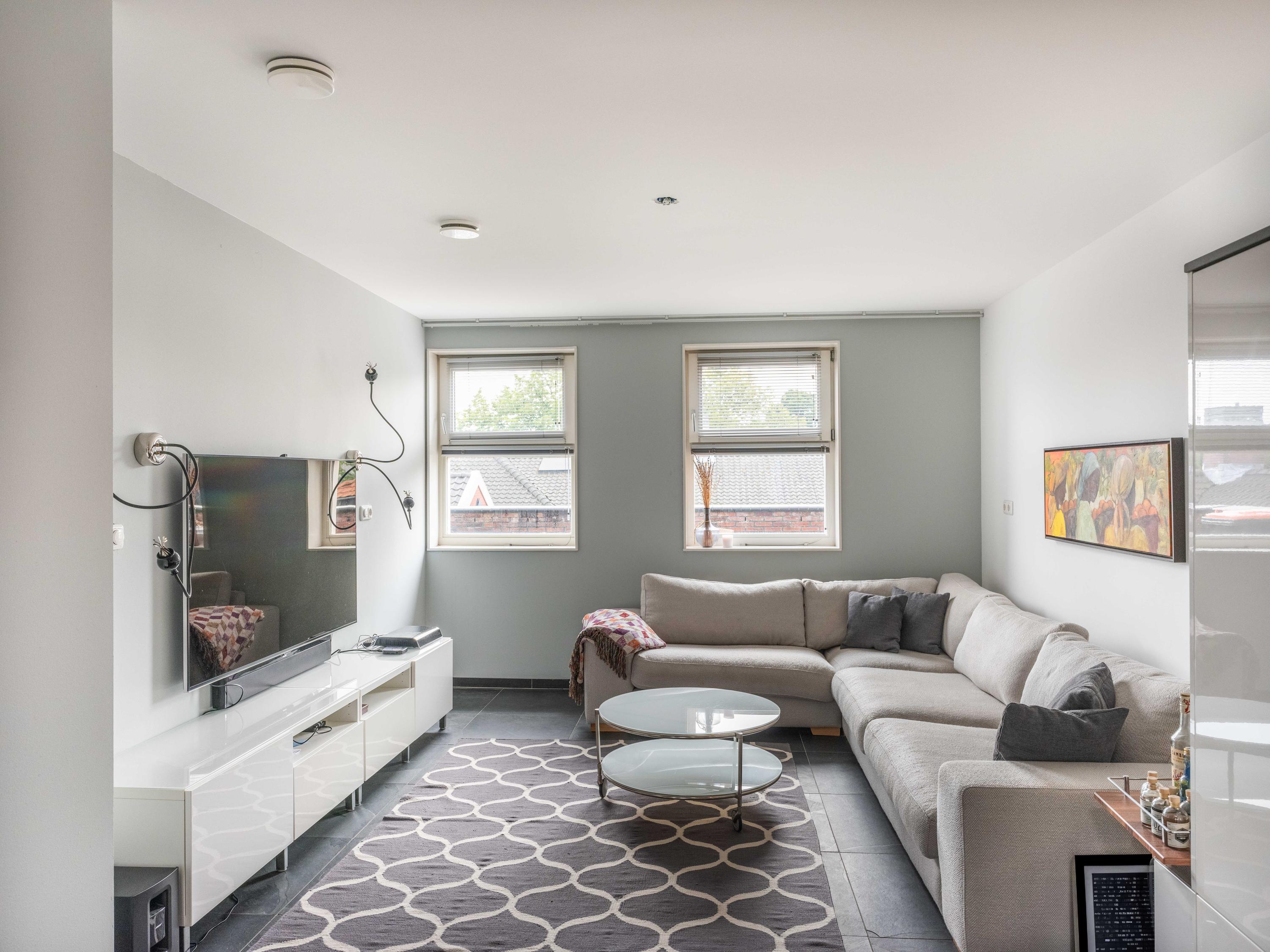 The spacious living room features large windows and two light tubes, which provide plenty of natural light.