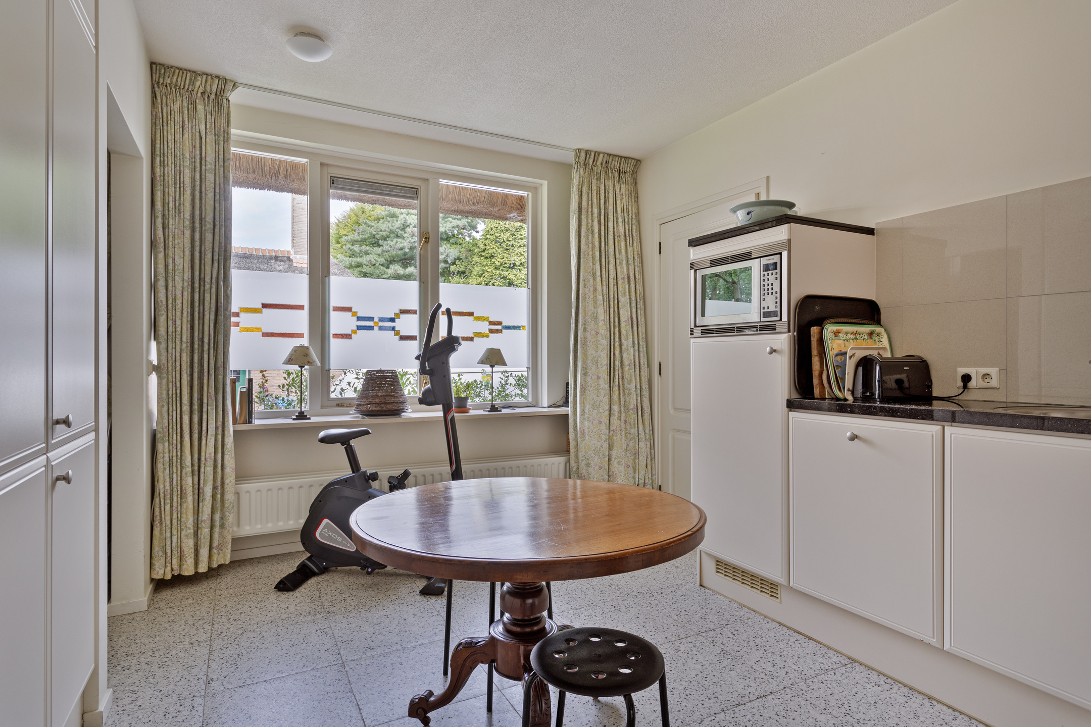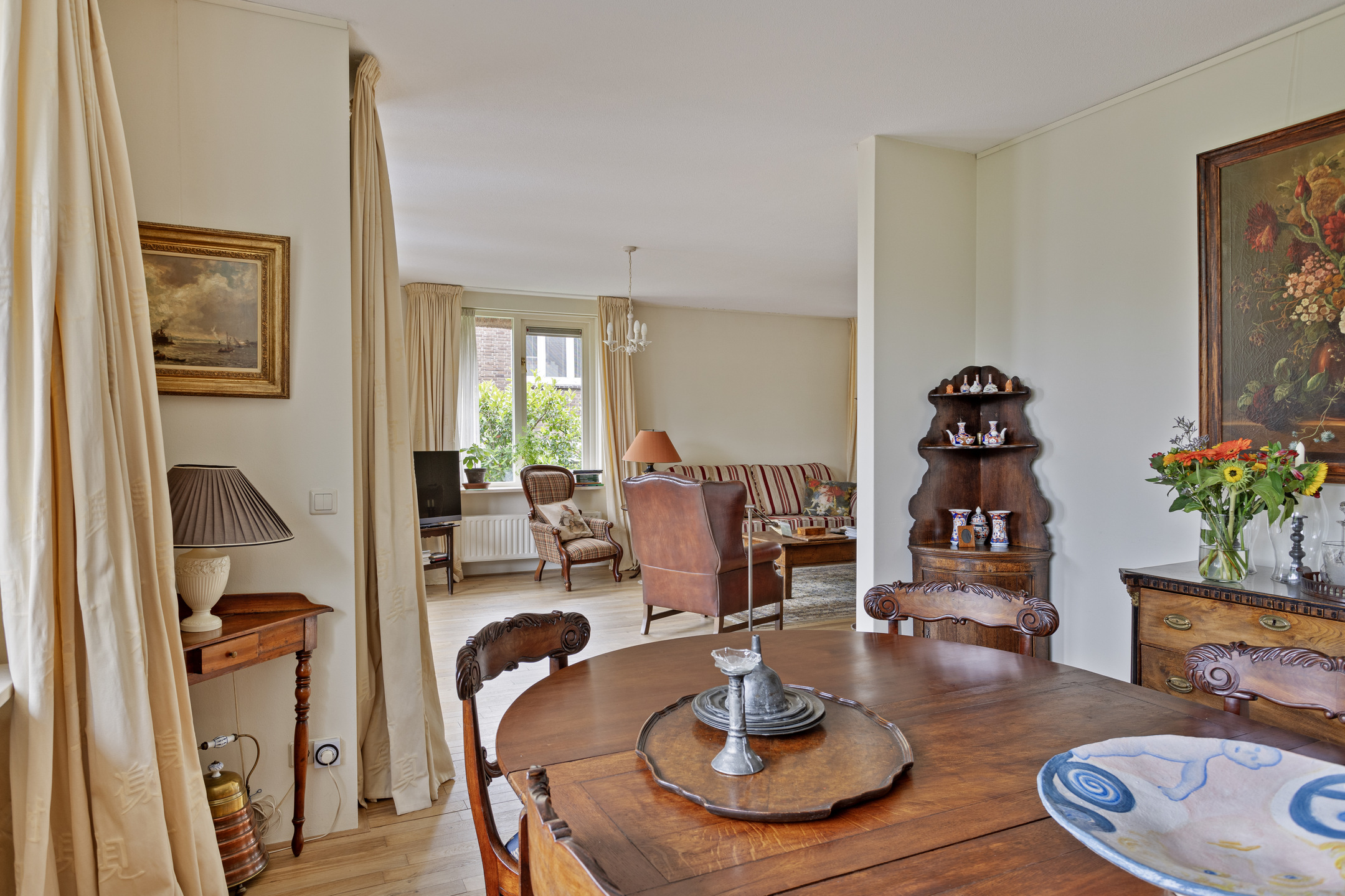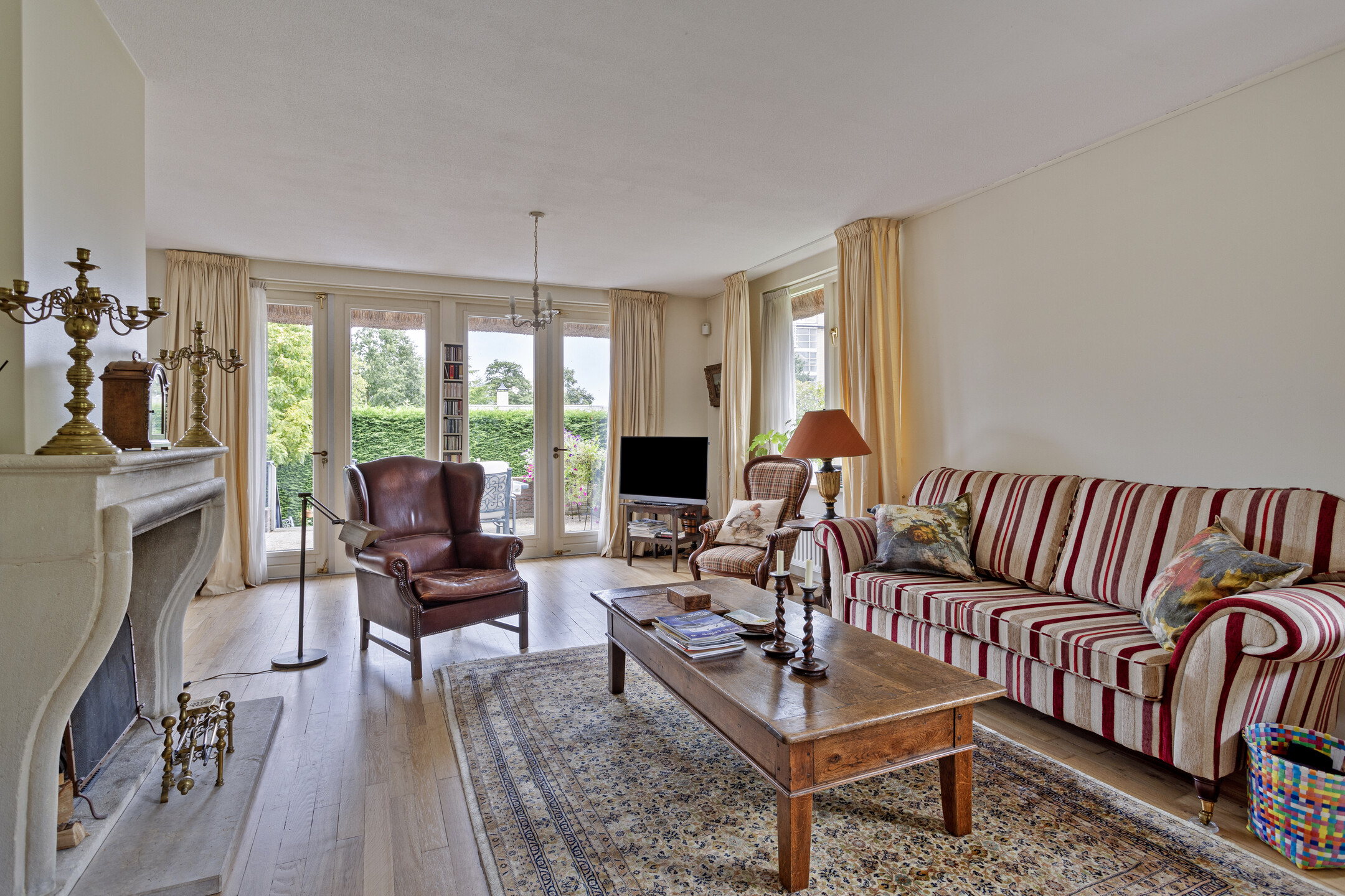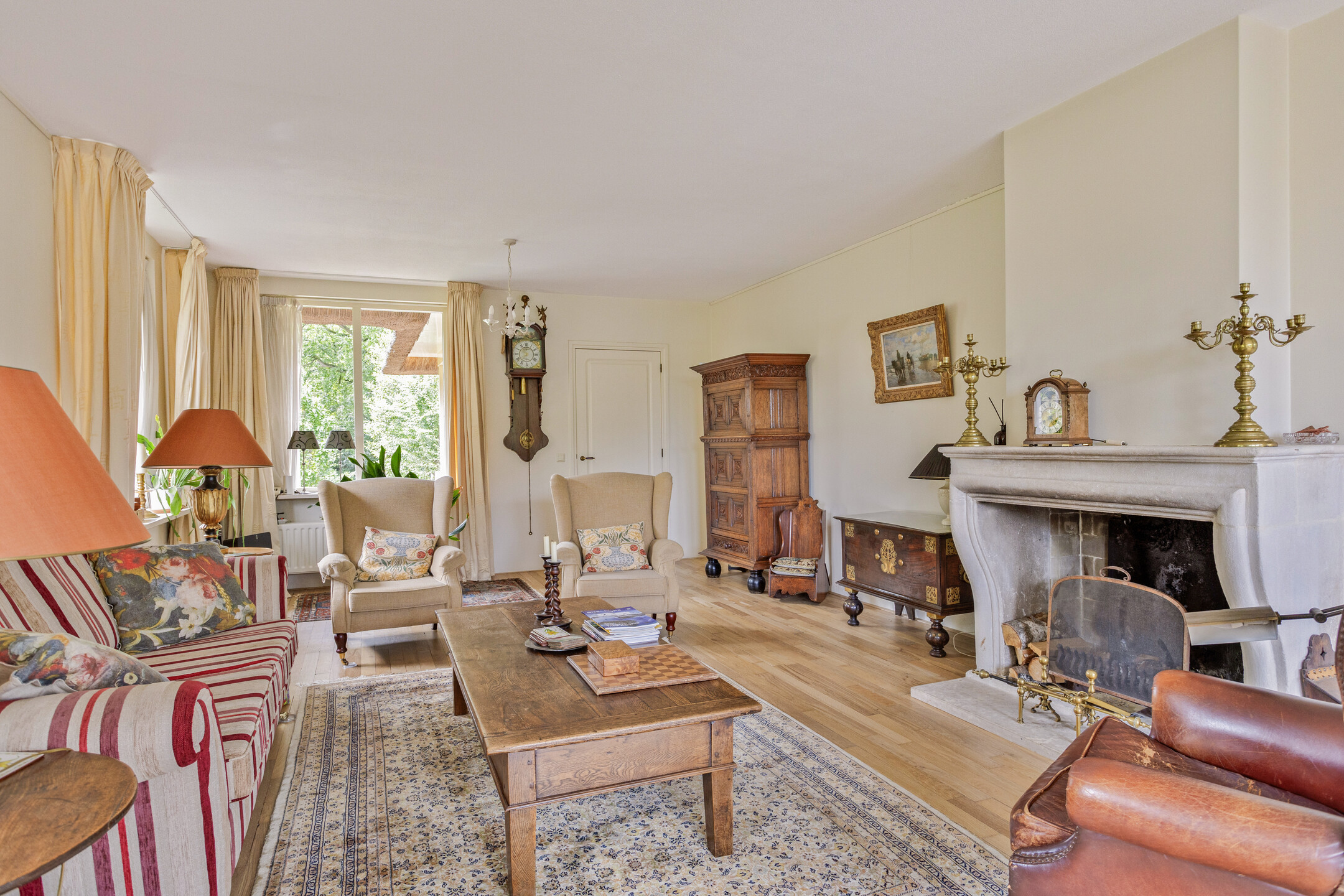 ruime living met zit- en eetkamer (ca. 55 m² incl. eetkamer), voorzien van een marmeren schouwpartij met een open haard, wandafwerking stucwerk, massief eiken houtenvloer (vm. kazernevloer), plafond afgewerkt met spuitwerk, 2-tal tuindeuren naar het terras/tuin;