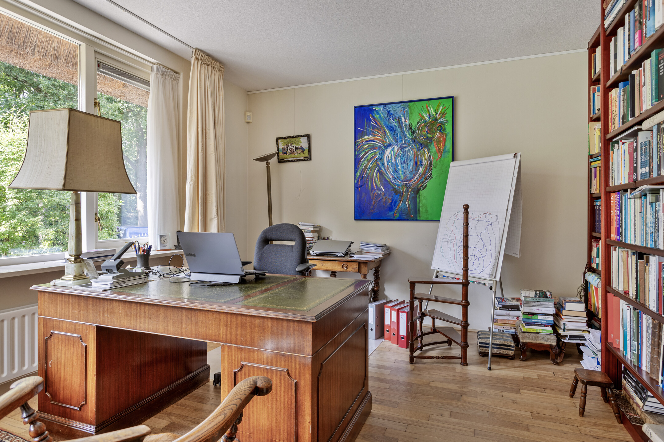 kantoor-/slaap-/werkkamer rechts voor (ca. 15 m²), wandafwerking stucwerk, massief eikenhouten vloer, plafond afgewerkt met spuitwerk;