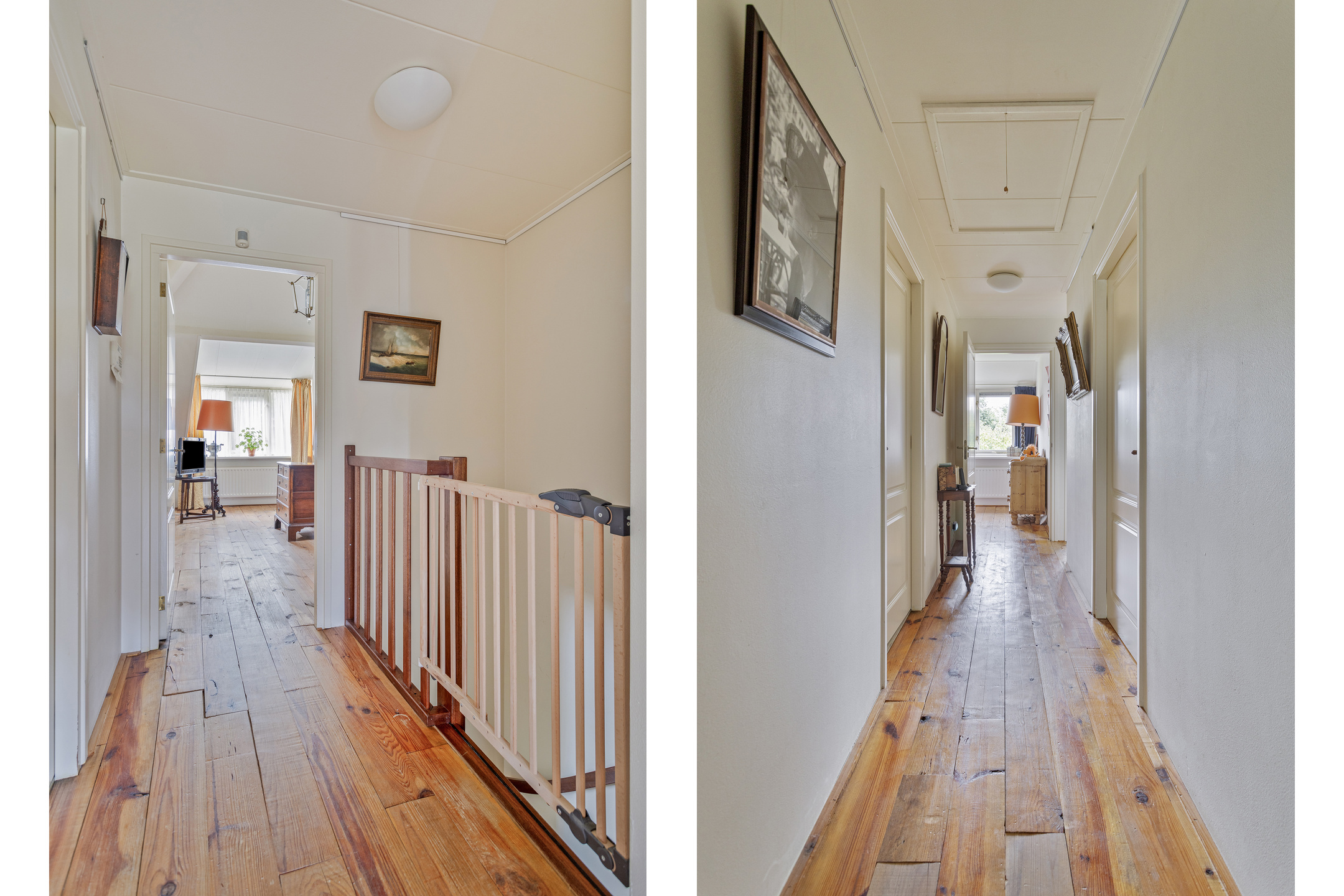 Overloop, wandafwerking stucwerk, grenen planken vloer, plafond afgewerkt met gipsplaten;