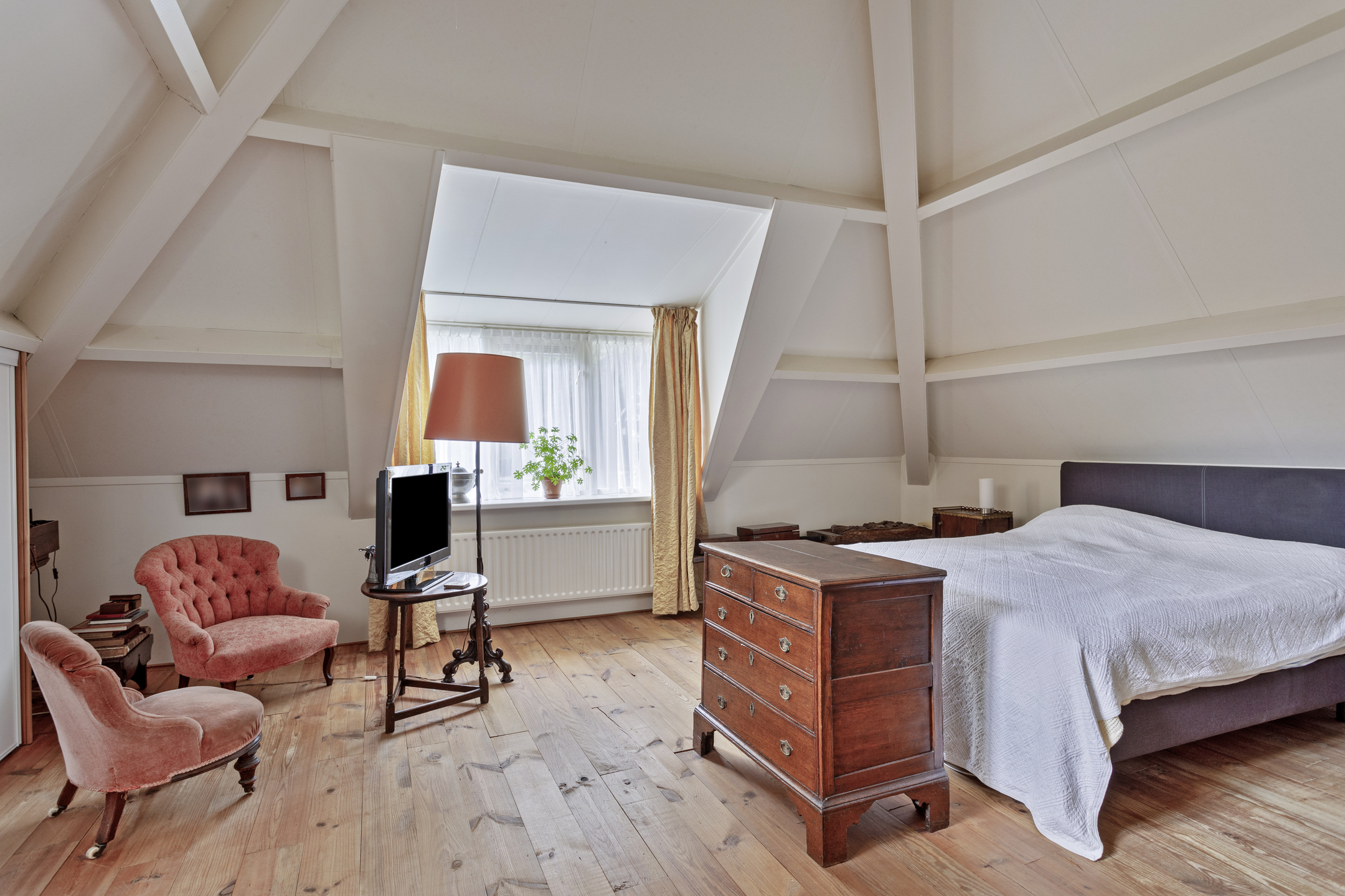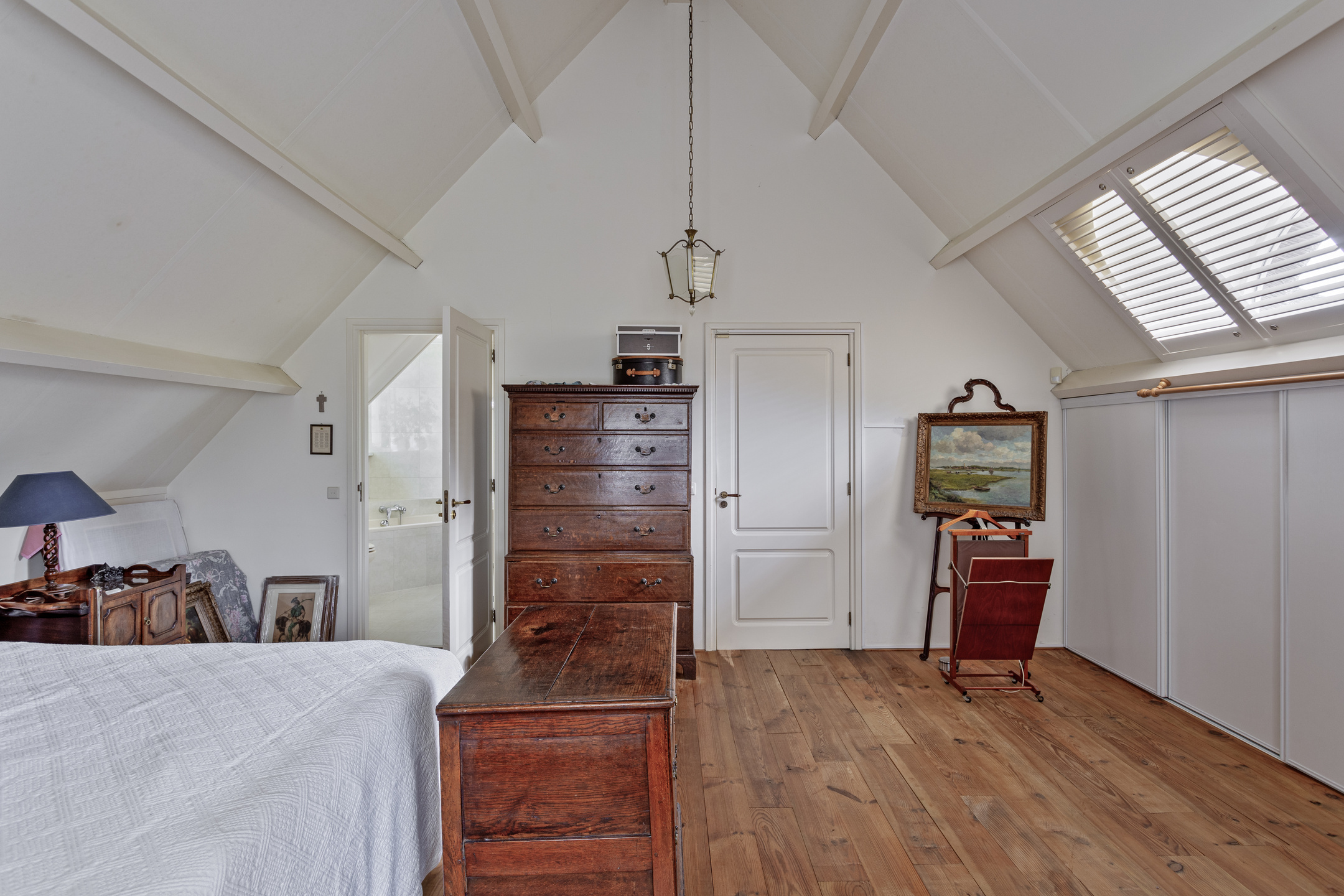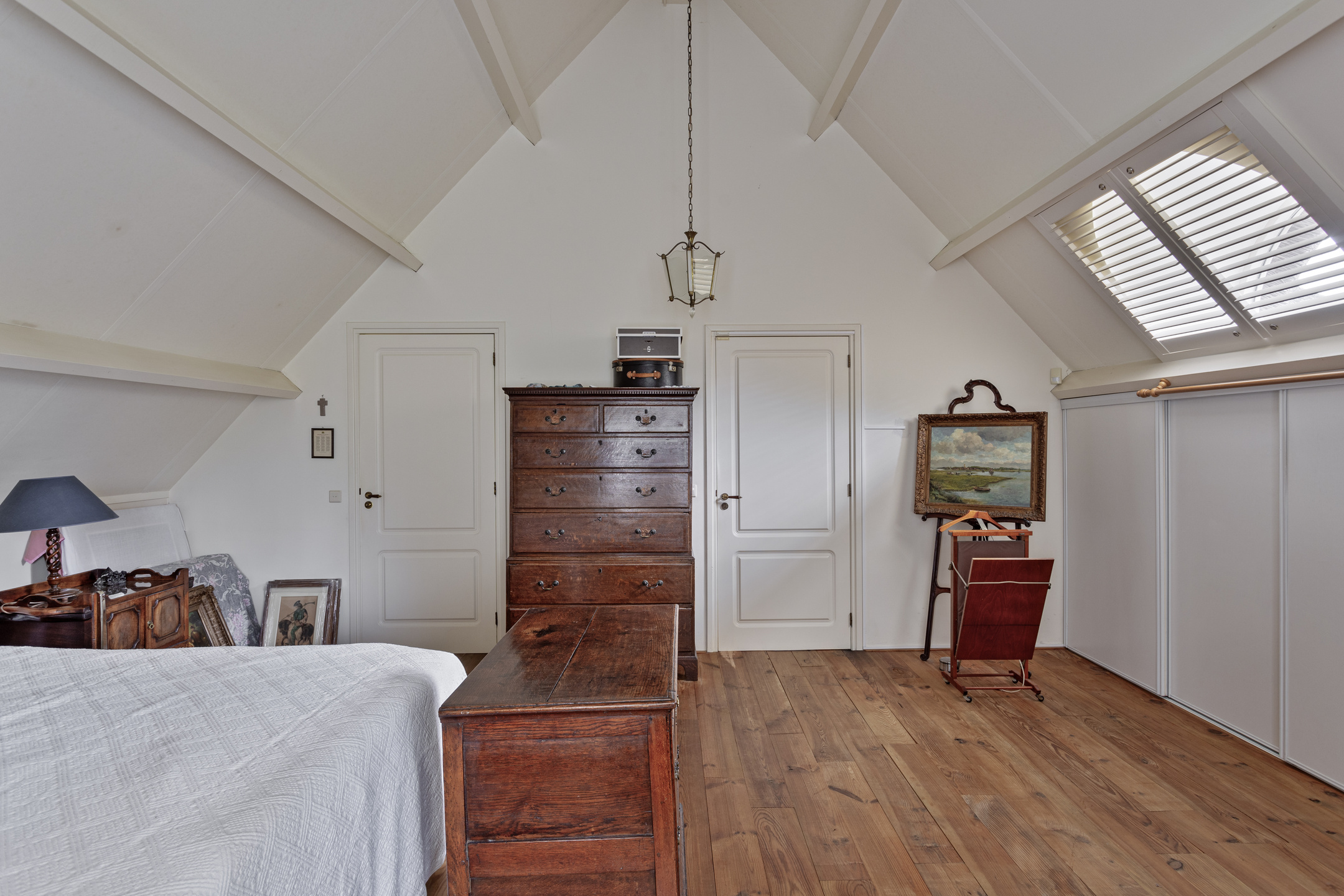 hoofdslaapkamer voorzijde (ca. 29 m²) met inbouwschuifkasten en een dakkapel, wandafwerking stucwerk, grenen planken vloer, dakbeschot in het zicht;
