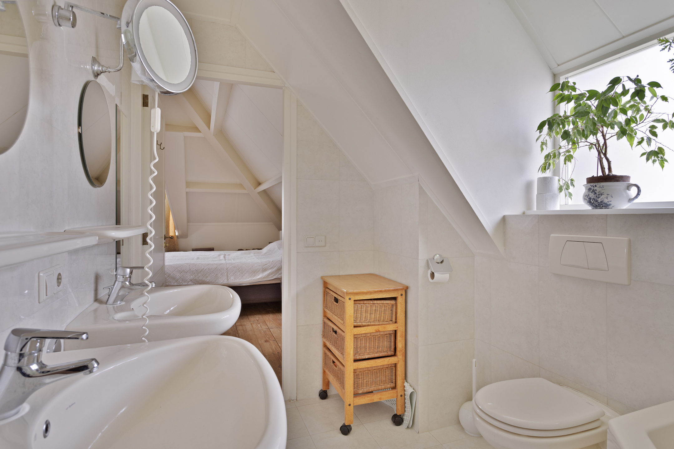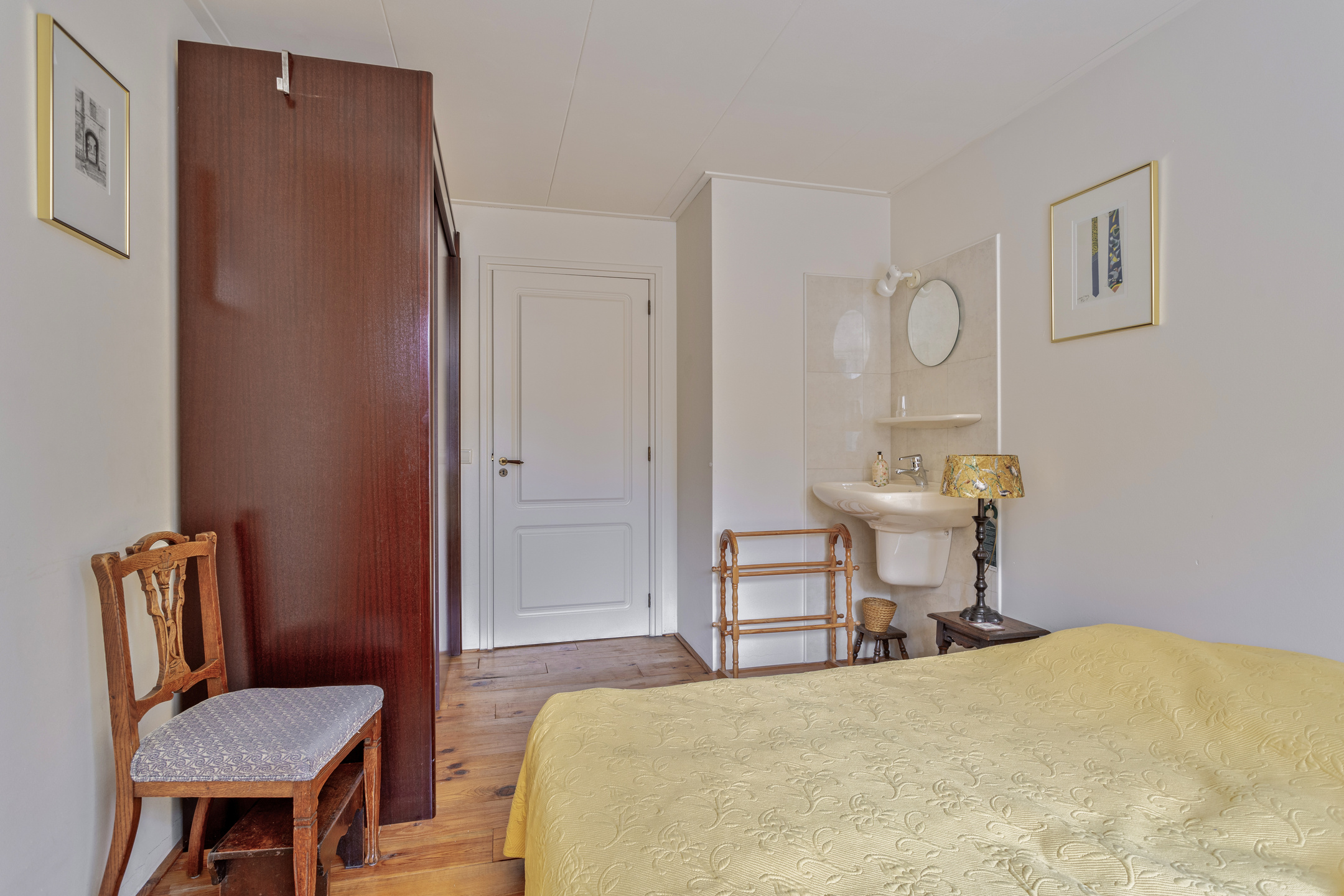 slaapkamer rechts midden, met een wastafel en een dakkapel wandafwerking structuurverf, grenen planken vloer, plafond afgewerkt met gipsplaten;