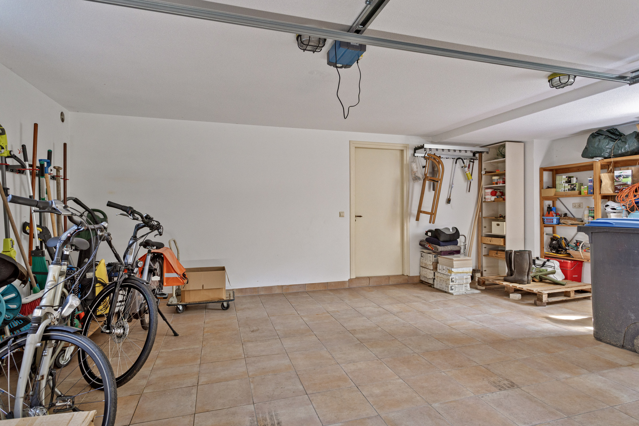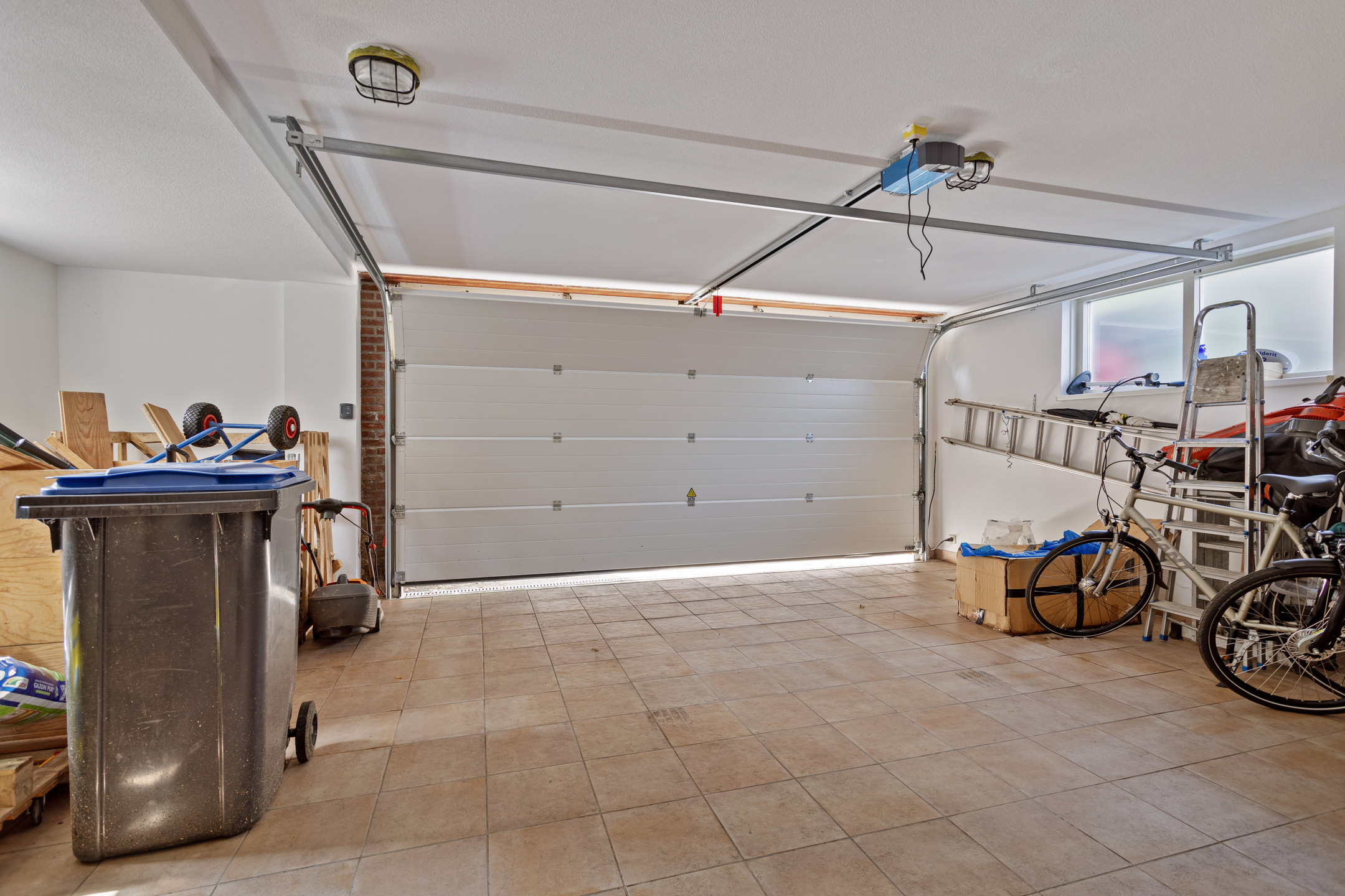 inpandige garage (ca. 35,5 m²) met een brede / elektrische sectiedeur en een drain met pompput (vv. reservepomp), wandafwerking stucwerk, tegelvloer, plafond afgewerkt met spuitwerk;