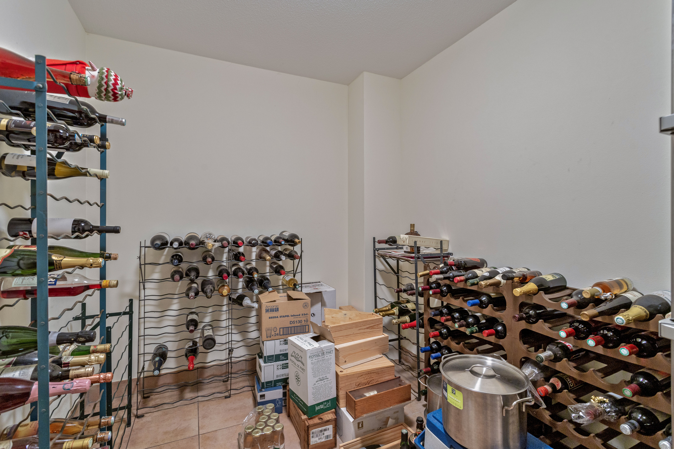 separate (wijn)kelder, wandafwerking stucwerk, tegelvloer, plafond afgewerkt met spuitwerk.