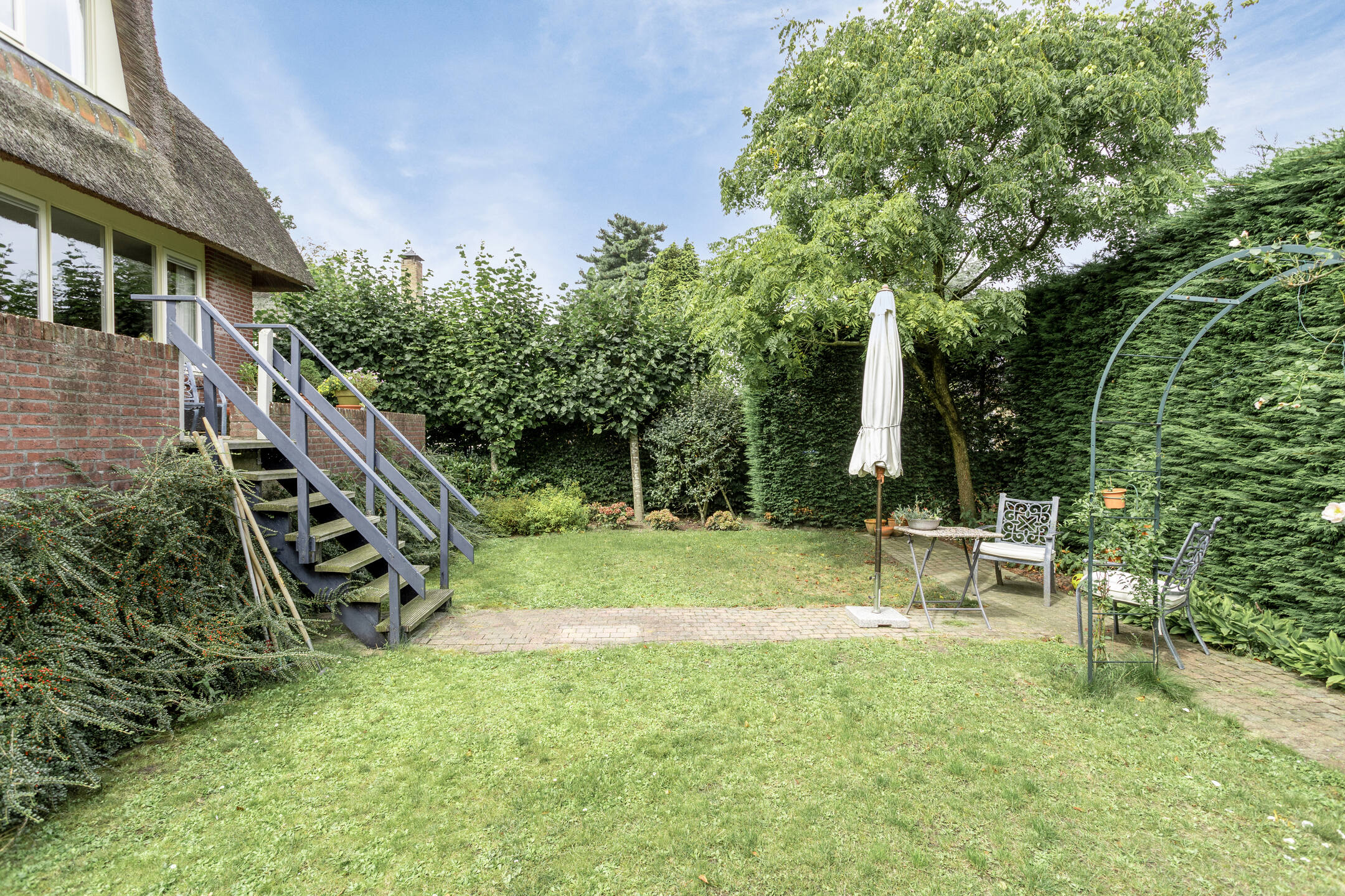 De tuin is beschut gelegen waarbij direct aansluitend achter de woonkamer een terras aanwezig is voor de gezellige uren. Via een trap bereikt u het groene deel van de tuin welke volledig omheind is en waar vandaan u de woning rondom kan bereiken. Het geheel is groen omheind en aan de voorzijde voorzien van een elektrische poort en deurbelinstallatie.