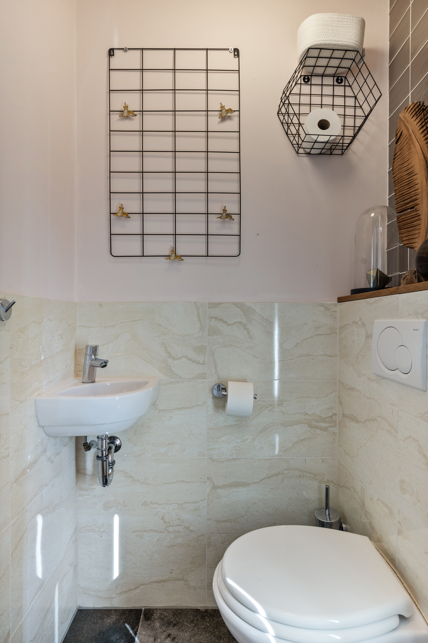 Entrance hall with a modern toilet (including washbasin), storage space, staircase to the first floor, and access to the living room with open kitchen.