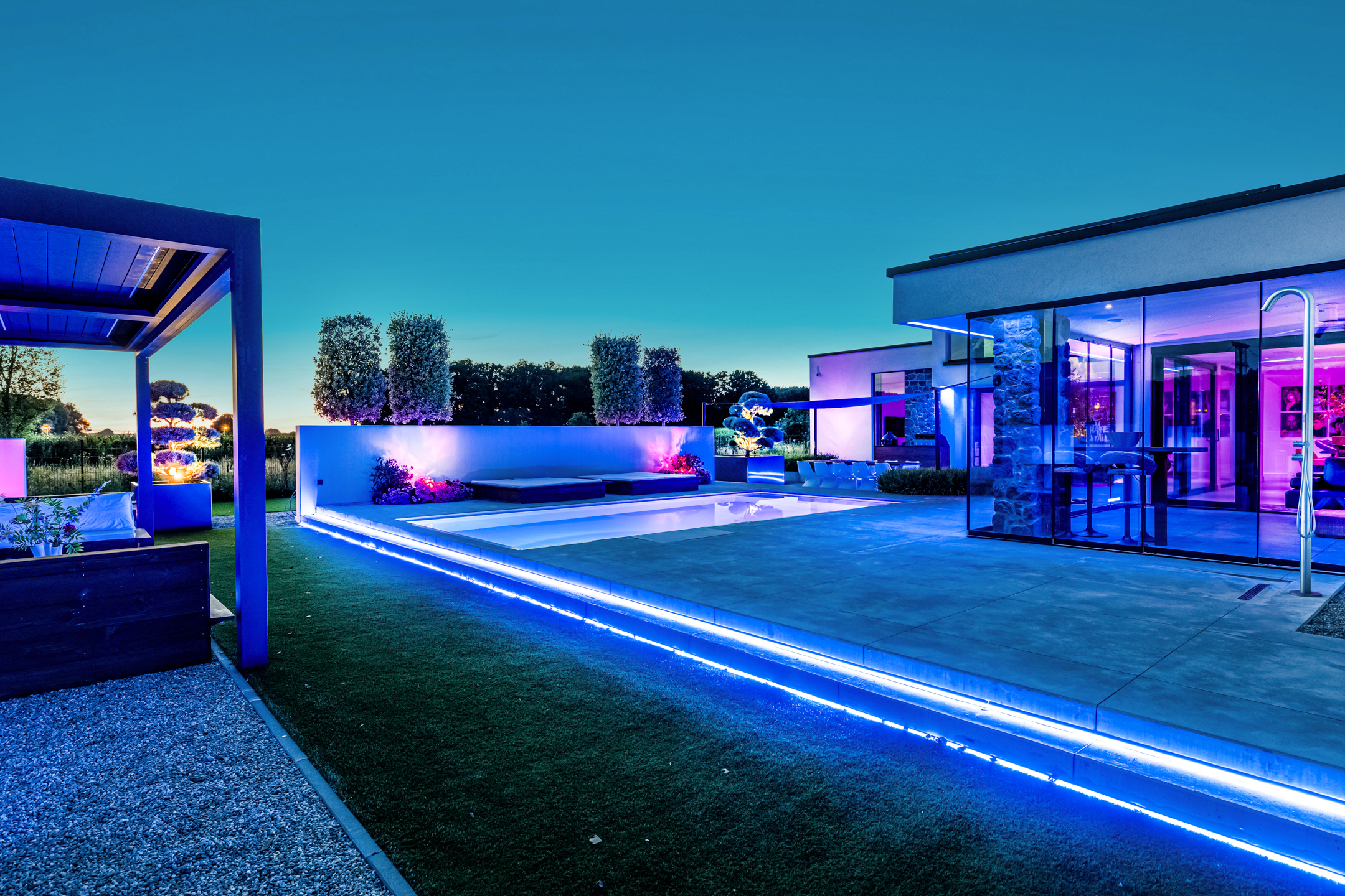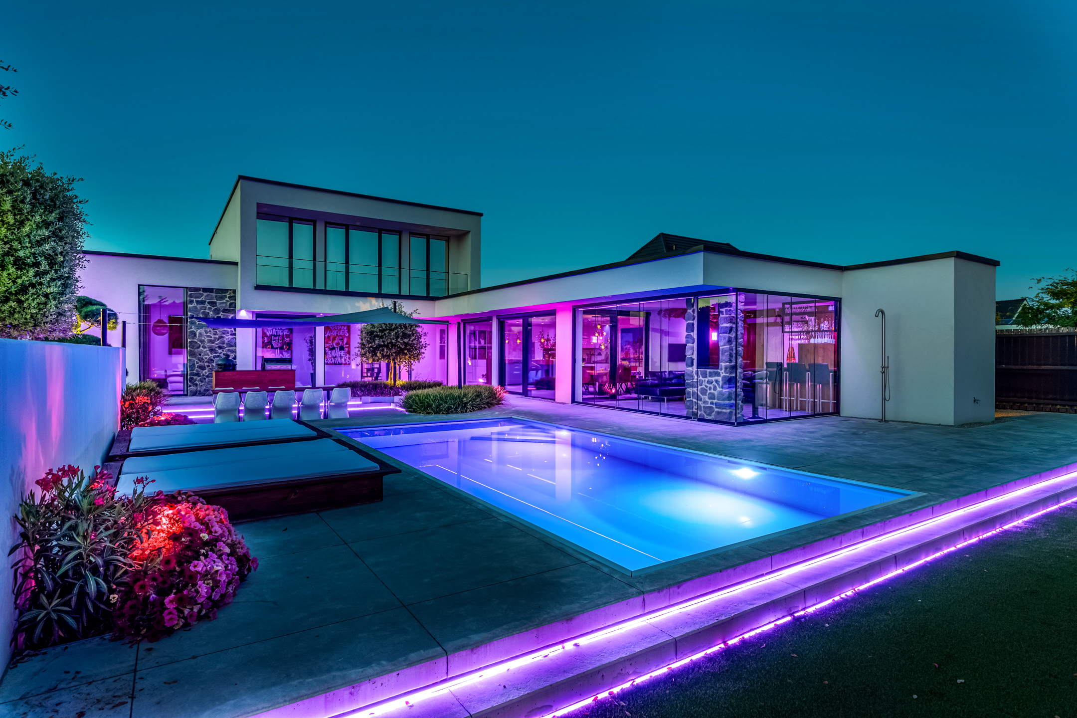 Approx. 26 m², with lighting, automatic louvered roof, and custom hardwood lounge bench.