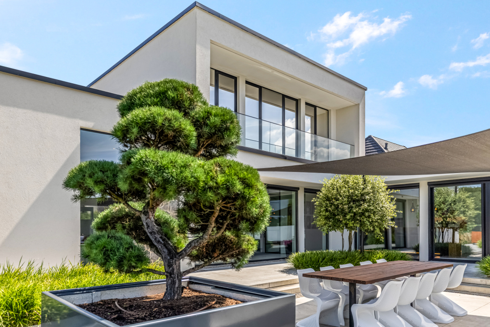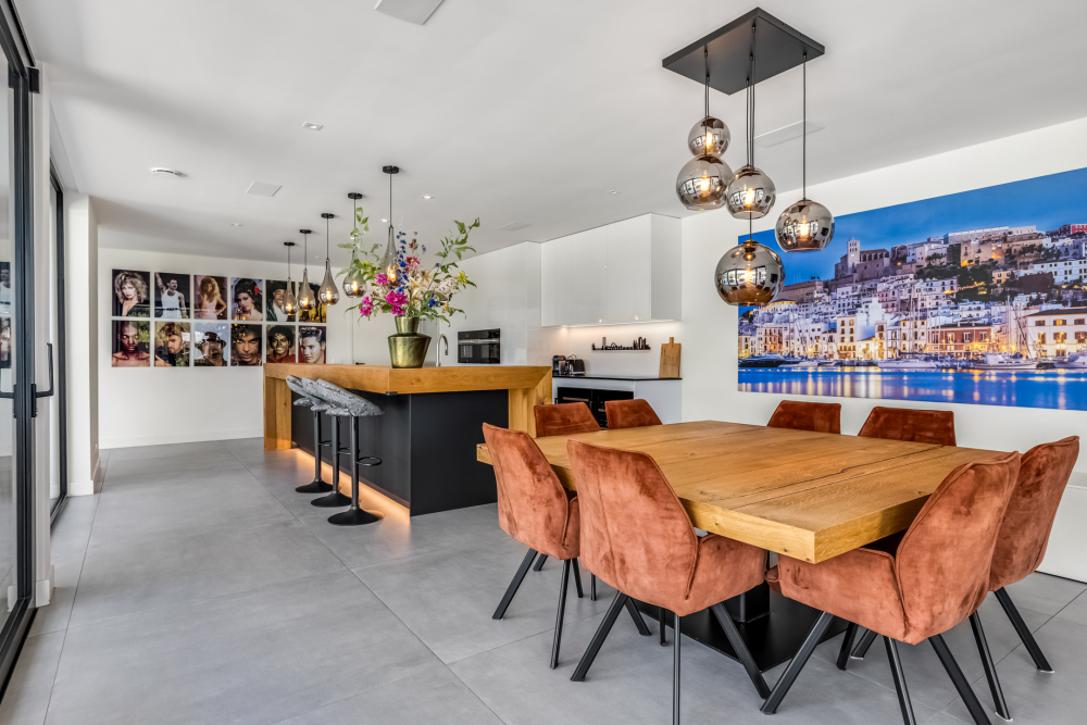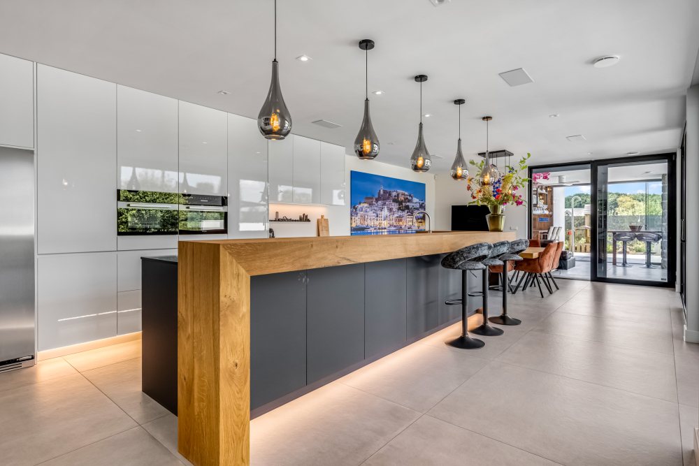 Inside, the spacious kitchen with a cooking and sink island forms the heart of the home. All elements — kitchen, bathrooms, wardrobes, and vanity units — are fully custom-designed with attention to detail and style. The bright living room and corridor with an impressive glass façade create a stunning connection to the architect-designed garden and breathtaking views. With four spacious bedrooms and two luxurious bathrooms, there’s plenty of room for the whole family.