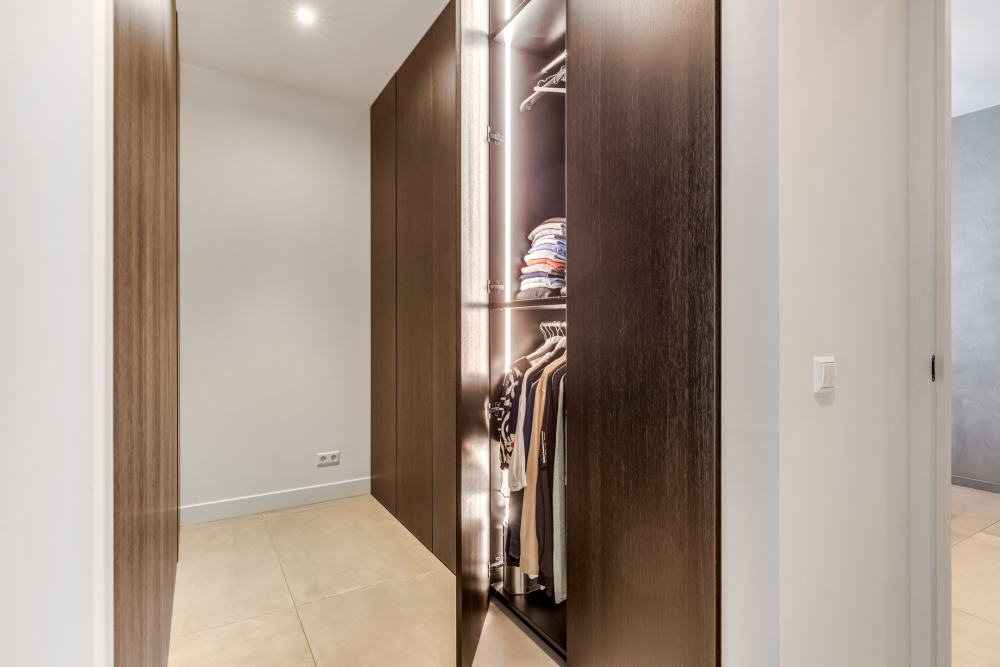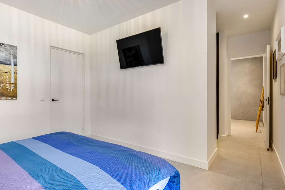 Approx. 19.5 m², with tiled flooring, plastered walls and ceiling with recessed lighting, a wardrobe, floating staircase with access to the master suite and first floor, and a floor-to-ceiling steel door leading to the corridor.