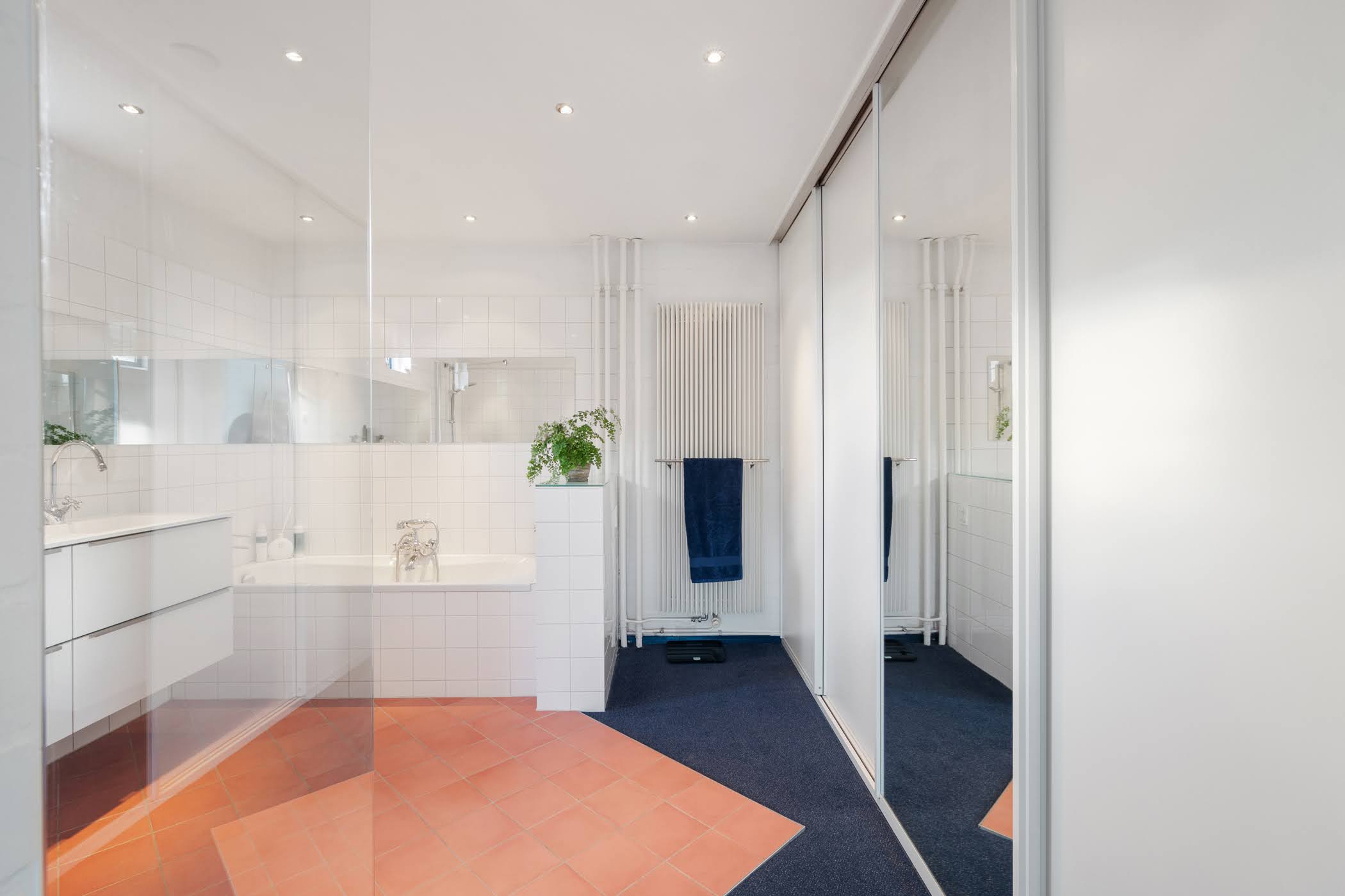 On the landing, there is a separate toilet and a second bathroom with shower, washbasin, shelf, and mirror.
