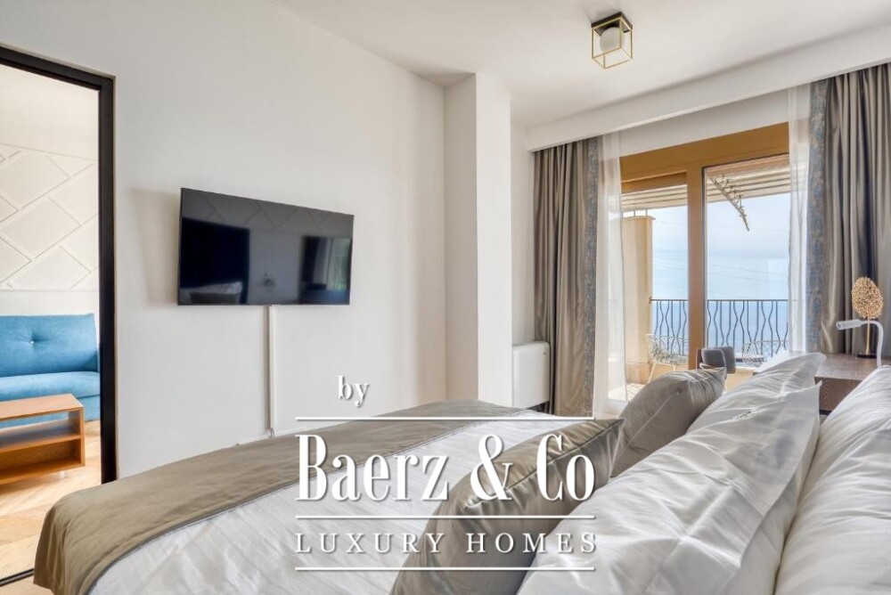 This complex comprises three buildings and provides its residents with access to a pool and dedicated parking, all connected via an asphalt road to the region’s main routes. The apartment offers 112 m² of living space with two bedrooms and two bathrooms, positioned on the second floor for elevated perspectives. Terraces face both the sea and the encircling mountains, immersing each moment in gentle Mediterranean light. The layout is considered, with a hallway leading to a living room that combines kitchen and dining spaces, expressing a geometry that is both functional and poised. This luxury apartment for sale in Budva arrives fully furnished and ready for immediate occupation.