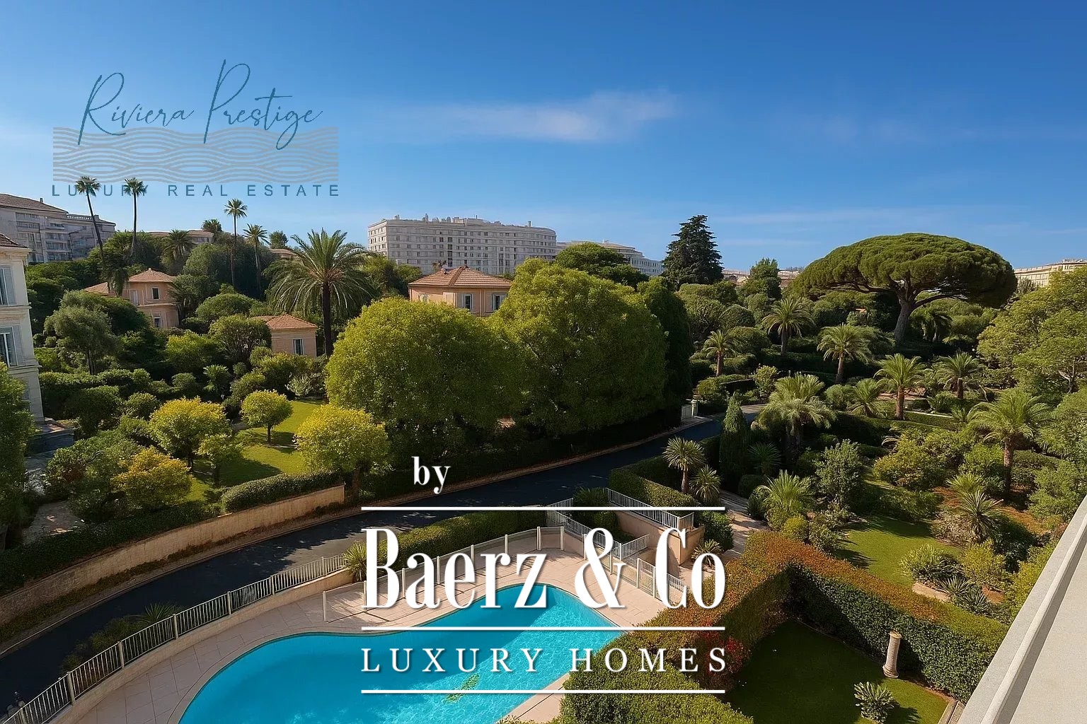 Residents enjoy discreet amenities, including air-conditioning, double glazing, internet, electric shutters, and a security door. The landscaped gardens and swimming pool of the residence impart a sense of respite, while two basement parking spaces and twin cellars address practical requirements. For those seeking a luxury apartment for sale in Cannes, this property balances comfort, privacy, and timeless views.