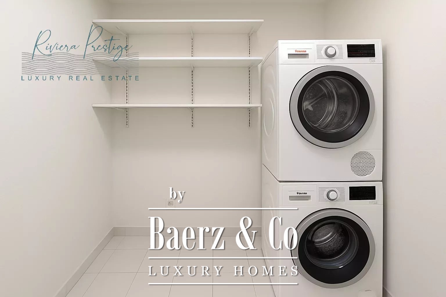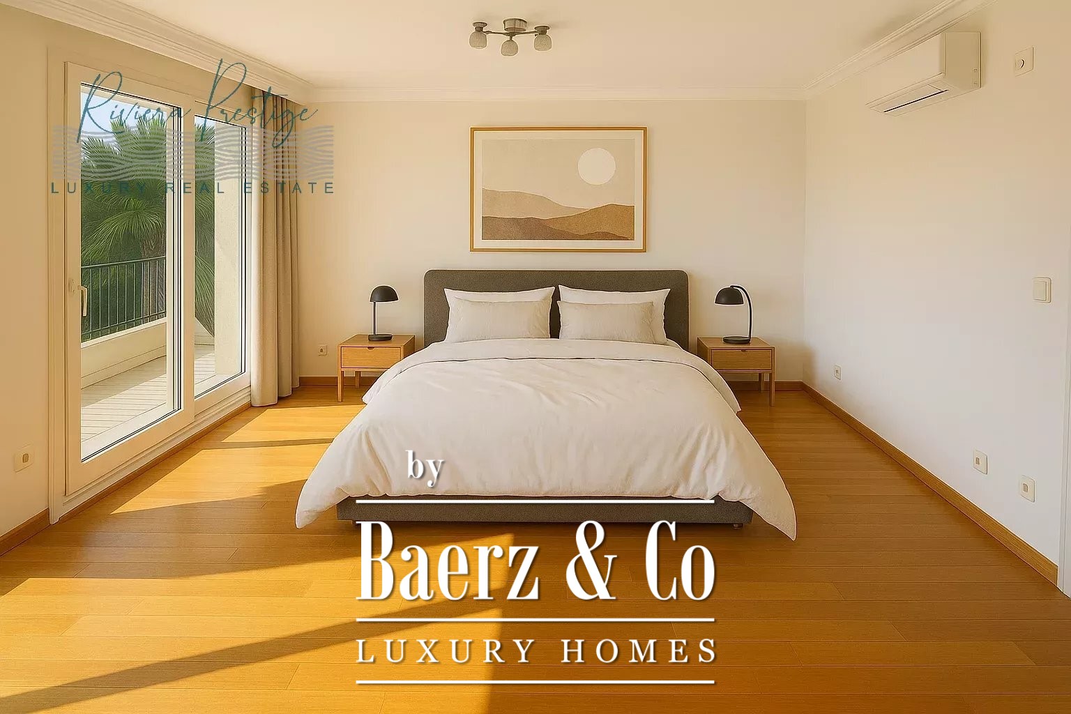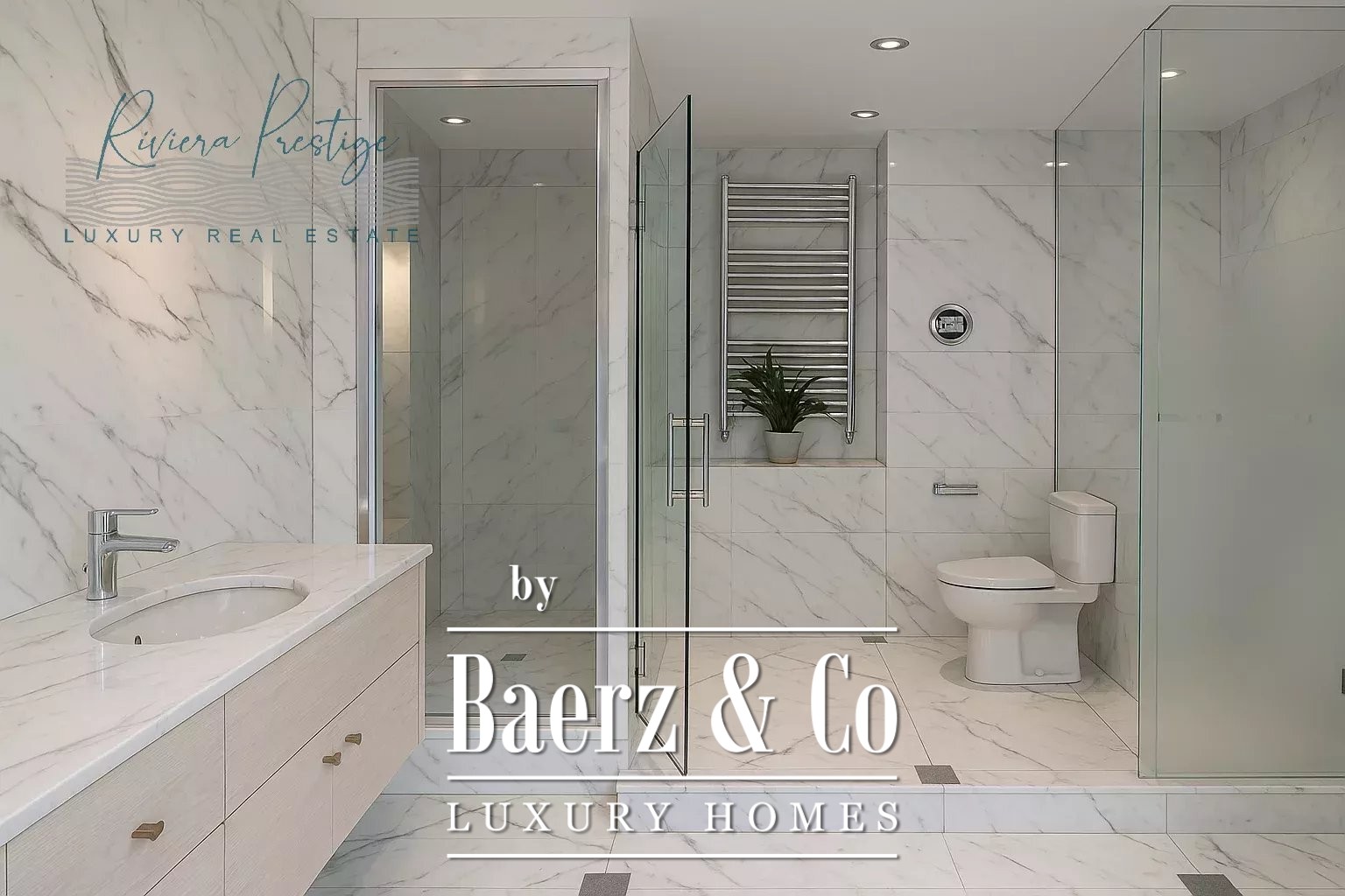 Beyond the panoramic terrace, the layout balances privacy and openness. The 22 m² master suite offers a calm retreat with a hammam shower room, WC, and dressing area. Two further bedrooms, measuring 24 m² and 12 m², are complemented by a bathroom, guest WC, and a well-conceived fitted kitchen. There is also a laundry room with the option to add a shower room, lending adaptability to evolving needs.