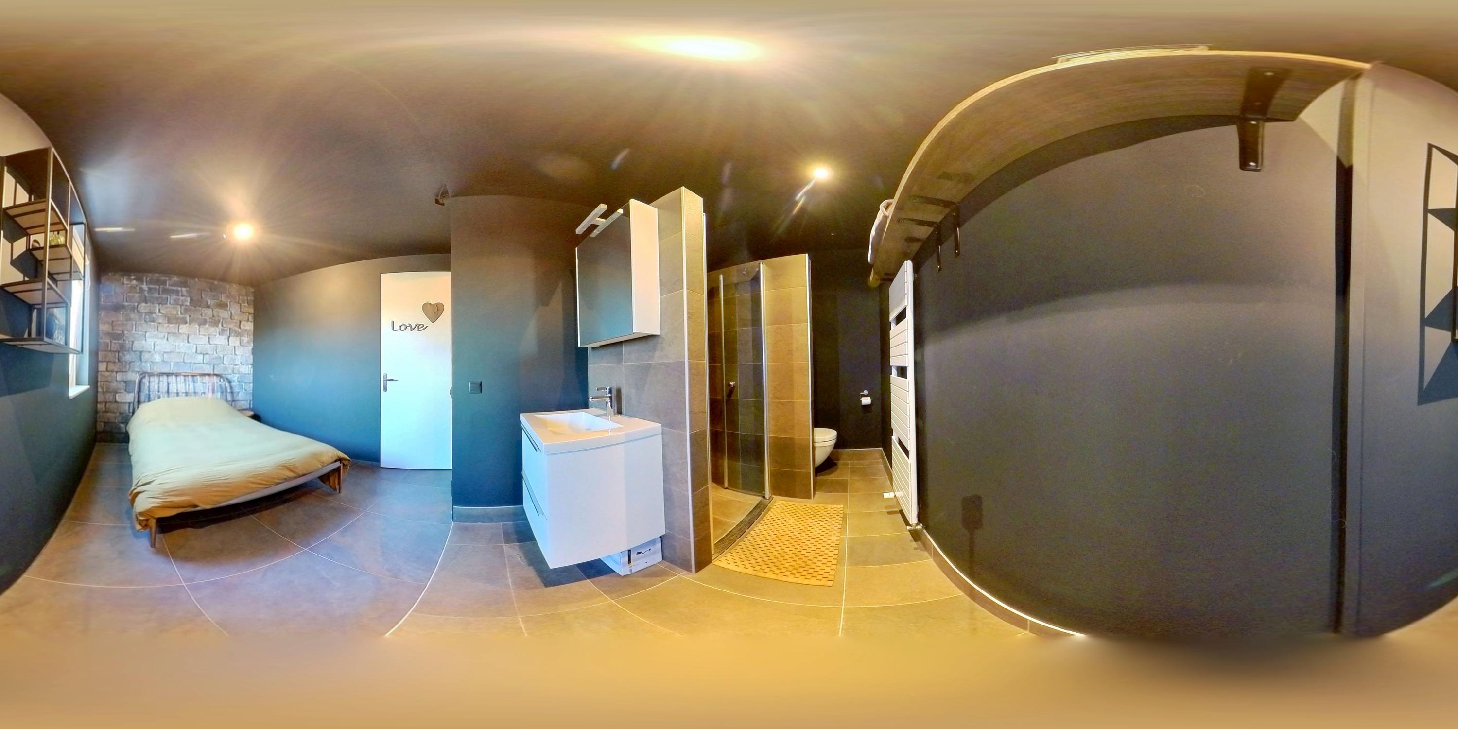 A connecting hallway leads to the second bedroom, also with an en-suite bathroom (walk-in shower, third toilet, sink unit, and designer radiator). Here you’ll also find the second main entrance to the penthouse.