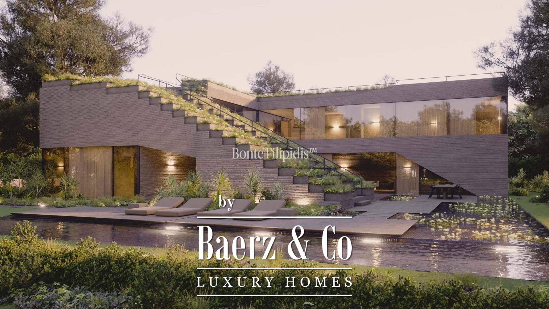 Multiple terraces frame a private black-tiled pool, outdoor lounges, and al fresco dining settings. Photovoltaic panels, recyclable steel, and certified wood signal a commitment to sustainable living, while home automation ensures comfort and peace of mind.