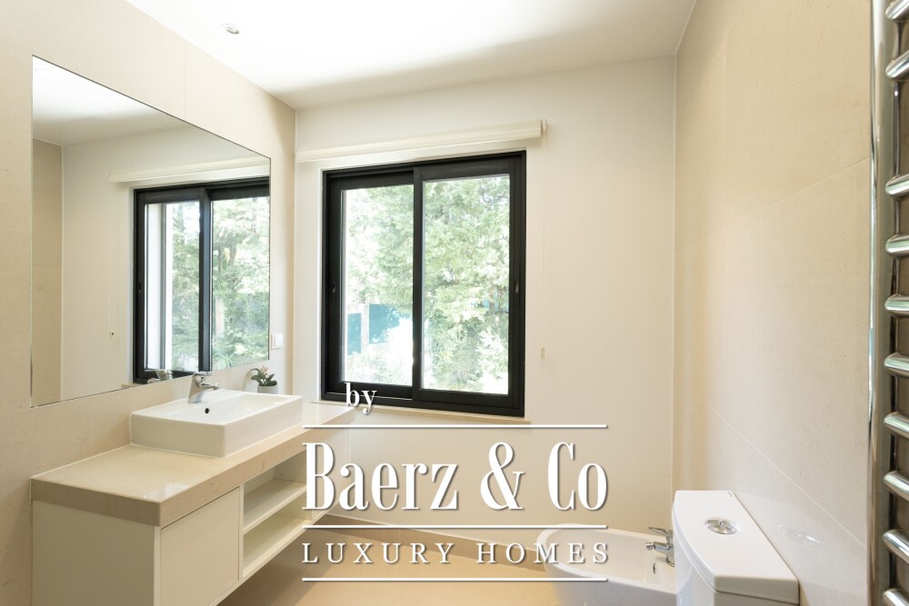 Ascending to the upper floor, four suite bedrooms offer privacy and calm, two opening onto terraces overlooking the garden and pool. The lower level introduces flexibility with a laundry and two adaptable rooms suited for study, leisure, or media. Outdoors, the private pool and landscaped garden set the pace for relaxed afternoons or discreet entertaining, accompanied by ample space for barbecue and parking.