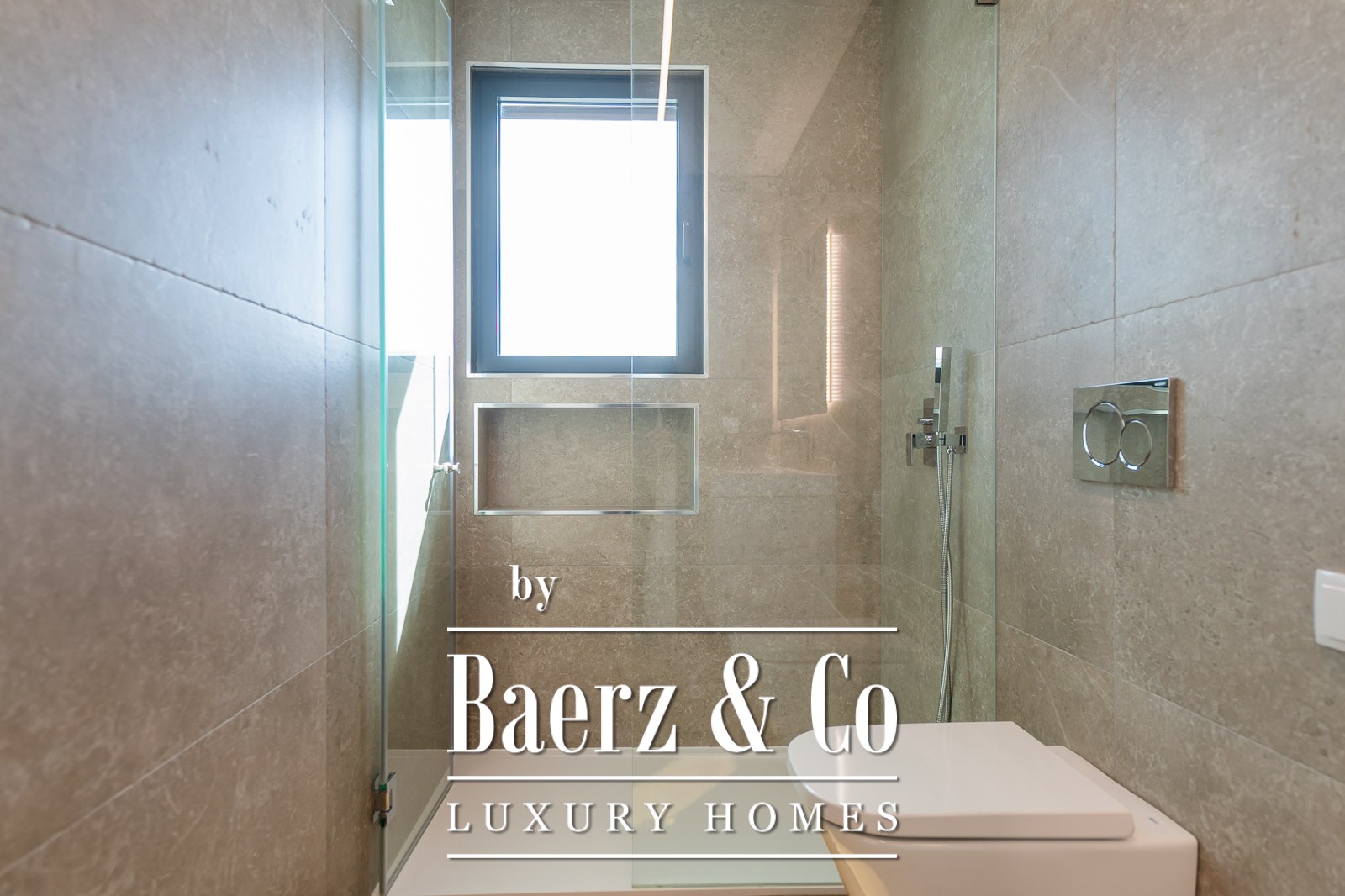 At the heart of the villa, an open plan living and kitchen area extends across 51 m², bathed in light and linking directly to a landscaped garden and a heated swimming pool. The kitchen is fully equipped with Bosch appliances, reflecting a commitment to discreet performance. Underfloor heating on the first and second floors, electric shutters, a central vacuum system and a security installation support seamless living.