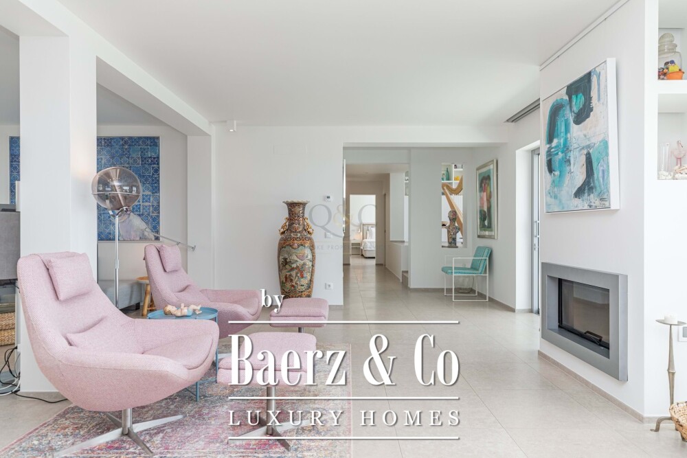 In the grounds, landscaped dry gardens with mature olives, palms, and architectural flora create a visually soothing backdrop, enhanced by sustainability features such as solar panels and automatic irrigation. The estate is secured by electric gates, security alarm, and CCTV, while amenities such as a pool, air conditioning, domotic systems, and bio-climatic pergola adapt the villa to both relaxation and entertaining.