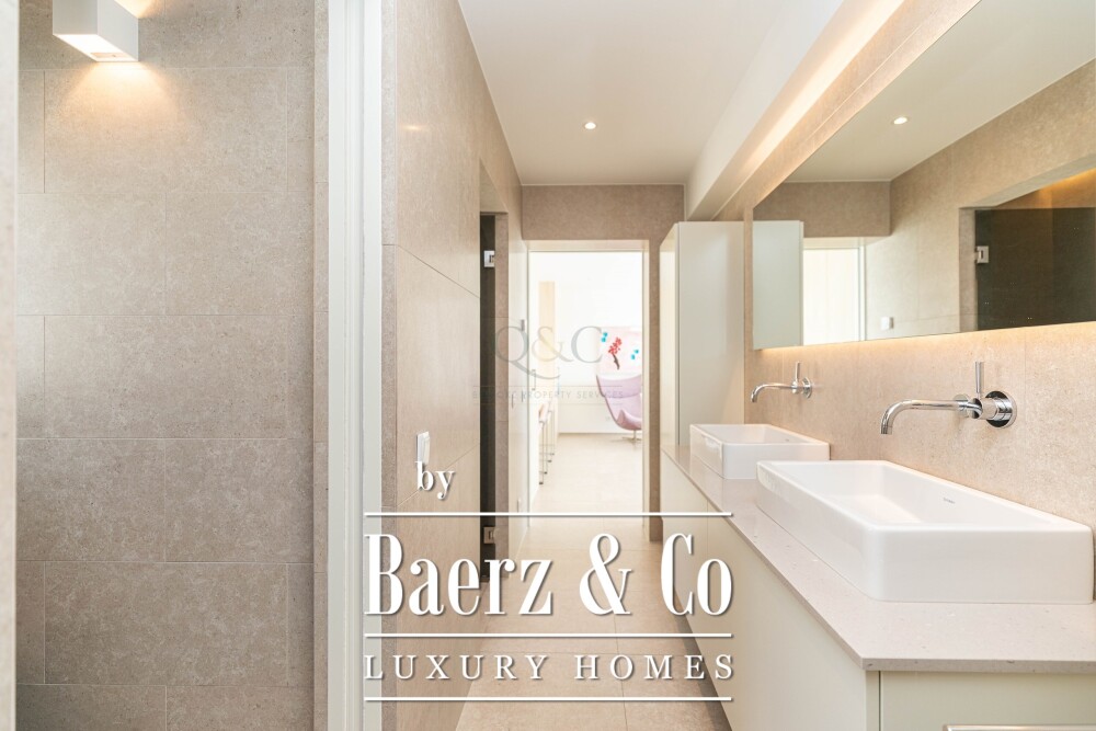 The master suite’s 55 m² footprint includes a tranquil sleeping space, spa-inspired bathroom, and tailored dressing room. Two further ensuite bedrooms on the garden level offer restful accommodation, with one opening onto the pool deck, the other, currently serving as a gym, revealing a private outdoor patio. Flexible living spaces provide options for a study, music lounge, or additional retreat, each benefitting from natural light and balcony access.