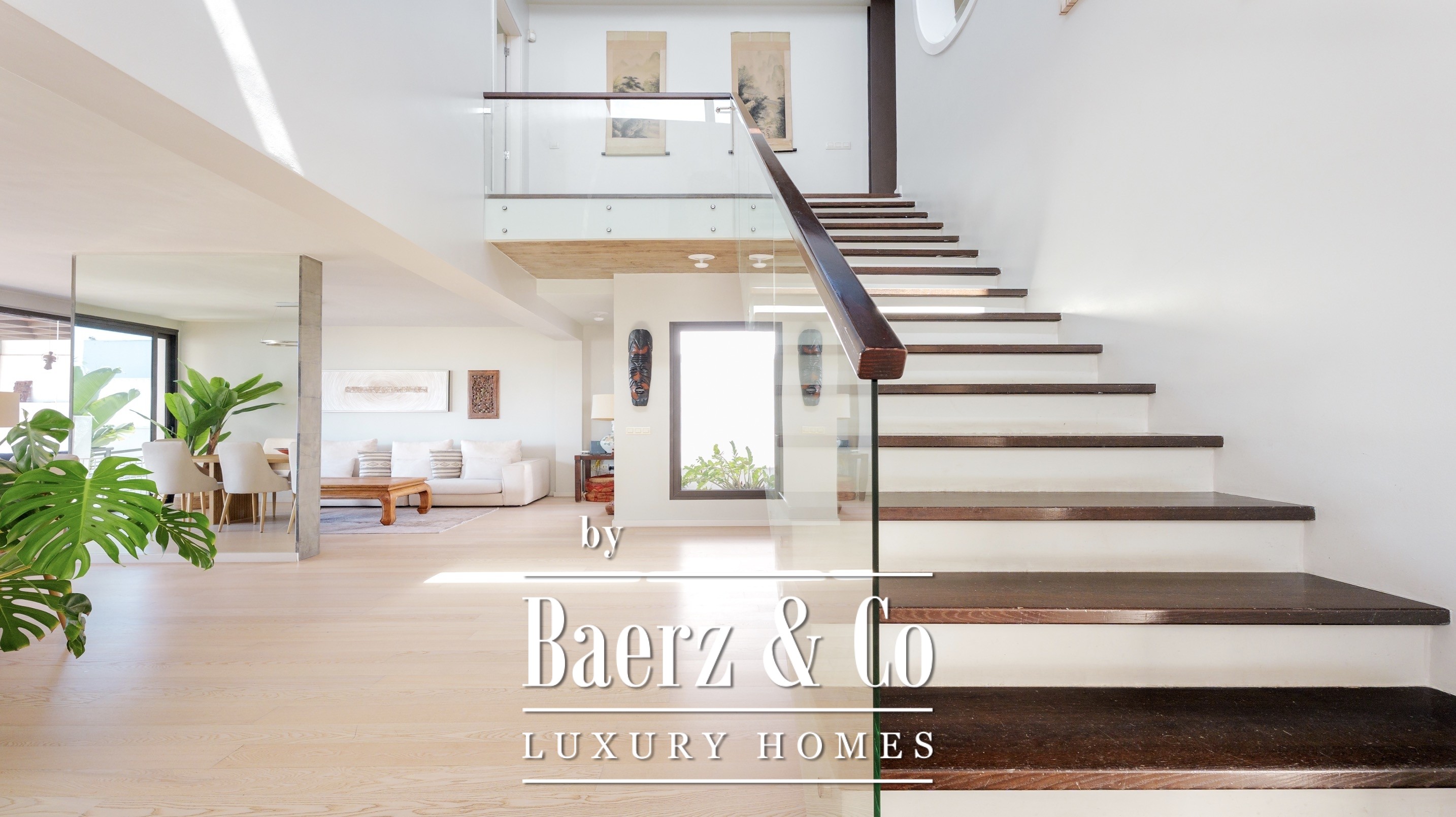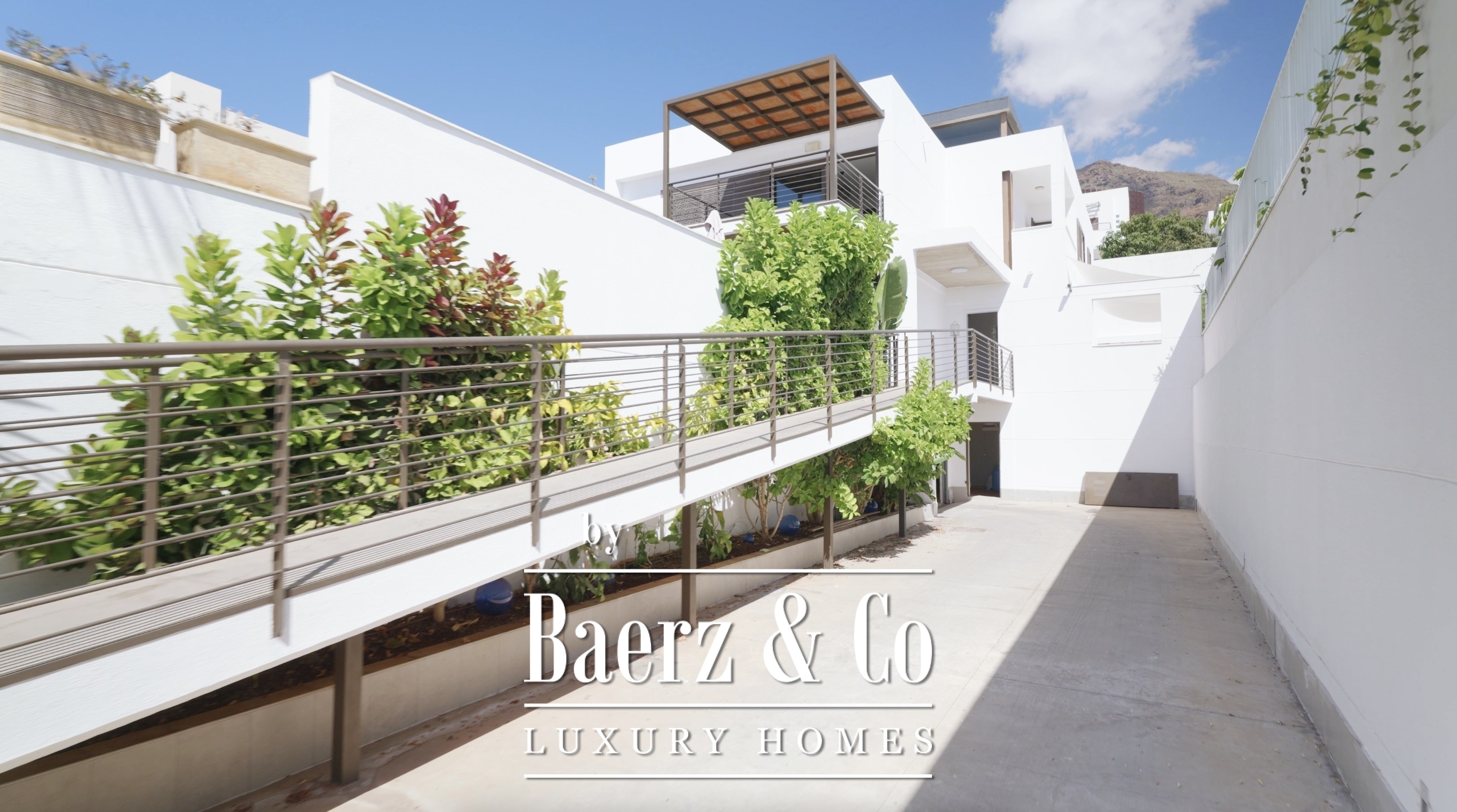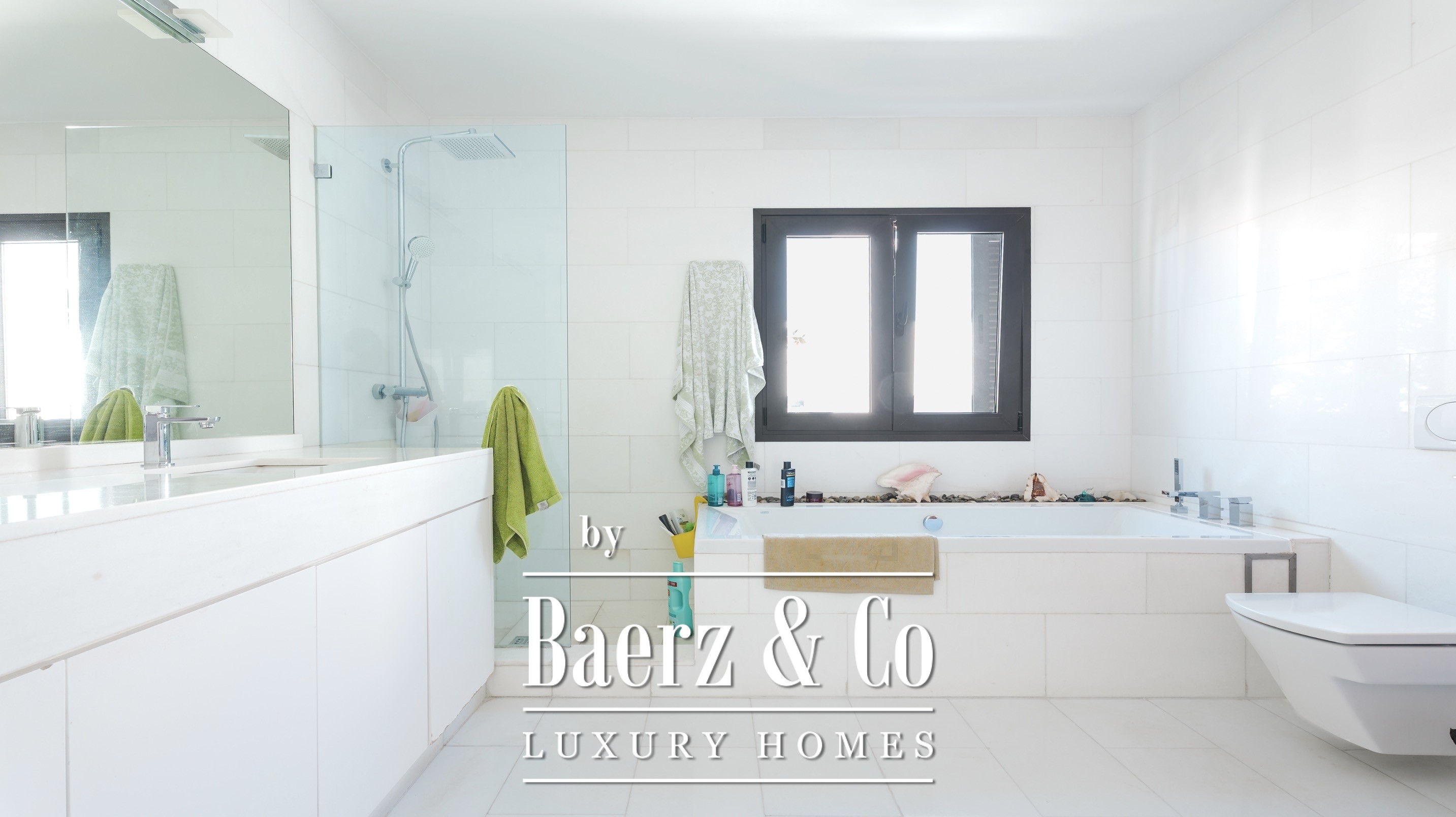 A private ramp leads to the main entrance, parallel to the garage access. Inside, the large living room with sea views is particularly striking, there is also an office with sea views, a guest toilet and a fully equipped separate kitchen with direct access to a large terrace and patio, ideal for al fresco dining.