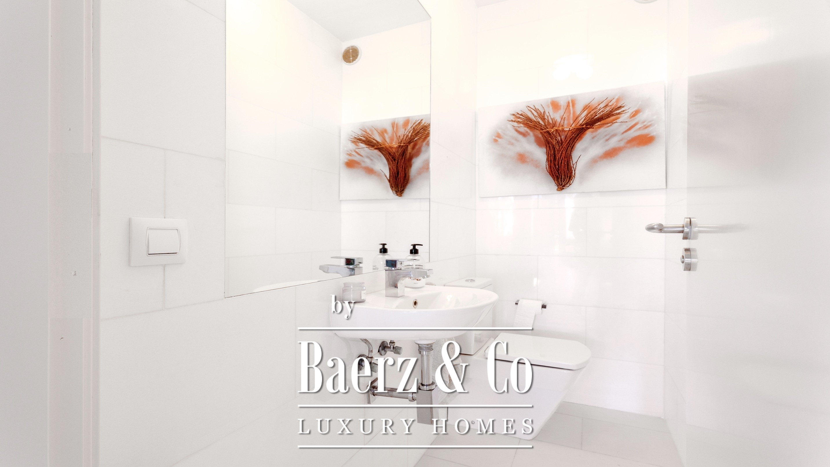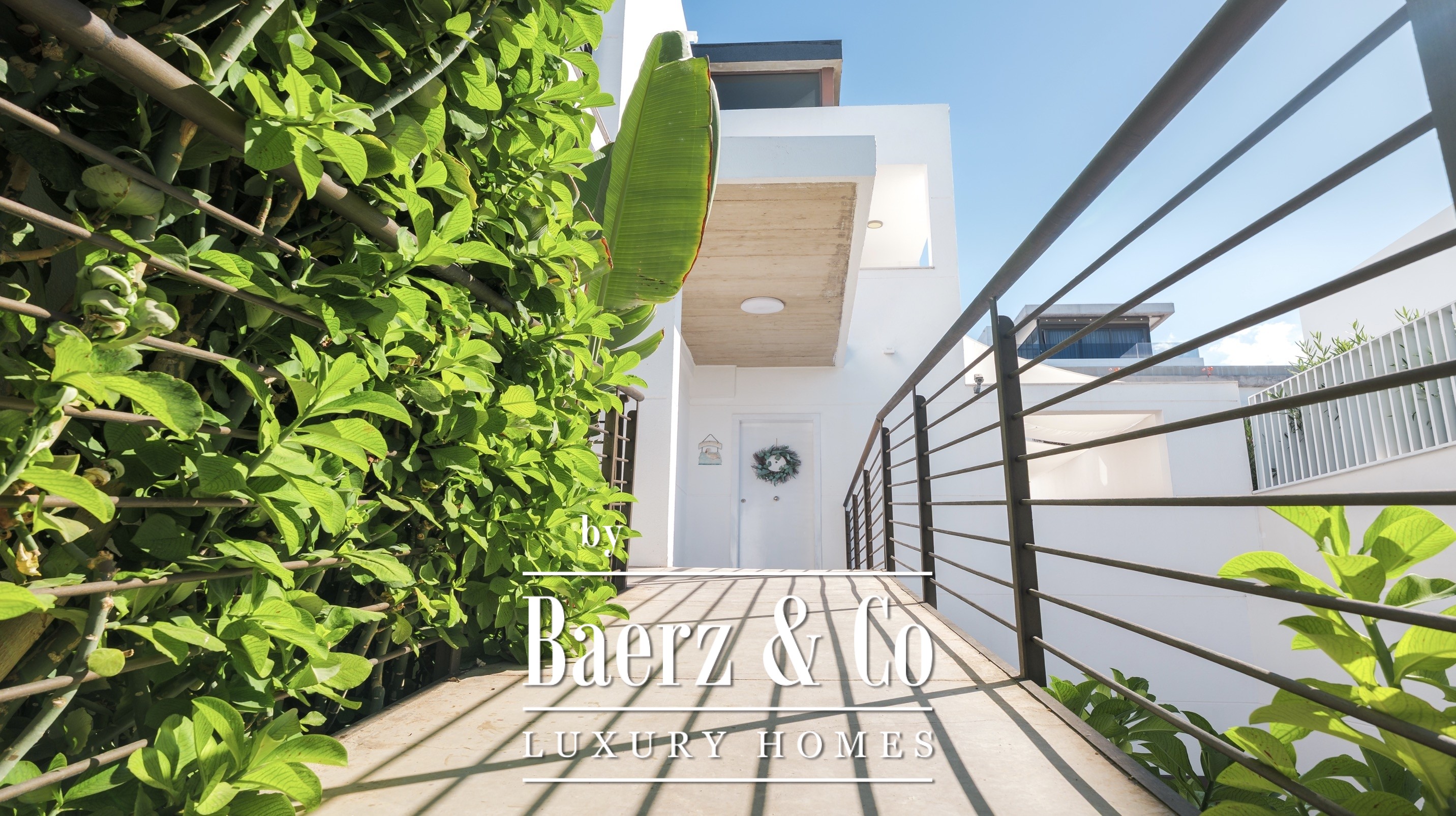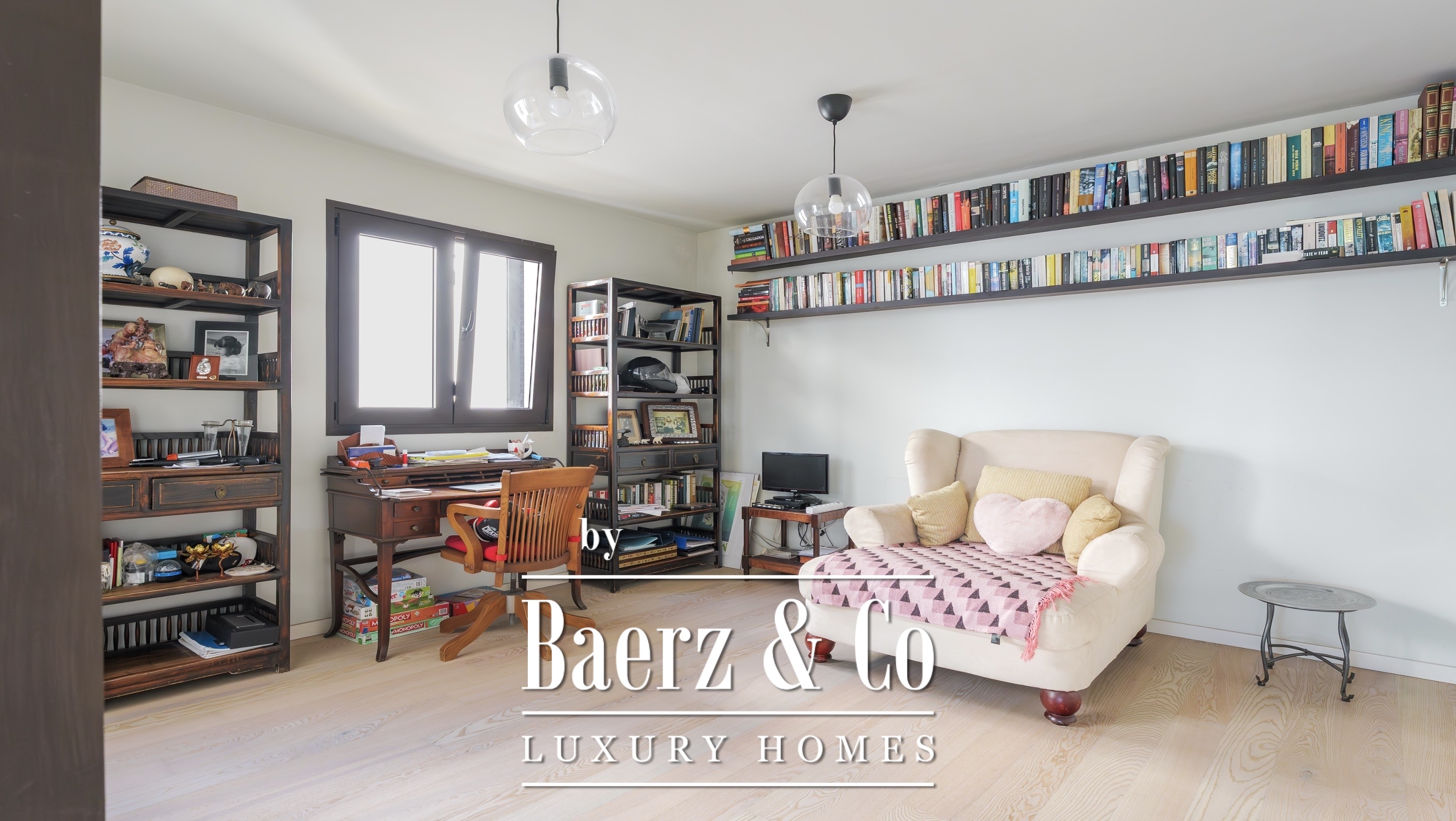 A private ramp leads to the main entrance, parallel to the garage access. Inside, the large living room with sea views is particularly striking, there is also an office with sea views, a guest toilet and a fully equipped separate kitchen with direct access to a large terrace and patio, ideal for al fresco dining.