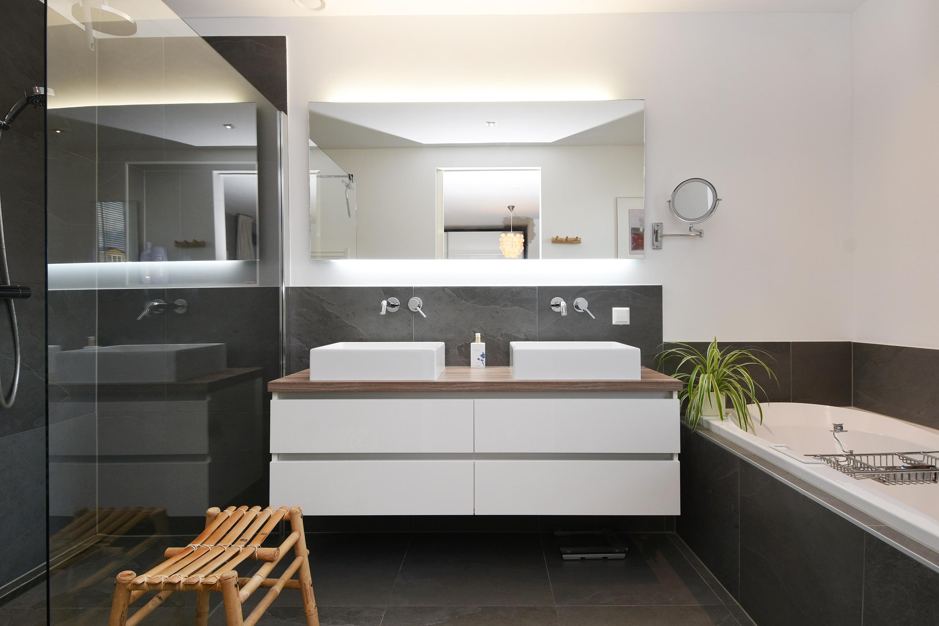 The hallway provides access to a utility room with space for a washing machine, dryer, freezer, etc., and to a luxurious toilet (wall-mounted) with washbasin. From here you also enter the master bedroom with an ensuite bathroom featuring a beautiful walk-in shower, bathtub and double washbasin with cabinet.