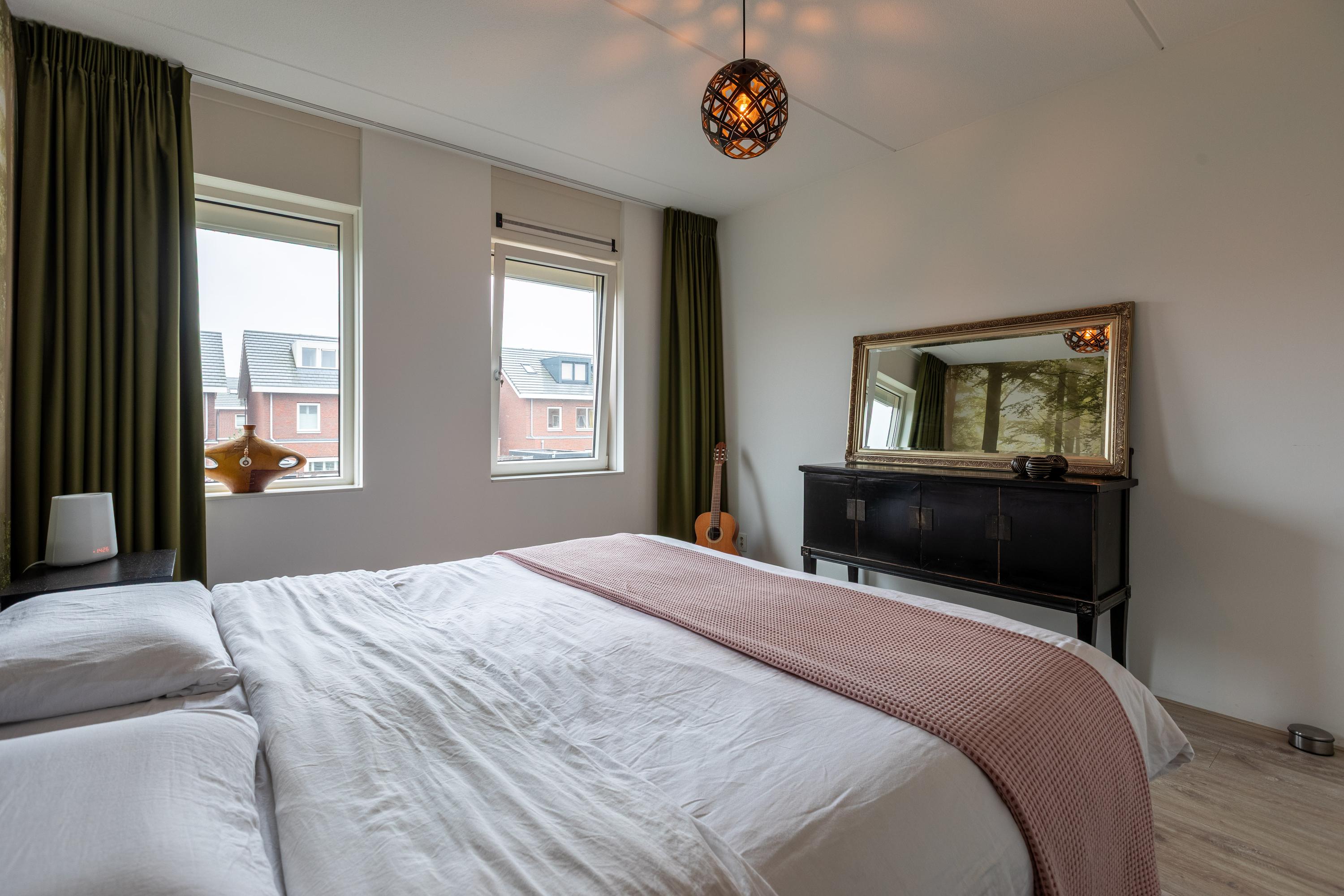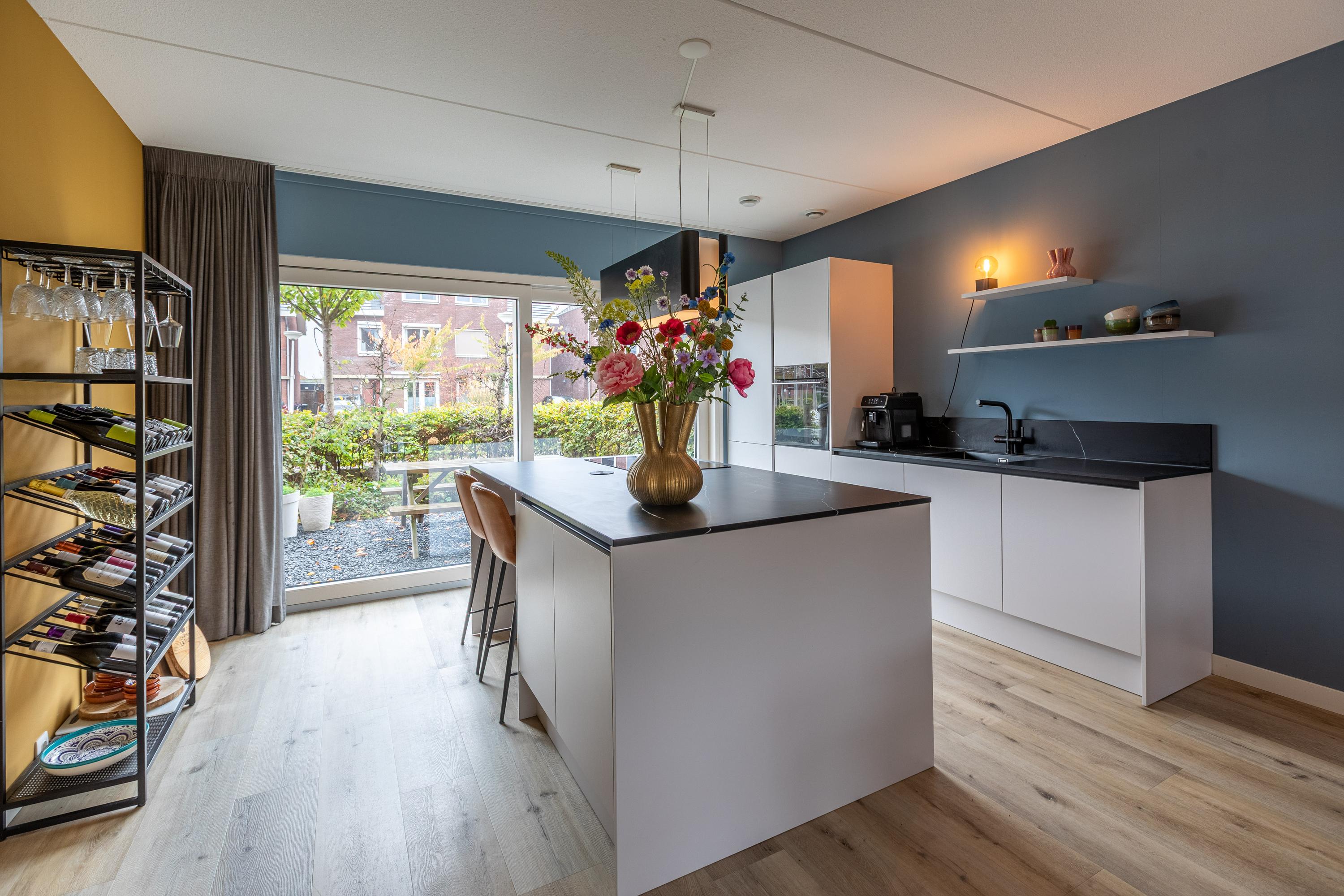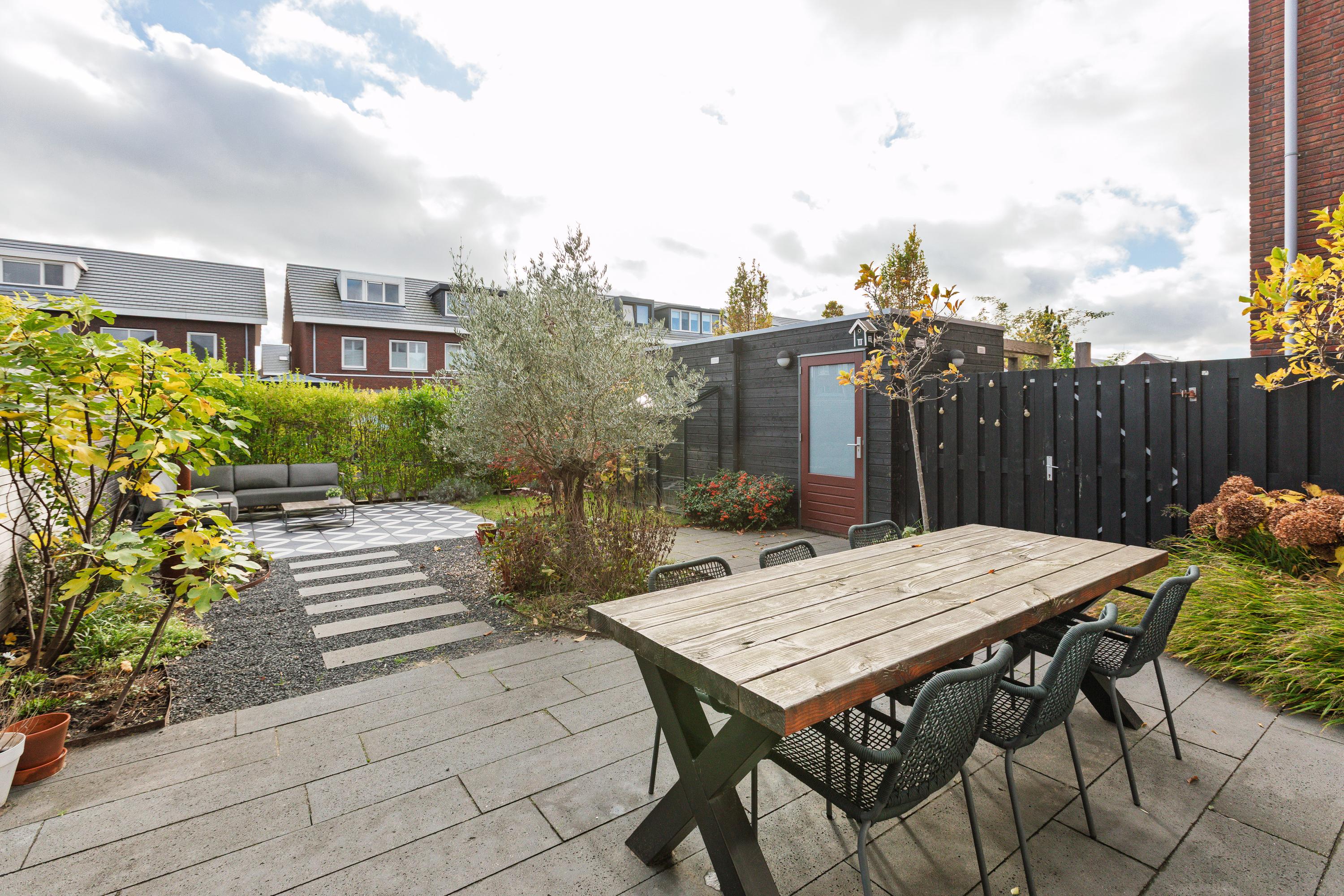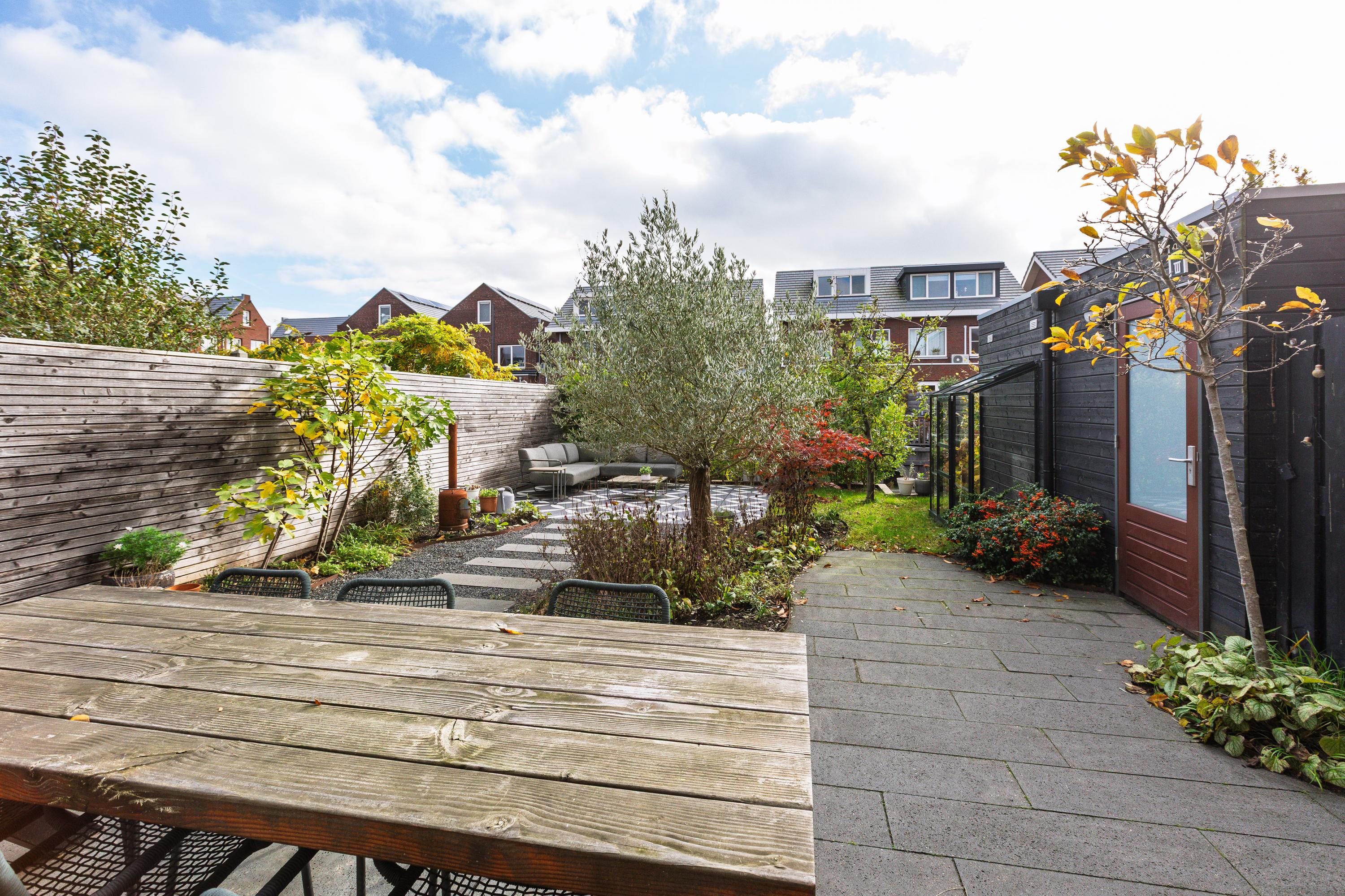 At the rear is the living area with a view of the beautifully landscaped garden. The living room is wide and offers enough space for a spacious sitting area. The sunny south-facing back garden has a large terrace, a greenhouse, a wooden shed and a jetty on the water. In summer, you can step right from your own garden onto your SUP board! The garden is also accessible via a back entrance along the house.