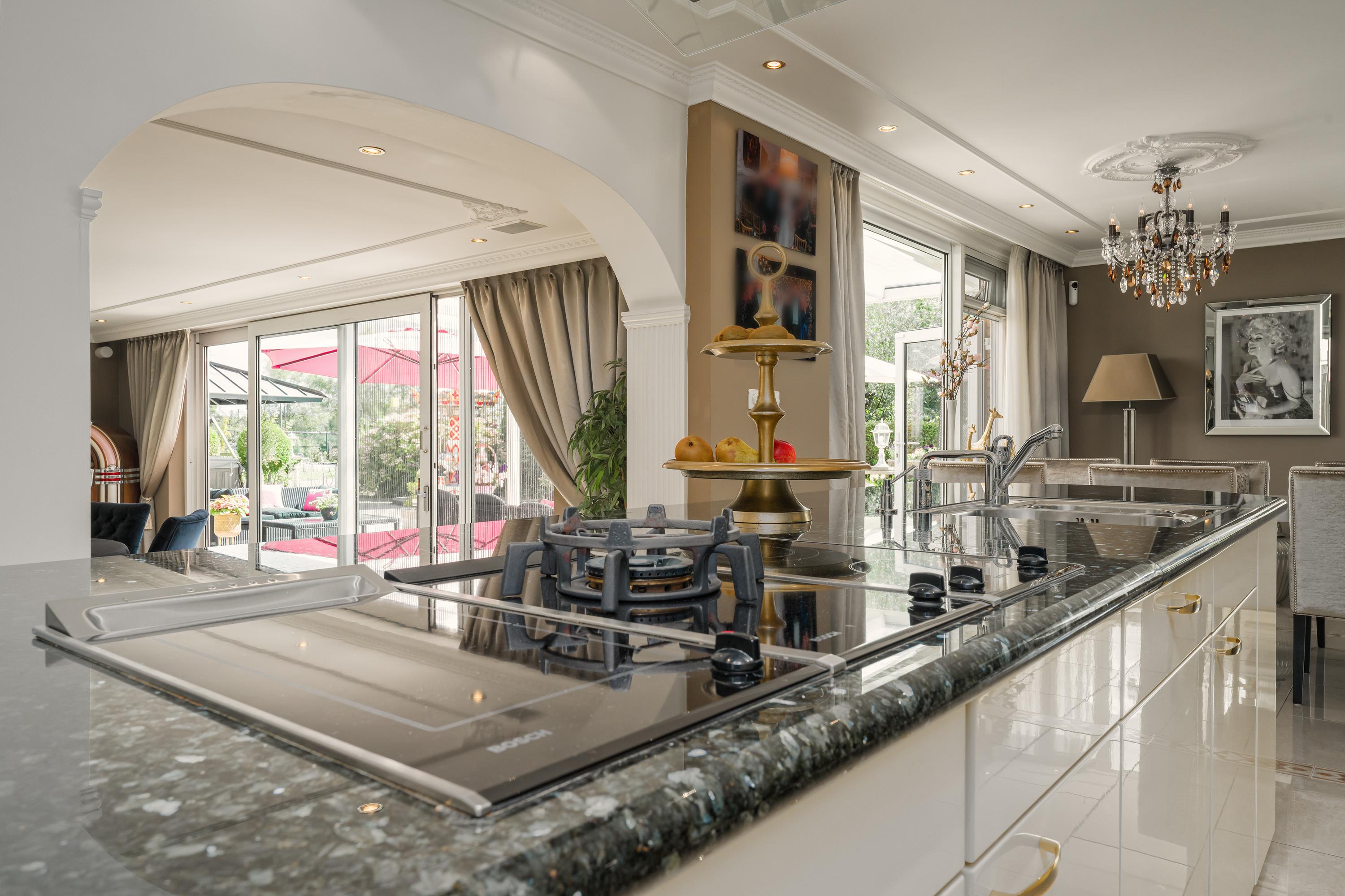 Layout: Ground floor: Side entrance, hallway, dining room adjacent to the garden/terrace, open kitchen with island, living room with bay window and fireplace, utility room, bathroom 1, staircase to the first floor. Master bedroom with open second bathroom, passage to the spacious wellness area with sauna and wardrobes. Both the master bedroom and the wellness area have access to the garden through large sliding doors.