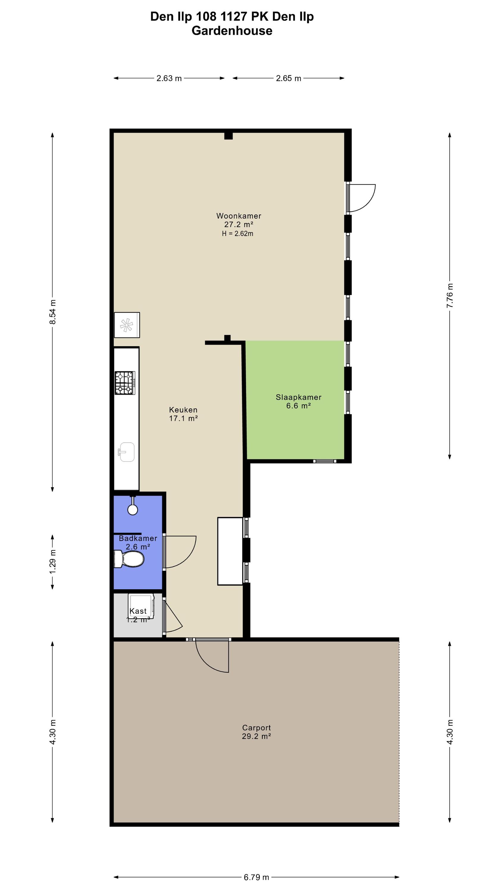 Guesthouse: Side entrance under the double carport, open kitchen, shower, living room, bedroom.